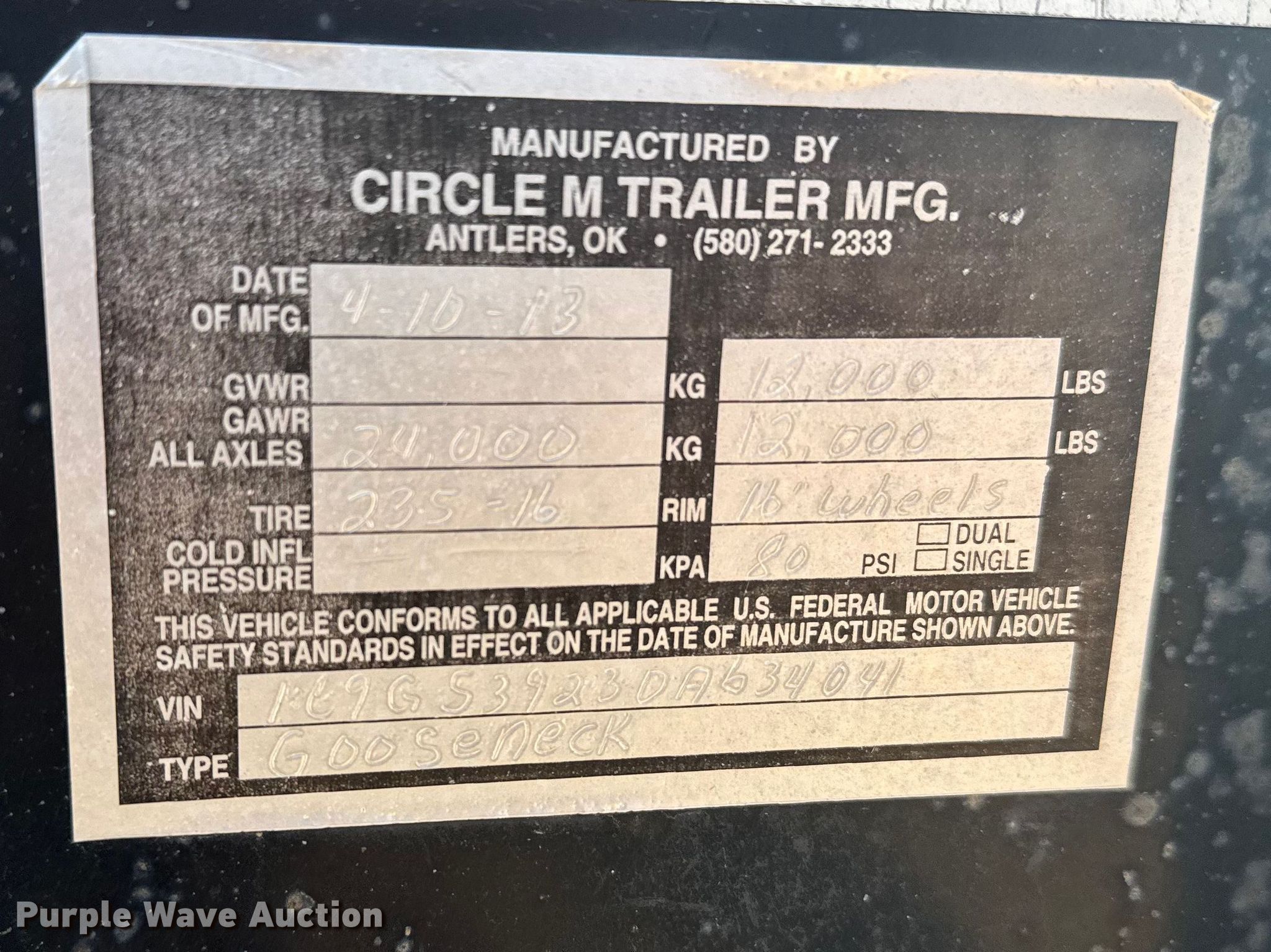 2013 Circle M equipment trailer. VIN: 1C9GS3923DA634041. Dimensions Overall Length: 48', Width: 101", Deck Length: 35', Width: 101", Tail length: 5', Ramps: Manual Length: 5'. Chassis Hitch: Gooseneck, Landing gear: Dual, Suspension: Spring, Brakes: Electric, Axles: Tandem, GVWR: 24,000 lbs. Tires Steel wheels, Size: 225/90R16. Kansas title. Title distribution may be delayed up to 30 days from verification of funds. Russell, KS 67665