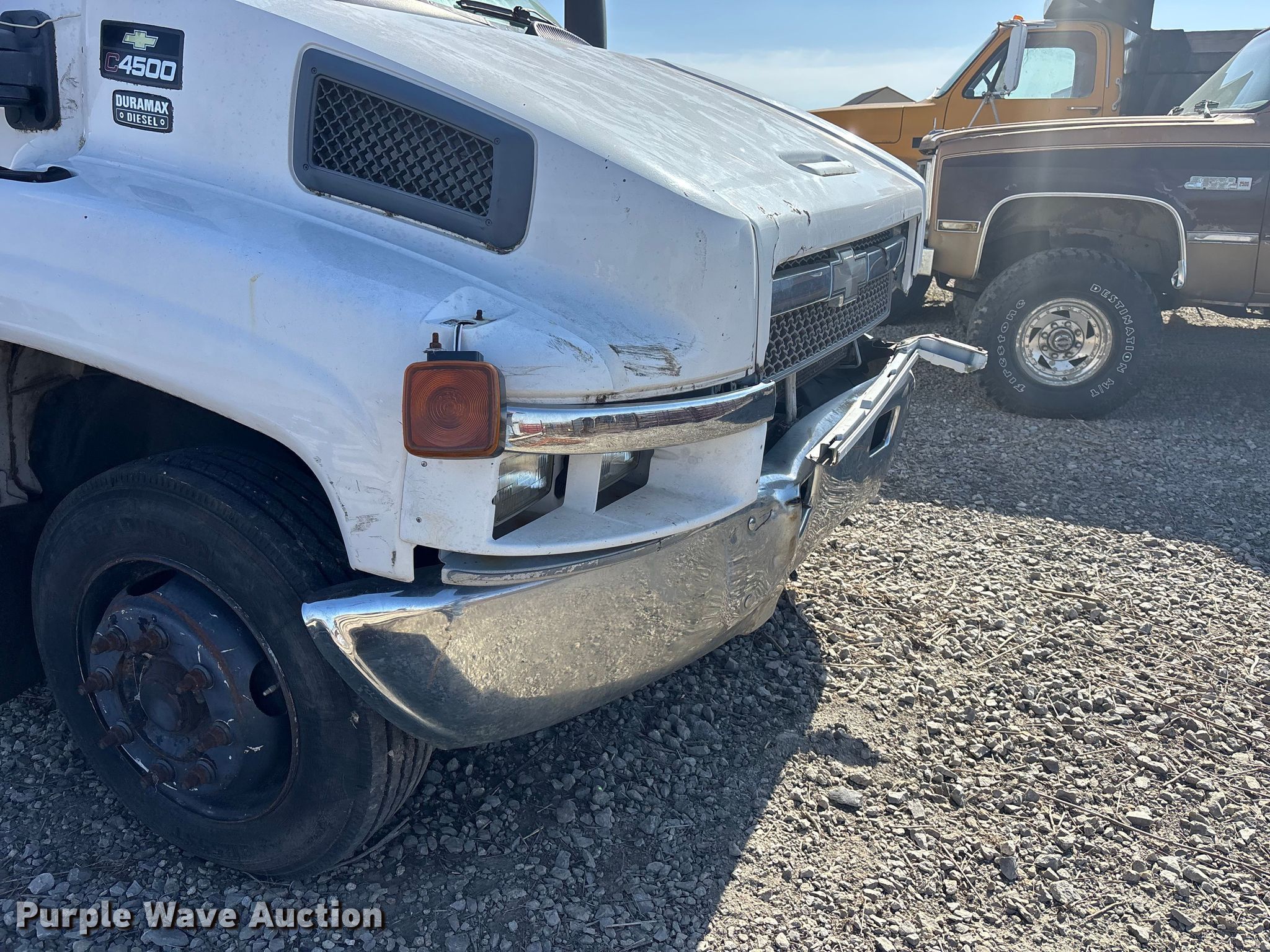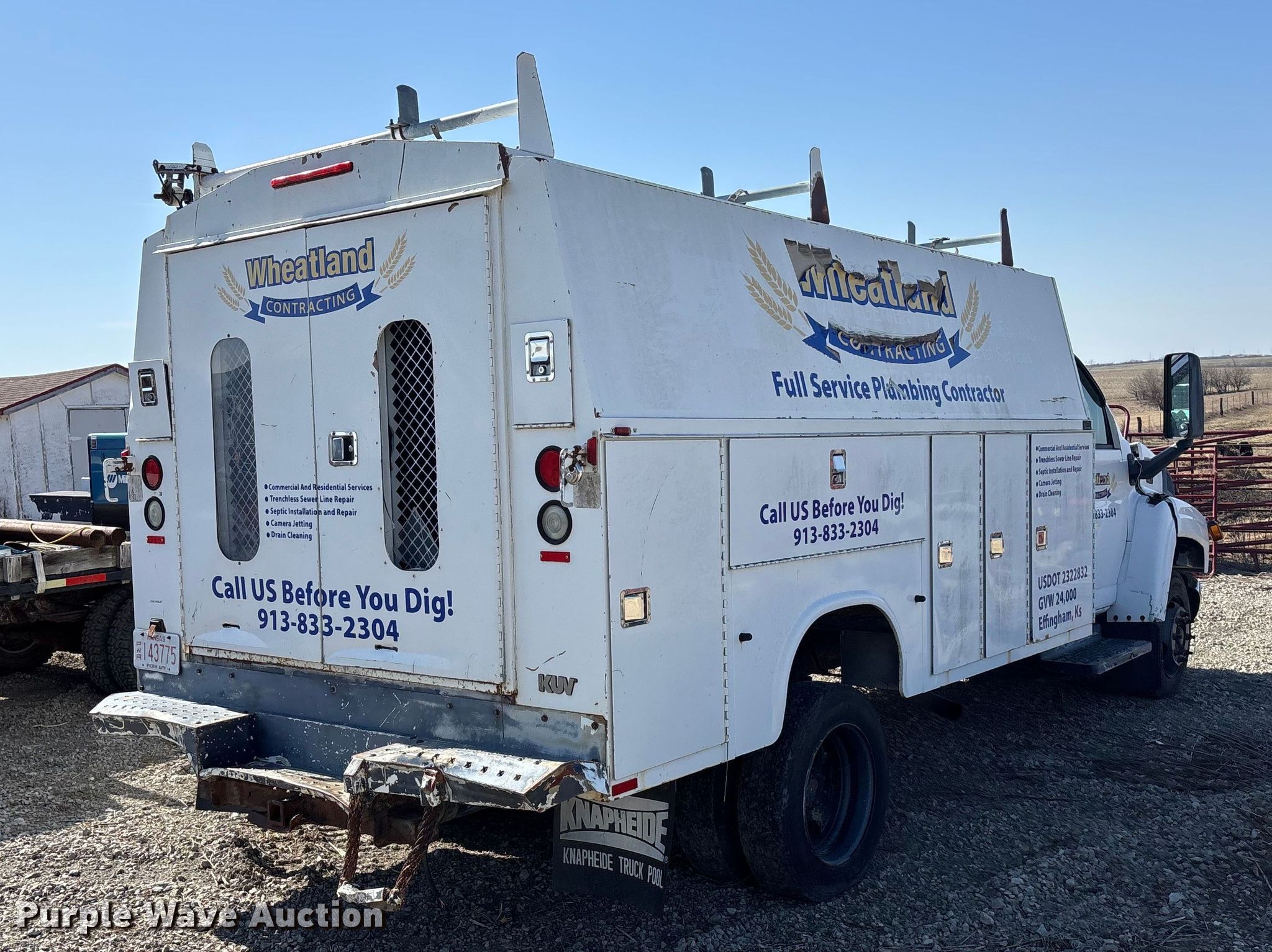 2005 Chevrolet C4500 utility / service truck. Miles: 222,170 on odometer, VIN: 1GBE4V1275F520986. Engine Displacement: 6.6L, Cylinders: 8, Fuel type: Diesel. Transmission Automatic. Interior AC, Heat, Cruise control, Brake controller. Features Bed Utility bed, Knapheide KUV, Length: 13' 6", Width: 96". Tires Size: 225/70R19.5. Notes Windshield chipped or cracked, Non-operational service bed doors, Non-operational engine , Collision damage , Unit must be towed or hauled , Non-operational unit. Kansas title. Title distribution may be delayed up to 30 days from verification of funds. Wheatland Contracting. Effingham, KS 66023