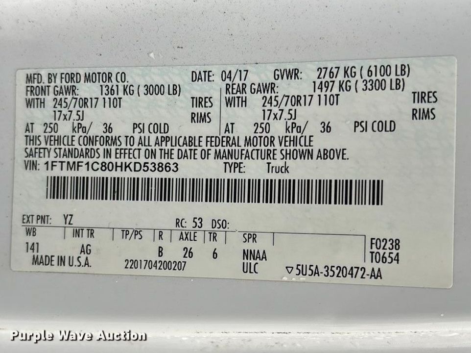 2017 Ford F150 pickup truck. Miles: 258,070 on odometer, Hours: 7,550 on meter, VIN: 1FTMF1C80HKD53863. Engine Displacement: 3.5L, Cylinders: 6, Fuel type: Gas. Transmission Automatic. Interior AC, Heat, Power windows, Power locks, Cruise control, Brake controller. Tires Size: LT245/70R17. Notes Dash warning indicator: Check engine, Jump start required during on-site data collection, Possible mechanical issues. Missouri title. Seller is a Missouri licensed motor vehicle dealer. The buyer may be required to pay sales tax and/or registration fees to the dealer prior to taking possession. Buyers may be required to provide identification to the licensed dealer to comply with state laws. Title will be assigned and distributed by the dealer. Please contact the seller for distribution questions. Federal Protection, Inc.. Springfield, MO 65803