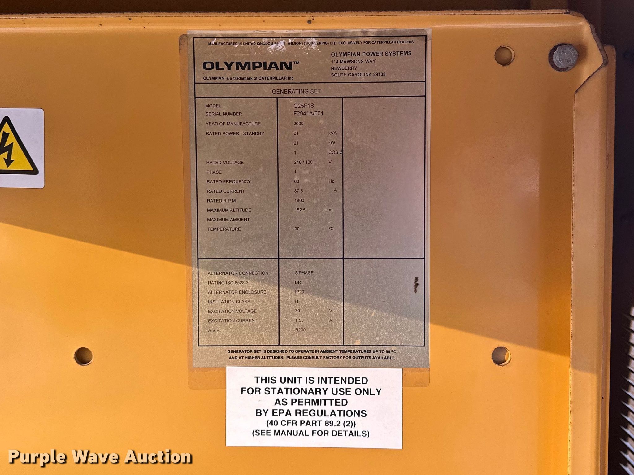 This 2000 Caterpillar G25F1S generator will sell to the highest bidder regardless of price.