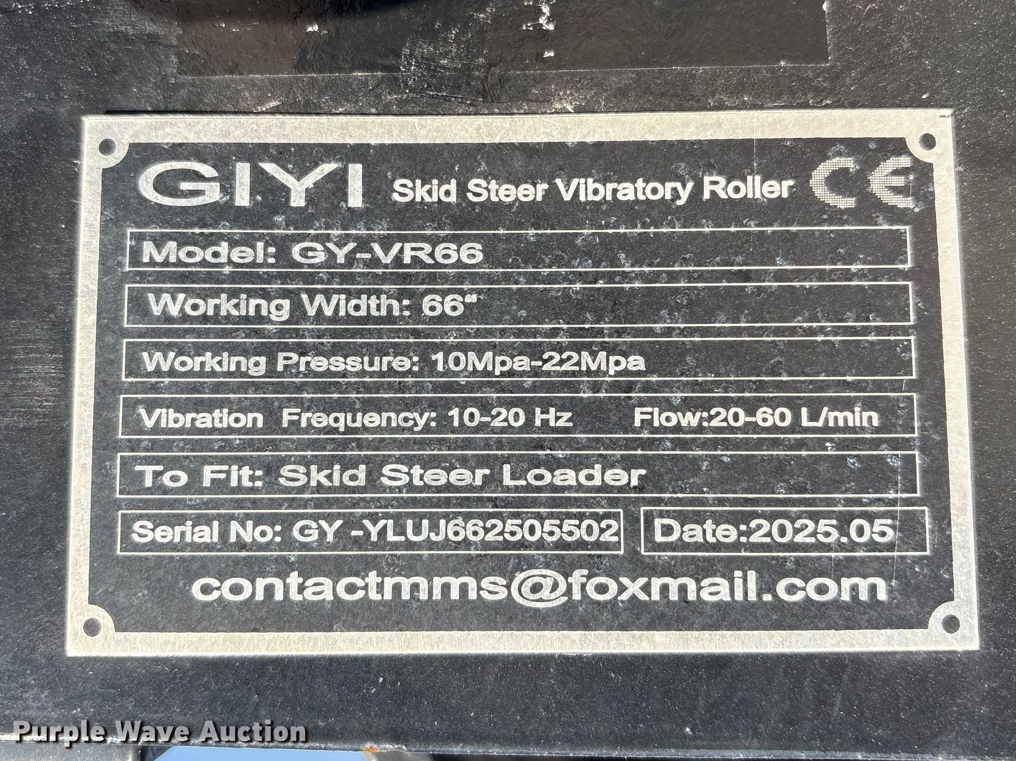 Purple Wave is selling a used Skid Steer Attach. in Nebraska. This item is a 2025 Giyi GY-VR66 skid steer vibratory roller with the following: Serial: GY-YLUJ662505502, Width: 64"