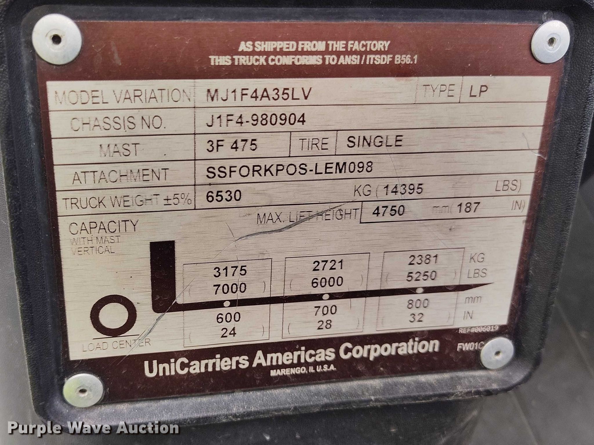 2015 Nissan PF80 forklift. Hours: 4,369 on meter, Serial: J1F4-980904, Unit #: SFS3111. Engine GCT TB45L, Displacement: 4.5L, Cylinders: 6, Fuel type: LPG LP bottle: Not included. Transmission Automatic. Operators station OROPS. Features Maximum lift capacity: 7,000 lbs, Maximum lift height: 187", Collapsed mast height: 89", Mast stages: 3, Side shift, Mast tilt, Fork positioner, Fork length: 47". Tires Front: 8.25-15/6.50, Rear: 7.00-12/5.00, Solid. Ferguson. Loveland, CO 80538