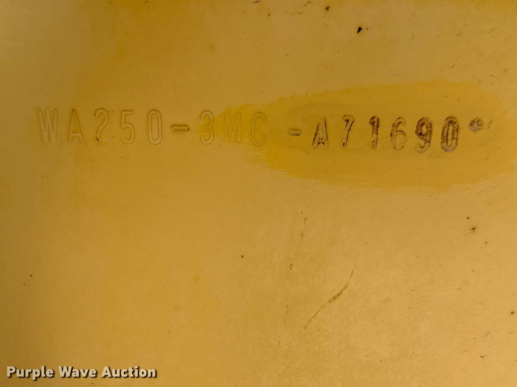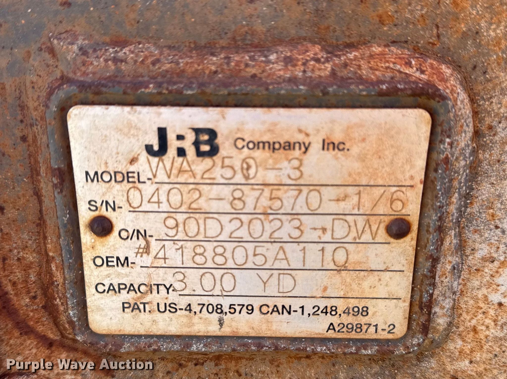 2002 Komatsu WA250 wheel loader. Hours: 268 on meter, Miles or hours may vary, unit still in use, Serial: WA250-3MC-A71699, Unit #: 50-11. Engine Komatsu S6D102E-1, Serial: 46207225, Displacement: 5.9L, Cylinders: 6, Fuel type: Diesel. Transmission Powershift, 4F - 4R. Operators station Enclosed cab, AC, Heat, Bucket controls: Joystick. Features Auxiliary hydraulics: Front, Bucket JRB WA250-3, Capacity: 3 cu.yd., Width: 105". Tires Size: 20.5-25. Notes Glass cracked. Manhattan Road & Bridge. Catoosa, OK 74015