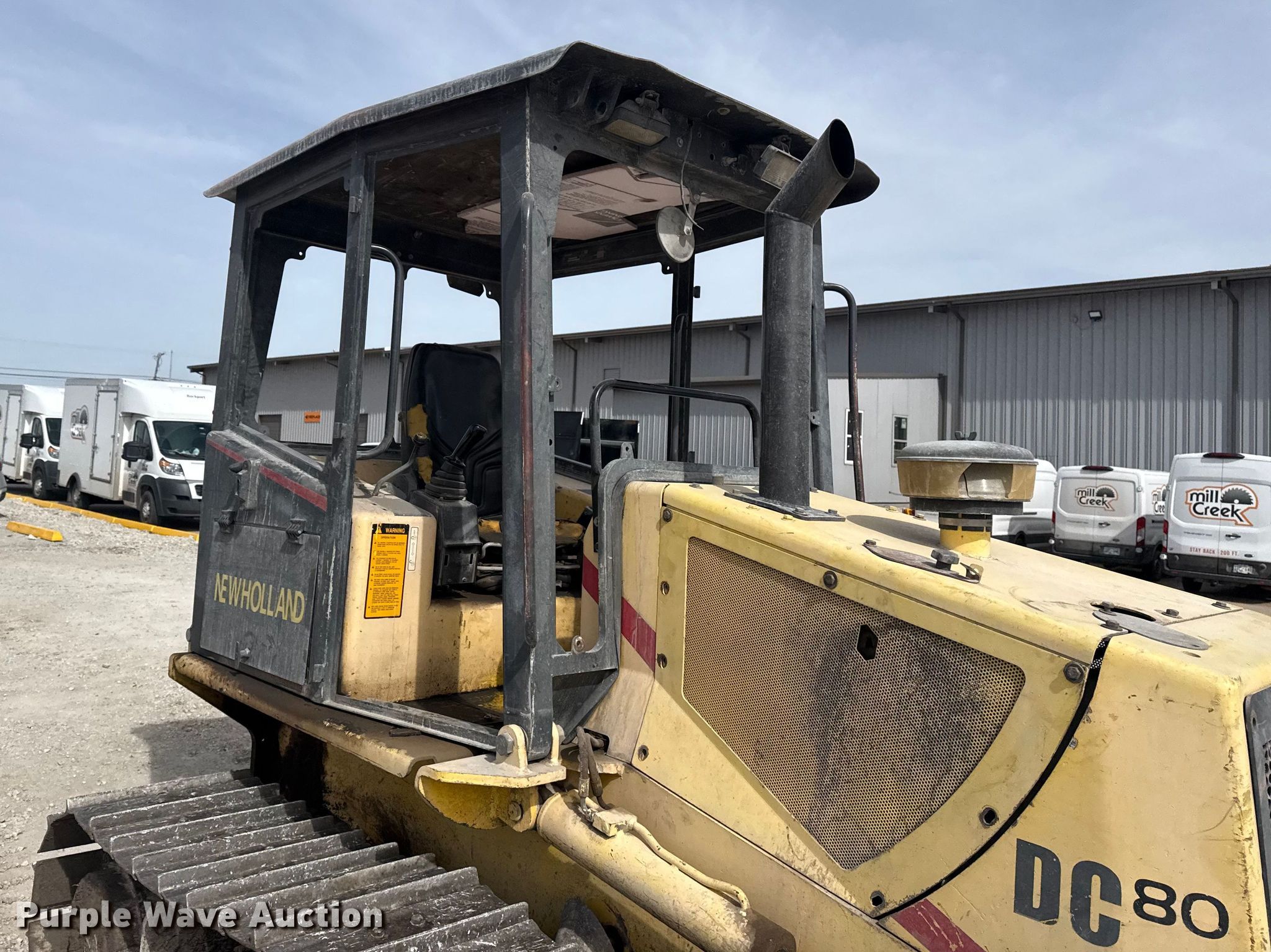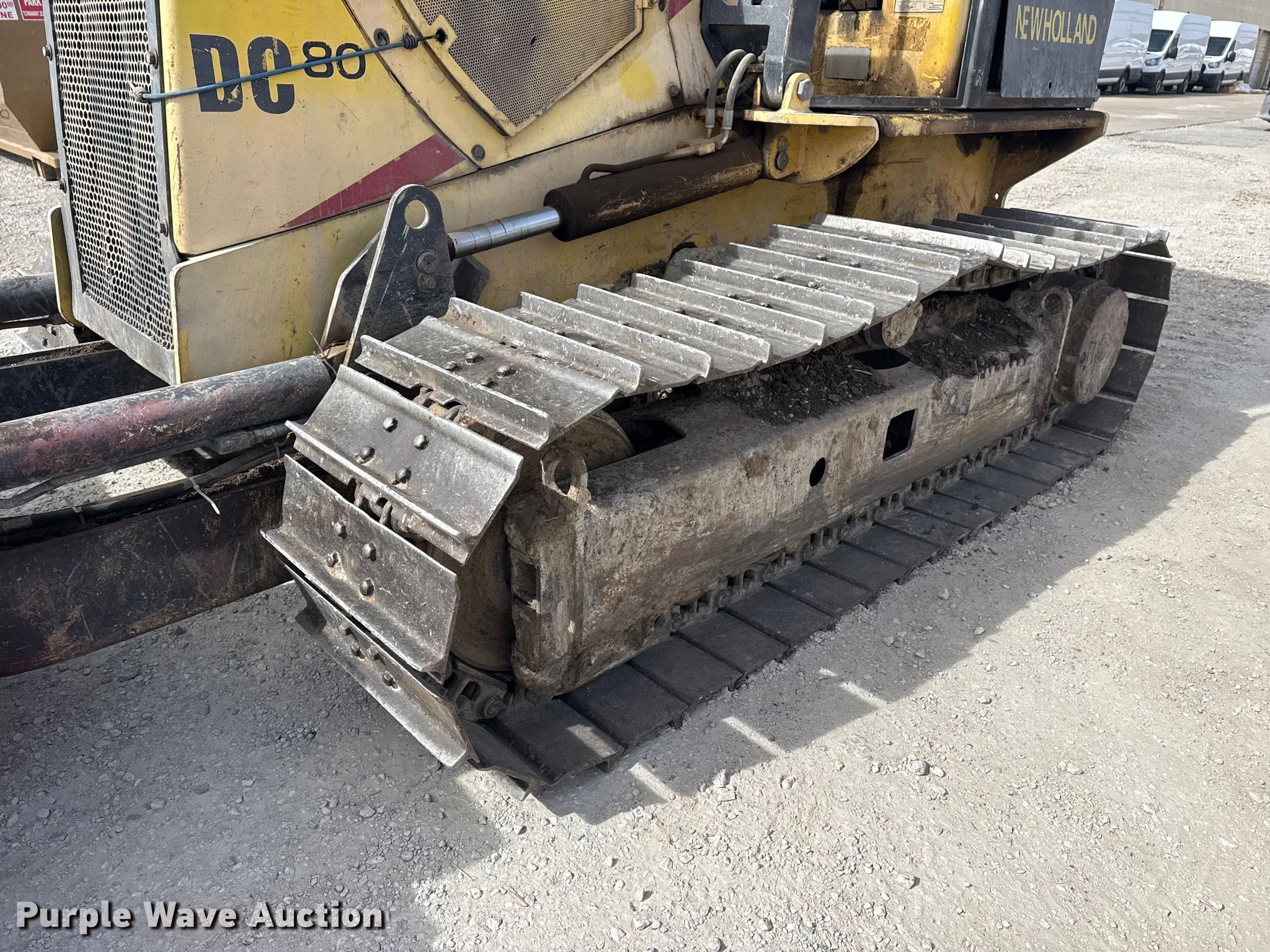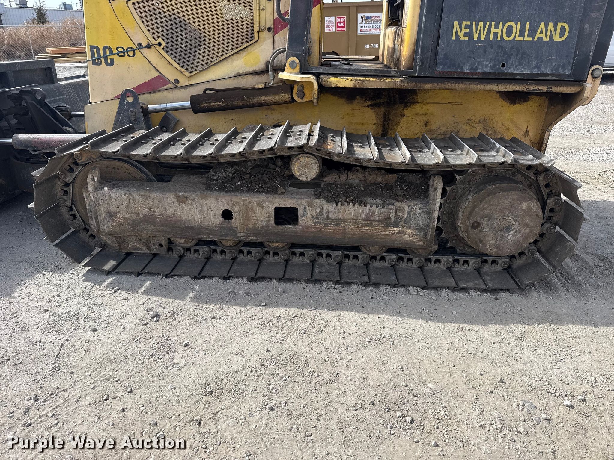 2001 New Holland DC80 dozer. Hours: 3,612 on meter, Serial: 13141176. Engine Cylinders: 4, Fuel type: Diesel. Transmission Hydrostatic. Operators station OROPS, Steering: Joystick. Features Dozer blade Blade type: 6-way, Blade shape: Straight, Width: 8' 11". Tracks Width: 29", Grouser pads: Single, Bottom rollers: 6. Notes Doors missing, Glass missing, Bottom left side roller missing. Mill Creek lumber & Supply. Tulsa, OK 74145