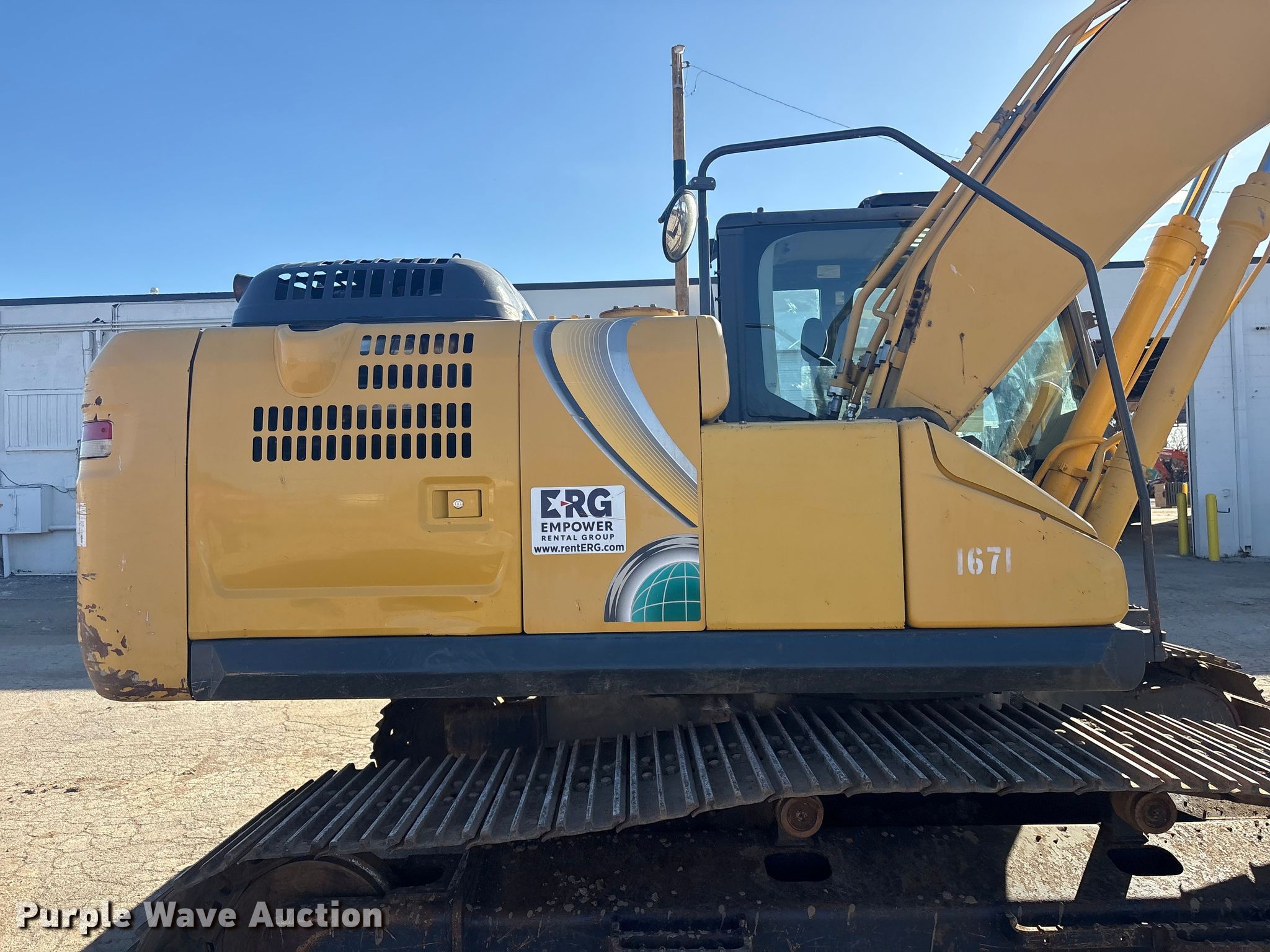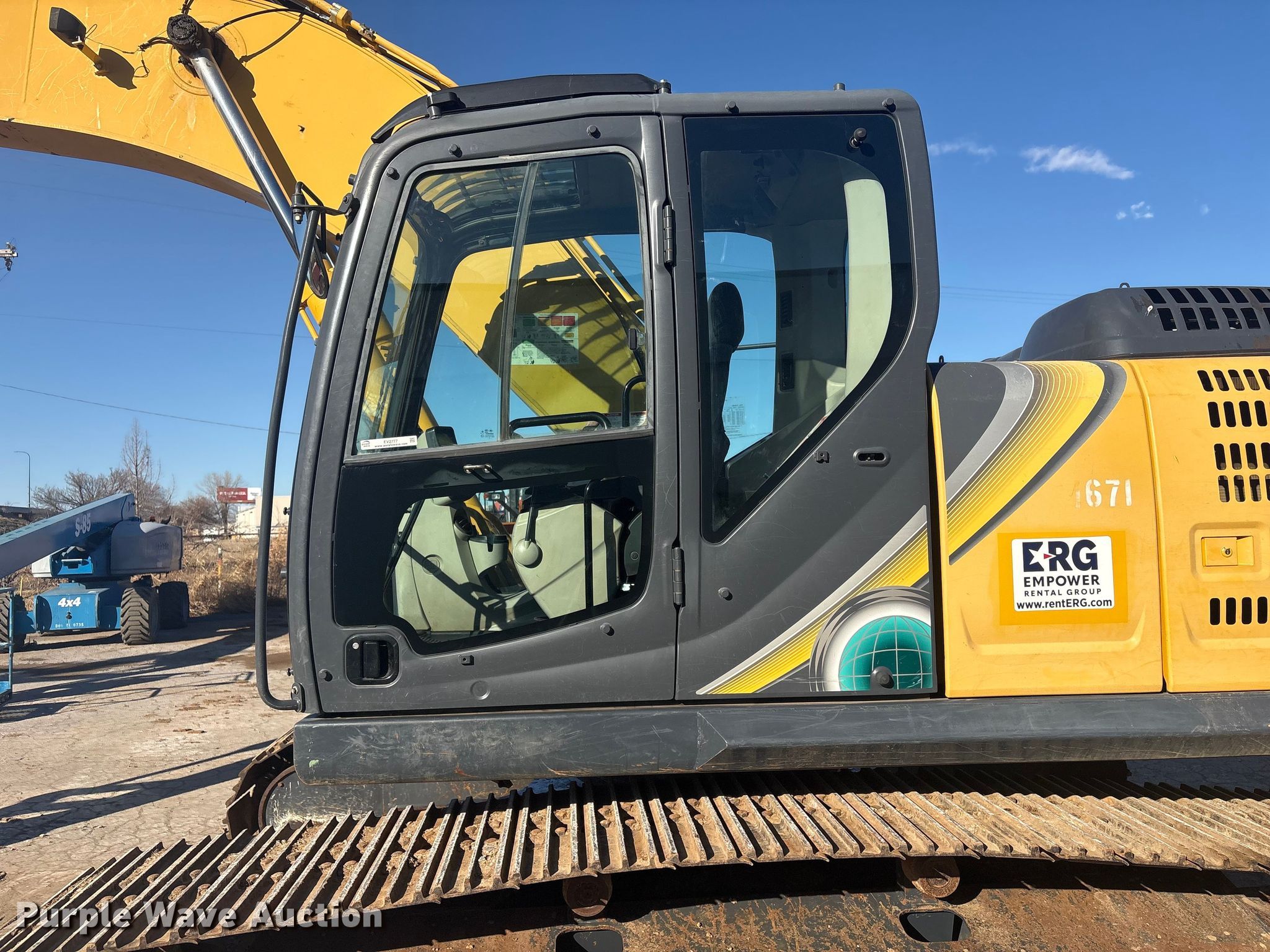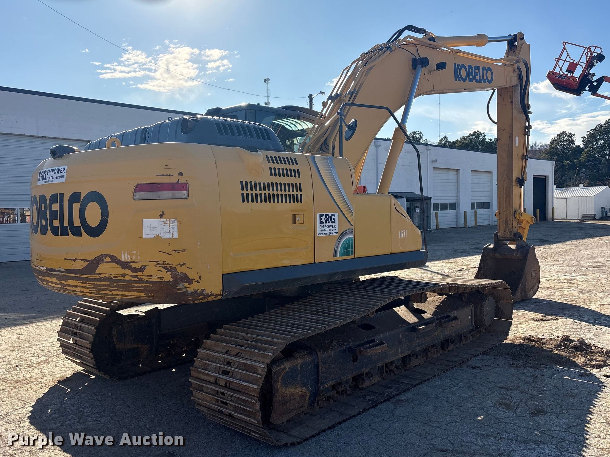 Kobelco SK210LC-10 excavator. Hours: 4,950 on meter, Serial: YQ15S00264, Unit #: 1671. Engine Hino AA-J05E-UM, Displacement: 5.123L, Cylinders: 4, Fuel type: Diesel, HP: 166. Transmission Hydrostatic, Two speed travel. Operators station Enclosed cab, AC, Backup camera, Pattern changer. Features Auxiliary hydraulics, Counter weights, Boom Standard, Stick Stick length: 9' 8", Bucket WB EX20HD36, Capacity: 1.03 cu.yd., Width: 36", Teeth: 5. Tracks Width: 31", Steel, Grouser pads: Triple. Empower Rental Group. Tulsa, OK 74107