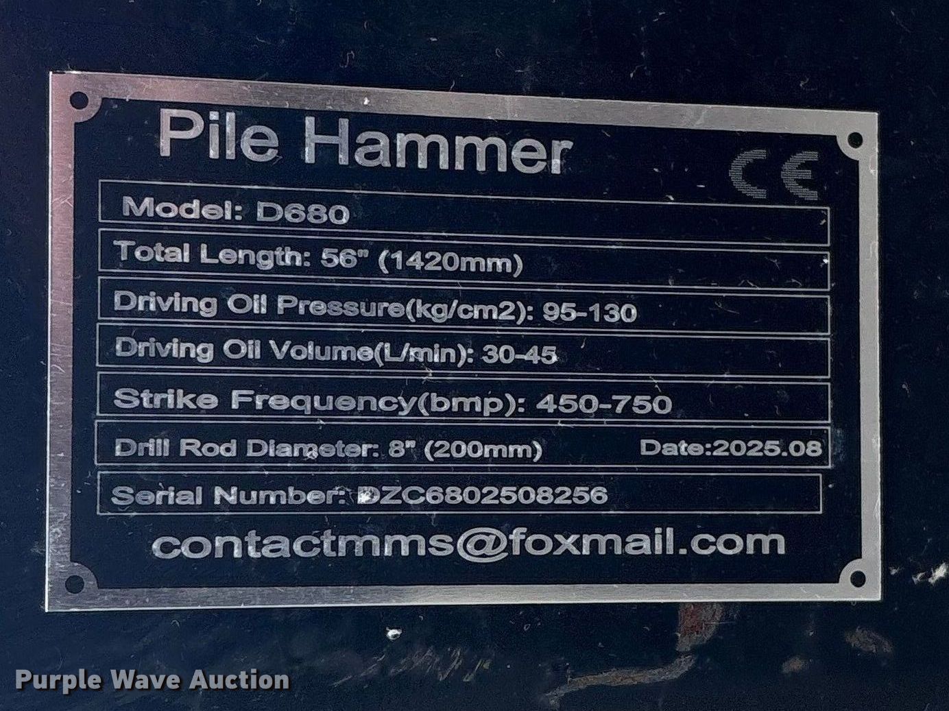 2025 Future D680 skid steer pile hammer. Serial: DZC6802508256, Diameter: 8". Chupp Industrial Marketing, Inc.. Chouteau, OK 74337
