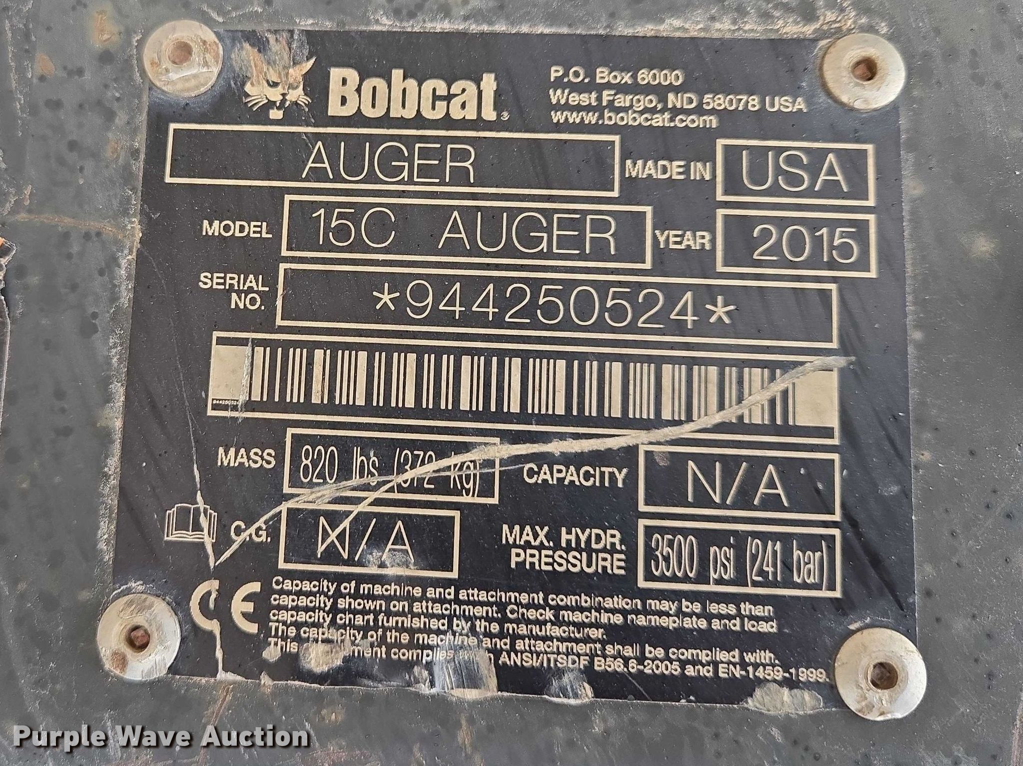 Purple Wave is selling a used Skid Steer Attach. in South Dakota. This item is a 2015 Bobcat 15C skid steer auger with the following: Serial: 944250524, Bits:, 9", 12"