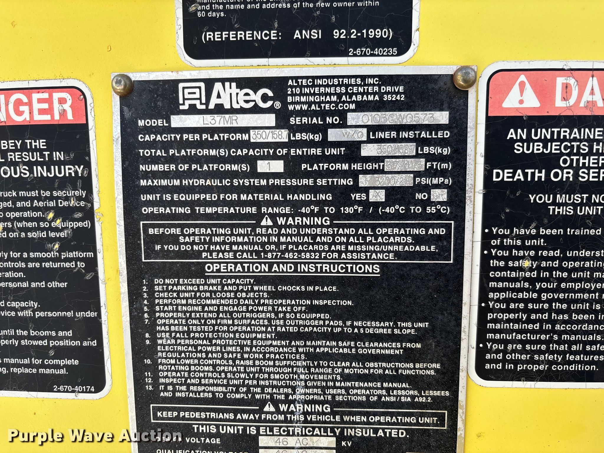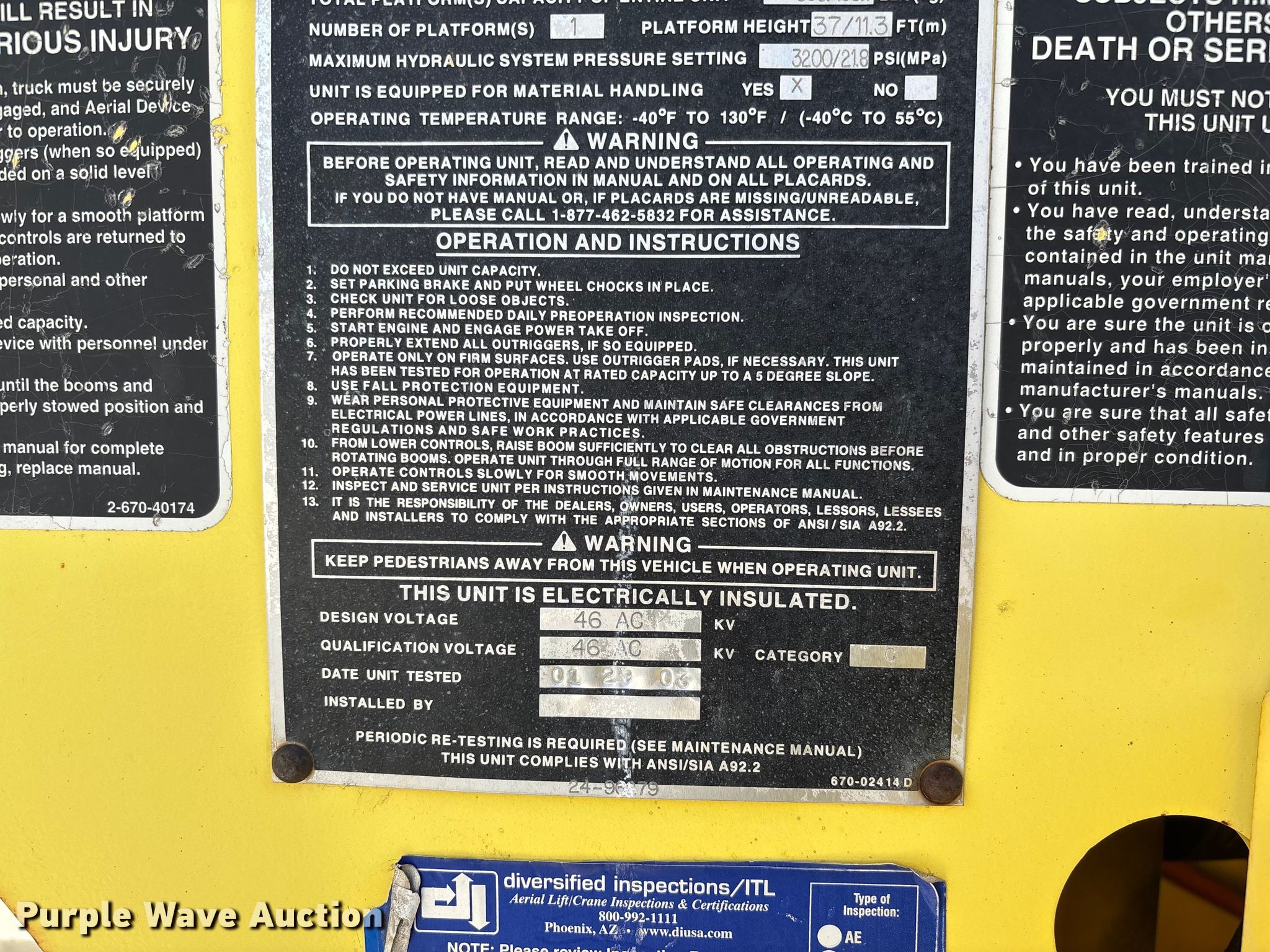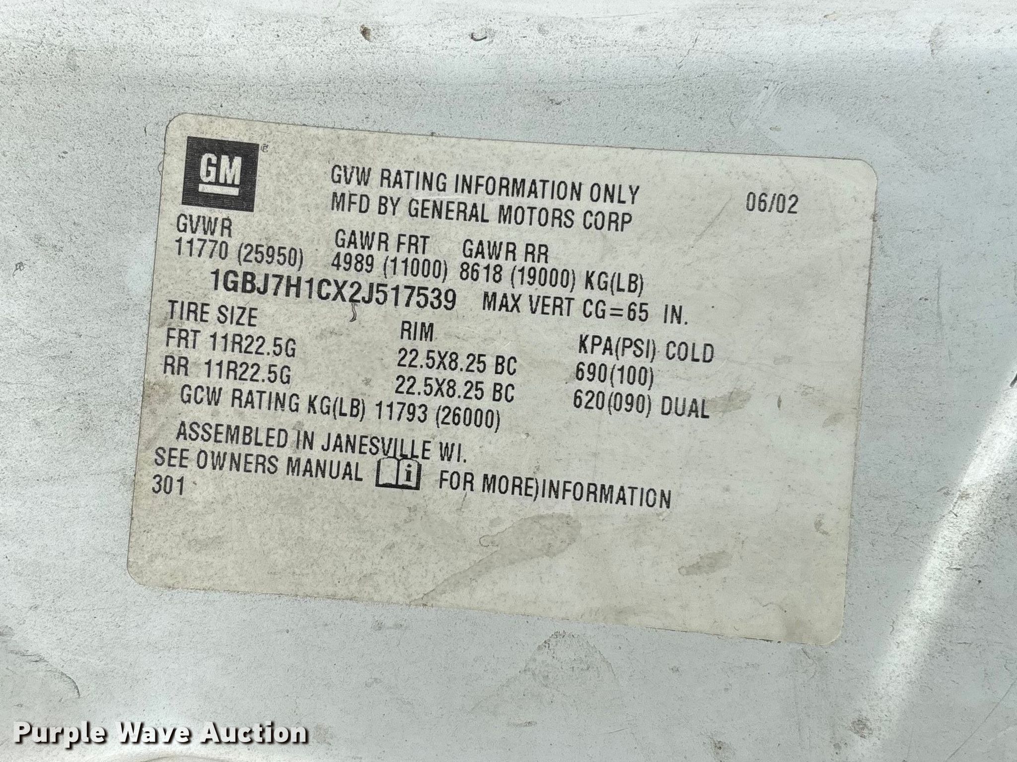 2002 Chevrolet C7 bucket truck. Miles: 172,107 on odometer, Hours: 15,776 on meter, VIN: 1GBJ7H1CX2J517539. Engine Caterpillar 3126, Serial: CKM58704, Displacement: 7.2L, Cylinders: 6, Fuel type: Diesel. Transmission Automatic. Chassis Axles: Single, Suspension: Spring, Brakes: Hydraulic, PTO, GVWR: 25,950 lbs, Wheelbase: 145". Interior AC, Heat, Auxiliary controls. Features Bed Utility bed, Altec, Length: 10' 7", Width: 7' 9", Boom 2003 Altec L37MR, Serial: 0103CW0573, Maximum lift capacity: 350 lbs, Maximum lift height: 37', Boom type: Articulating, Insulated, Man basket, Boom controls Lower, Basket, Material handler. Tires Size: 11R22.5. Arkansas title. Title distribution may be delayed up to 14 days from verification of funds. Hill Electric Inc. Farmington, AR 72730
