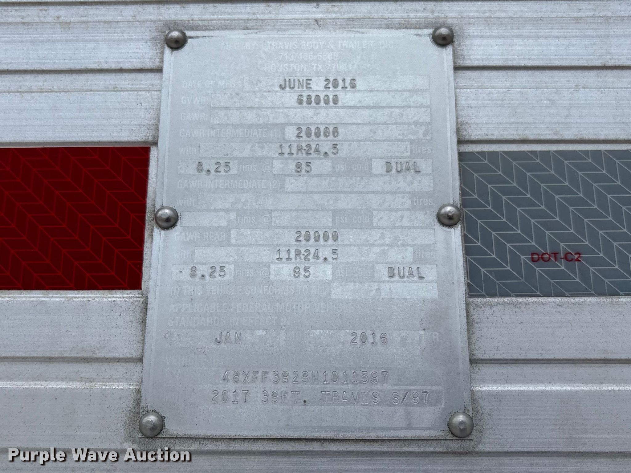 2017 Travis S/97 end dump trailer. VIN: 48XFF3929H1011597. Dimensions Overall Length: 41', Width: 101", Body Length: 39', Width: 97", Side height: 56". Features Body type: Aluminum, Ram: Single, Roll tarp. Chassis Landing gear: Dual, Suspension: Air, Brakes: Air, Axles: Tandem, GVWR: 68,000 lbs, GAWR: 20,000 lbs. Tires Steel wheels, Size: 11R24.5. Missouri title. Title distribution may be delayed up to 30 days from verification of funds. Emery Sapp & Sons, Inc.. Springdale, AR 72764