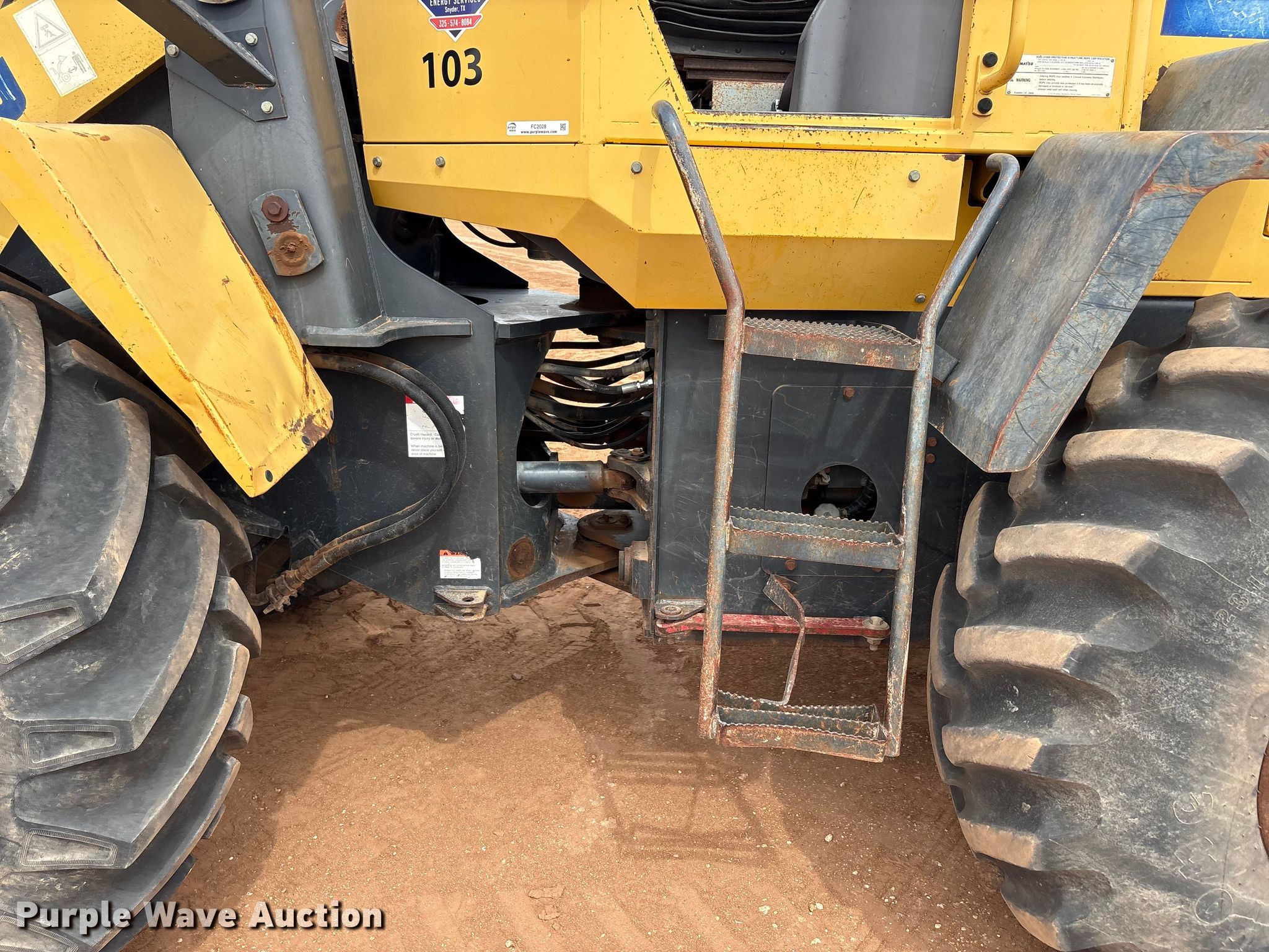 2005 Komatsu WA-250-5 wheel loader. Hours: 10,496 on meter, Serial: KMTWA020A01070777, Unit #: 103. Engine Komatsu SAA6D102E-2, Serial: 26358059, Cylinders: 6, Fuel type: Diesel. Transmission Powershift, 4F - 4R. Operators station OROPS, Bucket controls: Joystick. Features Quick coupler: Hydraulic, Bucket JRB, Width: 105", Cutting edge: Bolt-on, Forks JRB, Length: 59". Tires Size: 23.1-26. Caliper Energy Services. Snyder, TX 79549