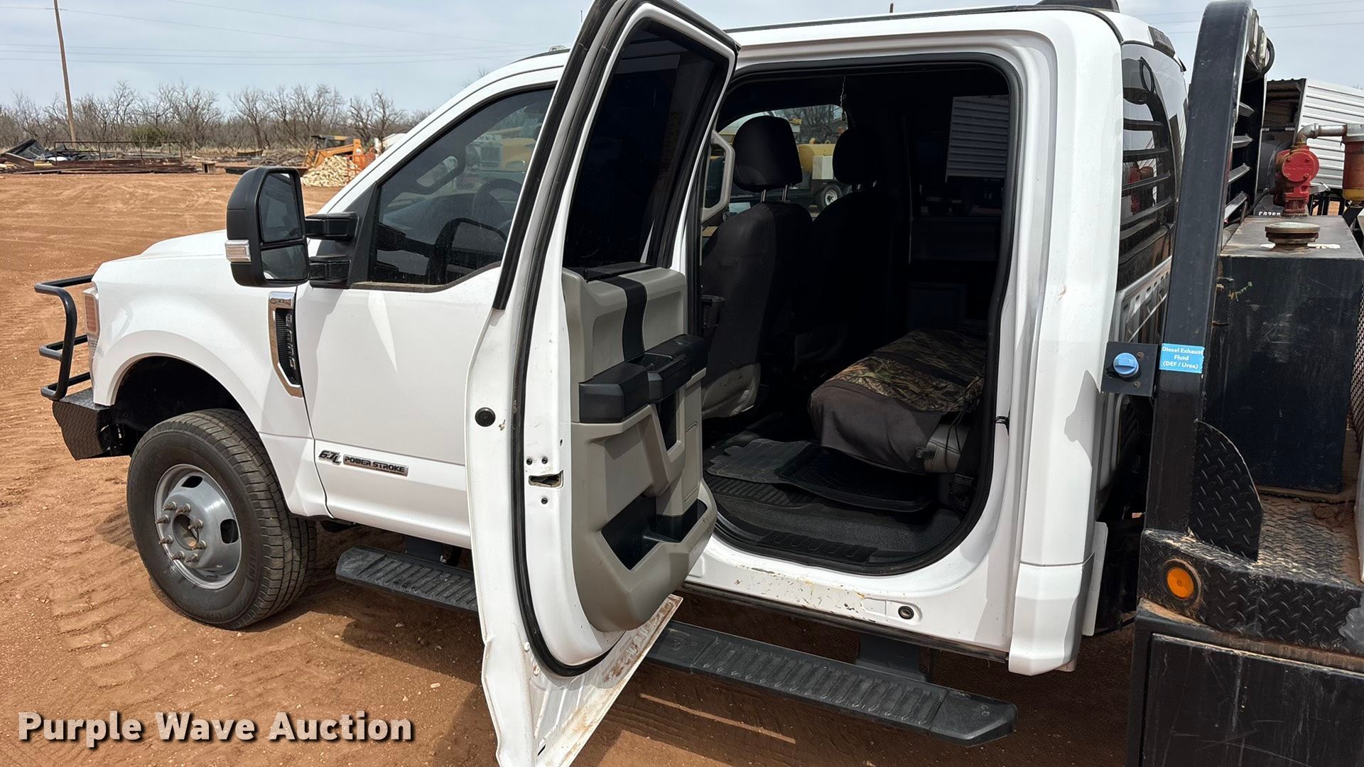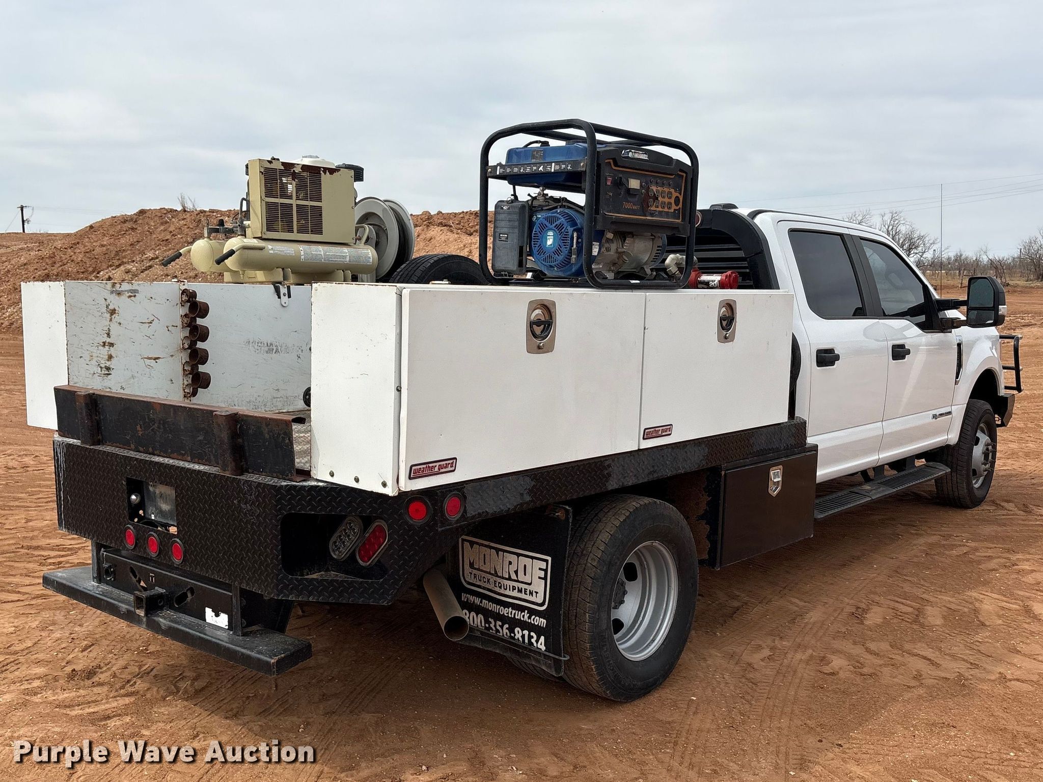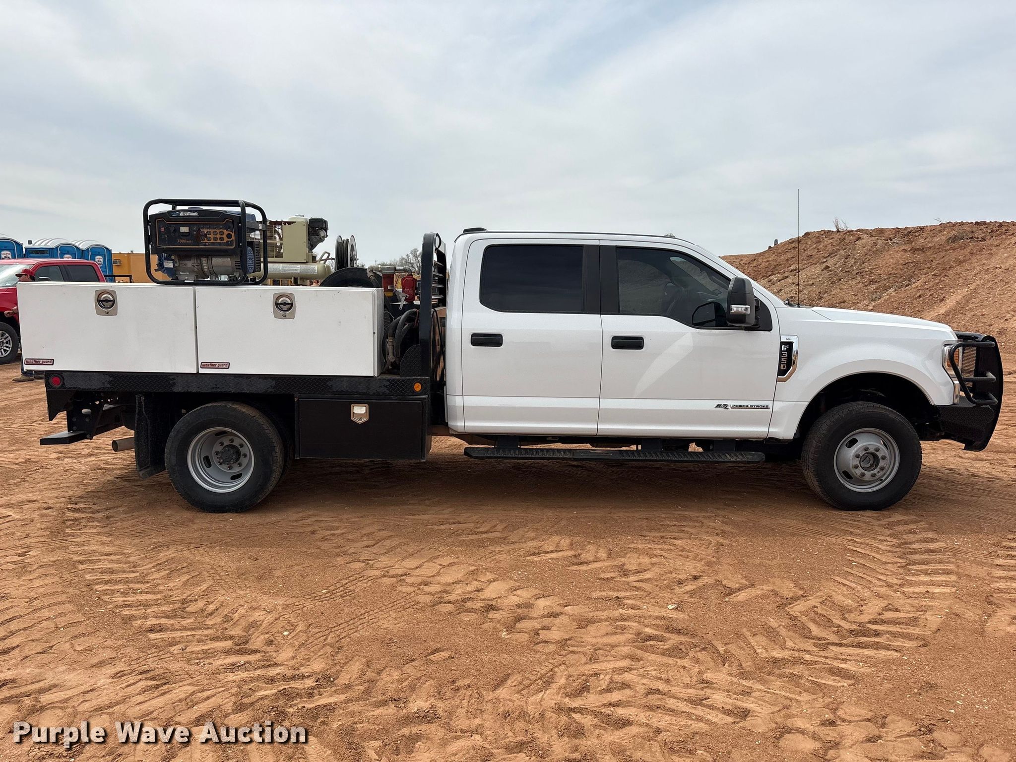 2020 Ford F350 Super Duty XL Crew Cab flatbed pickup truck. Miles: 141,509 on odometer, VIN: 1FD8W3HT8LEE11764. Engine Displacement: 6.7L, Cylinders: 8, Fuel type: Diesel. Transmission Automatic, Four wheel drive. Interior AC, Heat, Heated mirrors, Power windows, Power locks, Cruise control, Auxiliary controls, Brake controller. Features Bed Flatbed, Length: 9' 9", Width: 7' 8", Hitch: Gooseneck, Ingersoll Rand air compressor, Powerhorse generator. Tires Size: 245/75R17. Notes Dash warning indicator: TPMS, Non-operational generator. Texas title. Title distribution may be delayed up to 14 days from verification of funds. Caliper Energy Services. Snyder, TX 79549