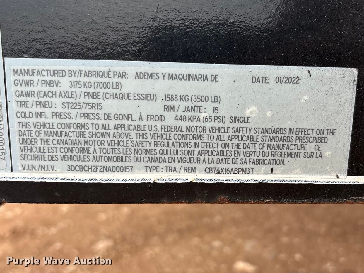 Purple Wave is selling a used Trailer Other in Texas. This item is a 2022 Amacsa CB76X16ABPM3T cooling trailer with the following: VIN: 3DCBCH2F2NA000157, Unit #: CD259