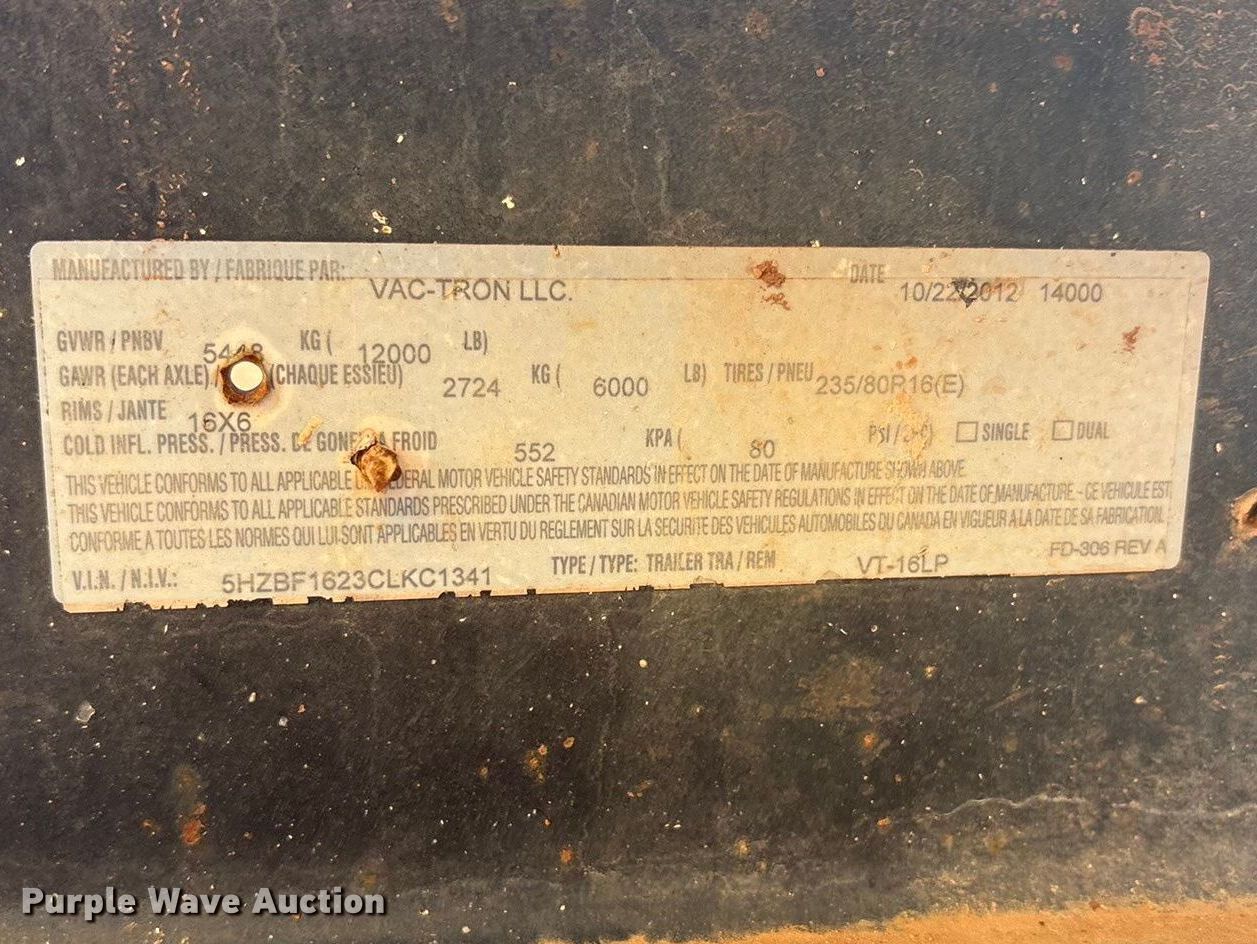 Purple Wave is selling a used Vacuum Excavator in Texas. This item is a 2012 Vac-Tron Vermeer LP555DT vacuum trailer with the following: Hours: 2,562 on meter, VIN: 5HZBF1623CLKC1341, Serial: 121418