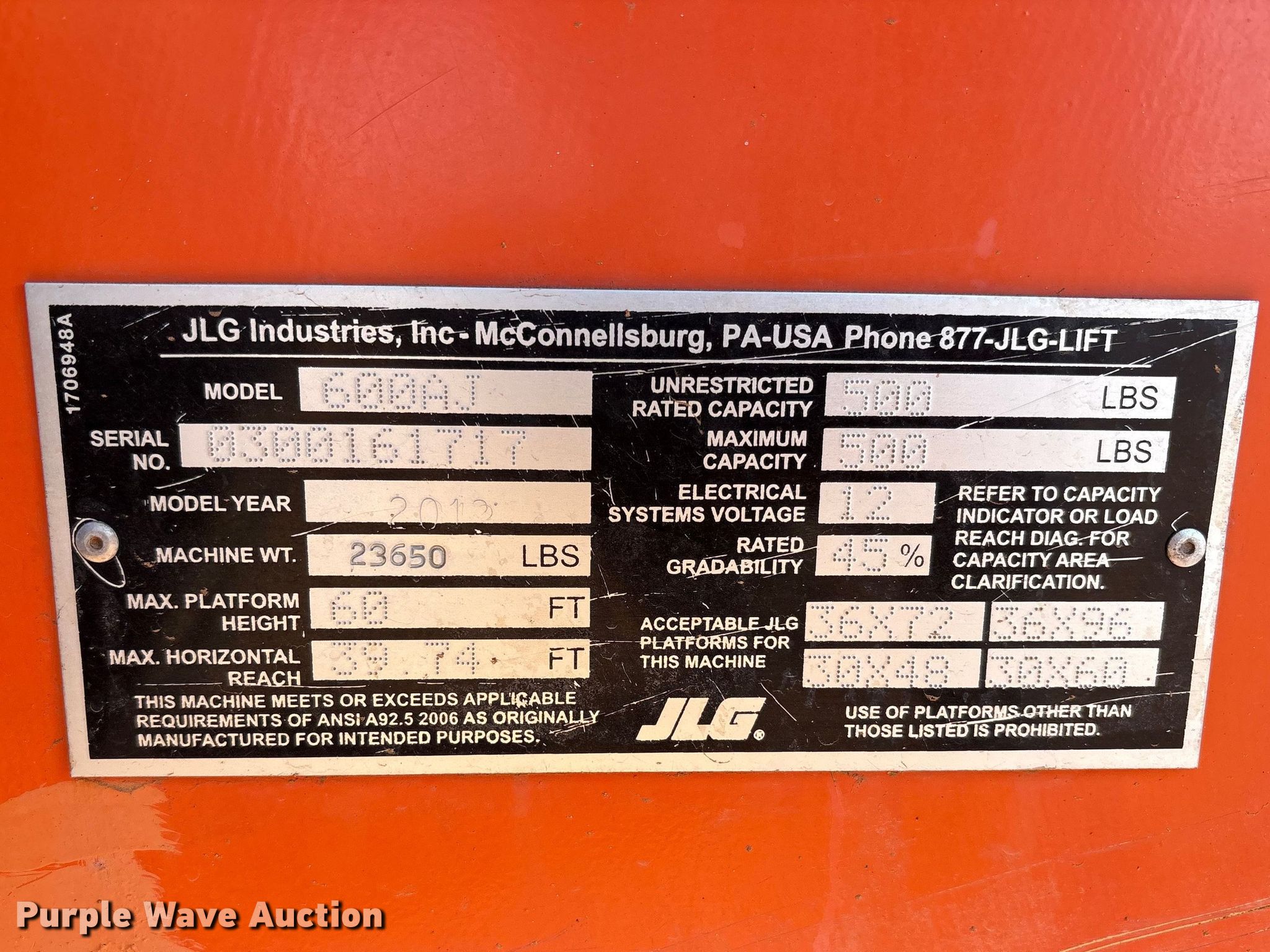Take a look at this used 2012 JLG 600AJ boom lift being sold on April 9th, 2026 in the Thursday April 09 Construction Equipment Auction made by JLG. Take a look at all of the item information below or take a look at similar auctions for Aerial Lifts.