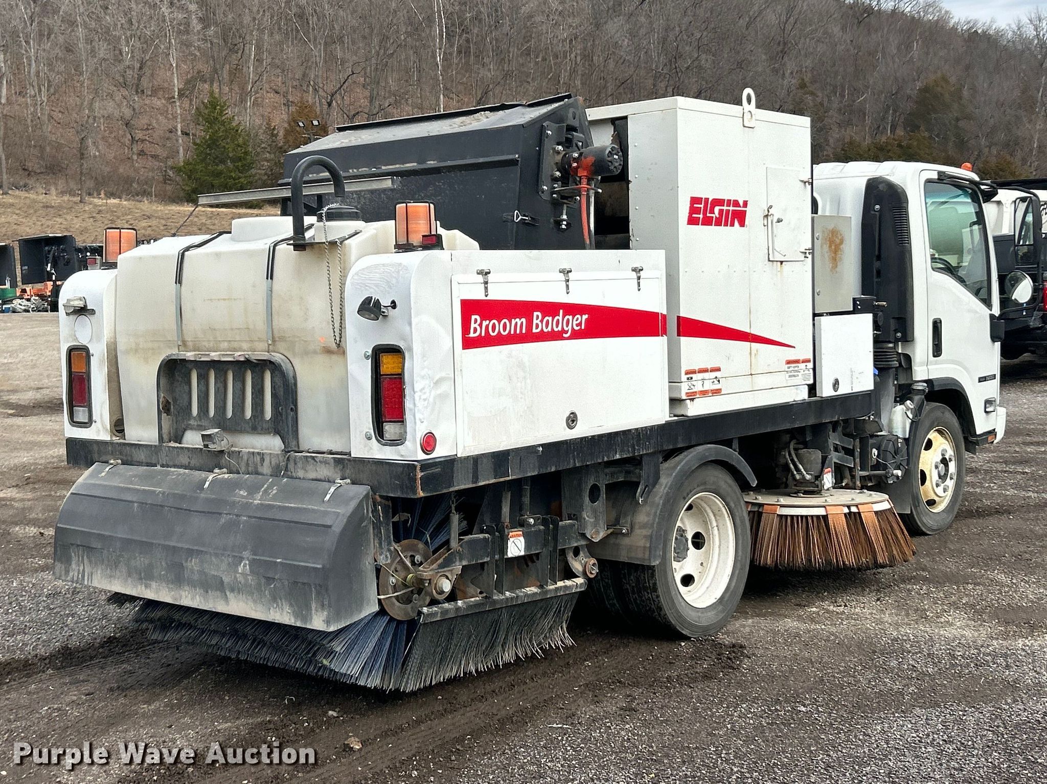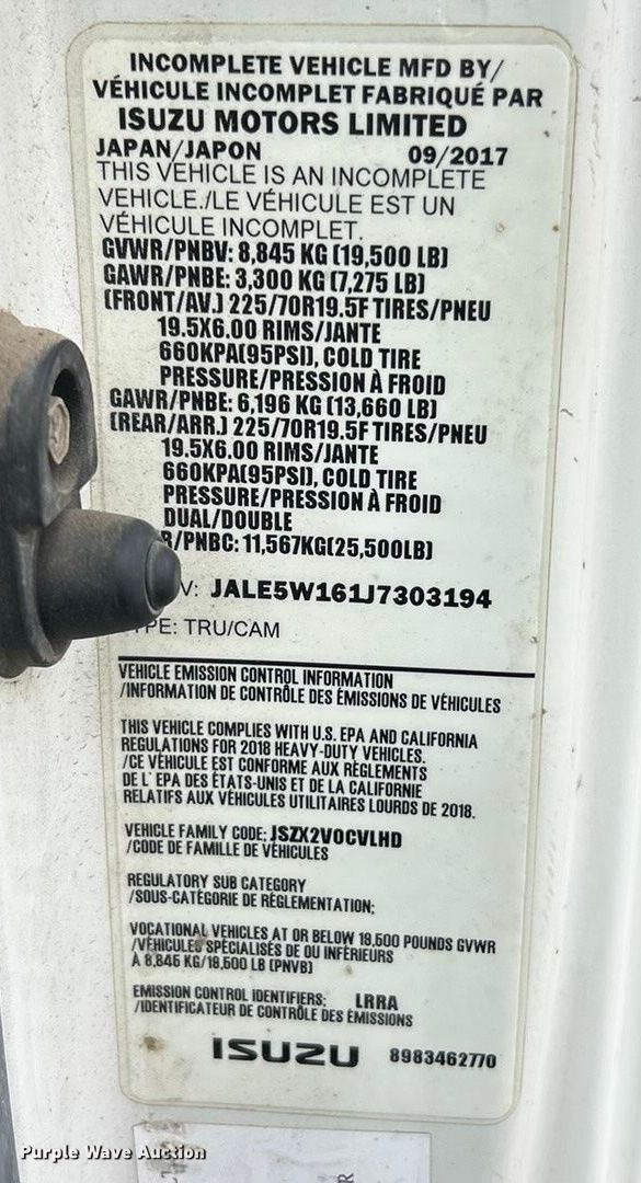 2018 Isuzu NRR street sweeper truck. Miles: 48,581 on odometer, Hours: 5,252 on meter, VIN: JALE5W161J7303194. Engine Isuzu, Displacement: 317 C.I.D., Cylinders: 4, Fuel type: Diesel, HP: 210. Transmission Automatic. Chassis Suspension: Spring, Brakes: Hydraulic, GVWR: 19,500 lbs. Operators station AC, Heat, Backup camera. Features Bed Sweeper bed, Elgin Broom Badger, Sweeper bed type: Conveyor, Broom Width: 60", Left gutter broom Diameter: 32", Right gutter broom Diameter: 32", Water spray system, Engine Kubota V2403-M-T-ET05, Displacement: 2.4L, Cylinders: 4. Tires Size: 225/70R19.5. Missouri title. Title distribution may be delayed up to 14 days from verification of funds. N.B. West Contracting Co., Inc.. Pacific, MO 63069