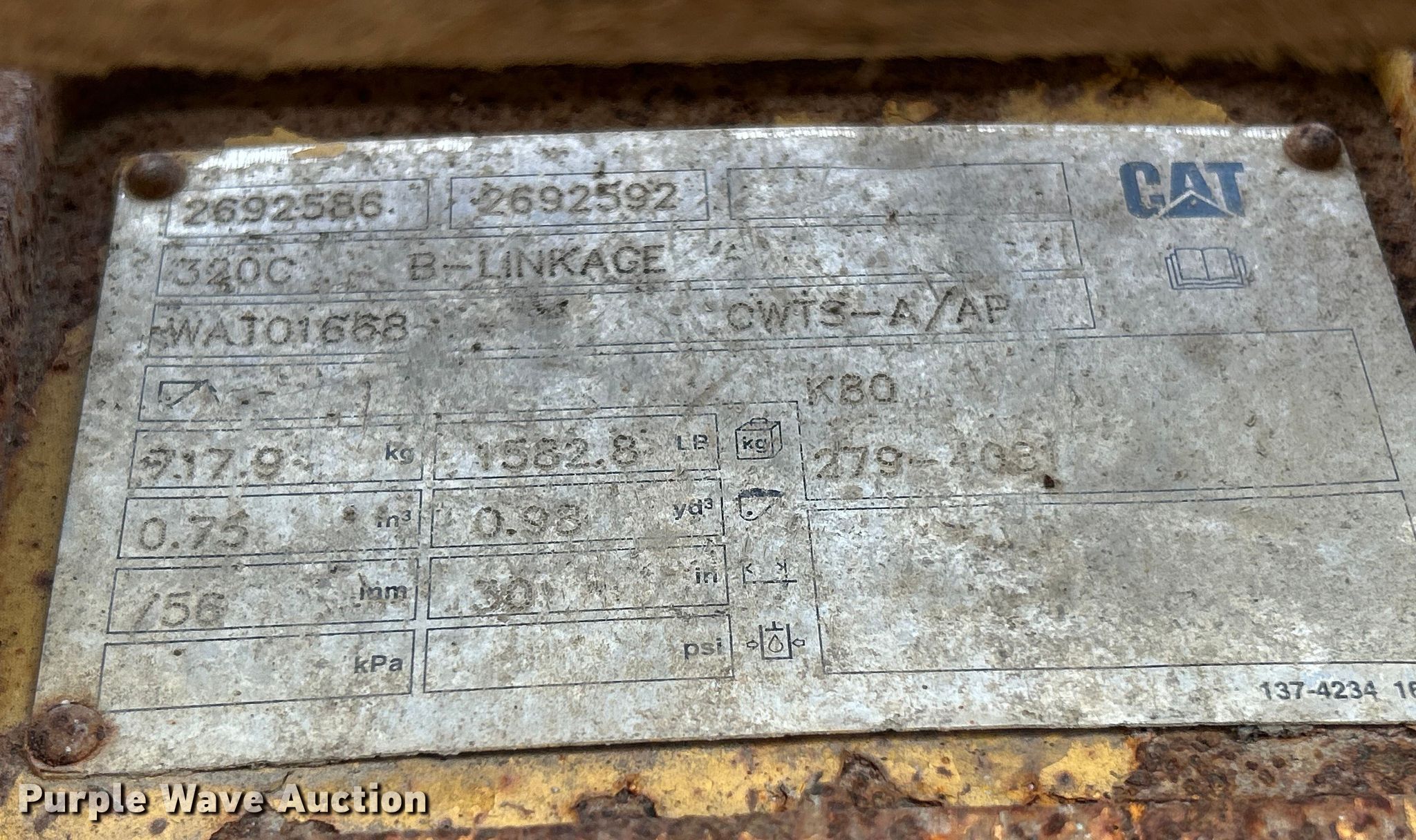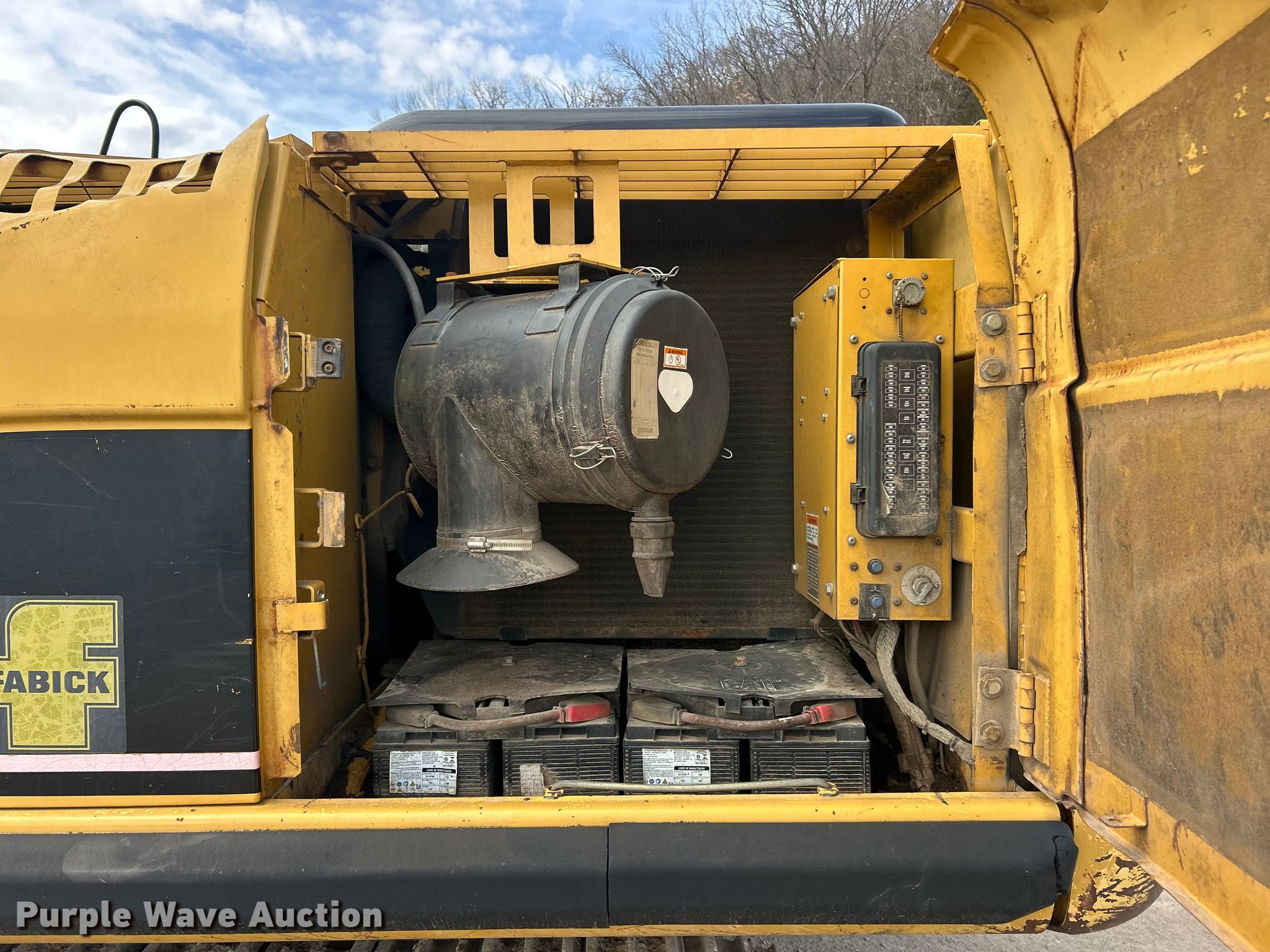 2005 Caterpillar 322C L excavator. Hours: 9,696 on meter, Serial: CAT0322CCHEK00985. Engine Caterpillar 3126, Displacement: 7.2L, Cylinders: 6, Fuel type: Diesel. Transmission Hydrostatic, Two speed travel. Operators station Enclosed cab, AC, Heat, Pattern changer. Features Boom Standard, Stick Stick length: 9' 6", Bucket Caterpillar, Width: 30", Teeth: 4. Tracks Width: 31.5", Steel, Grouser pads: Triple. Notes Glass cracked. St. Louis Composting. Eureka, MO 63069