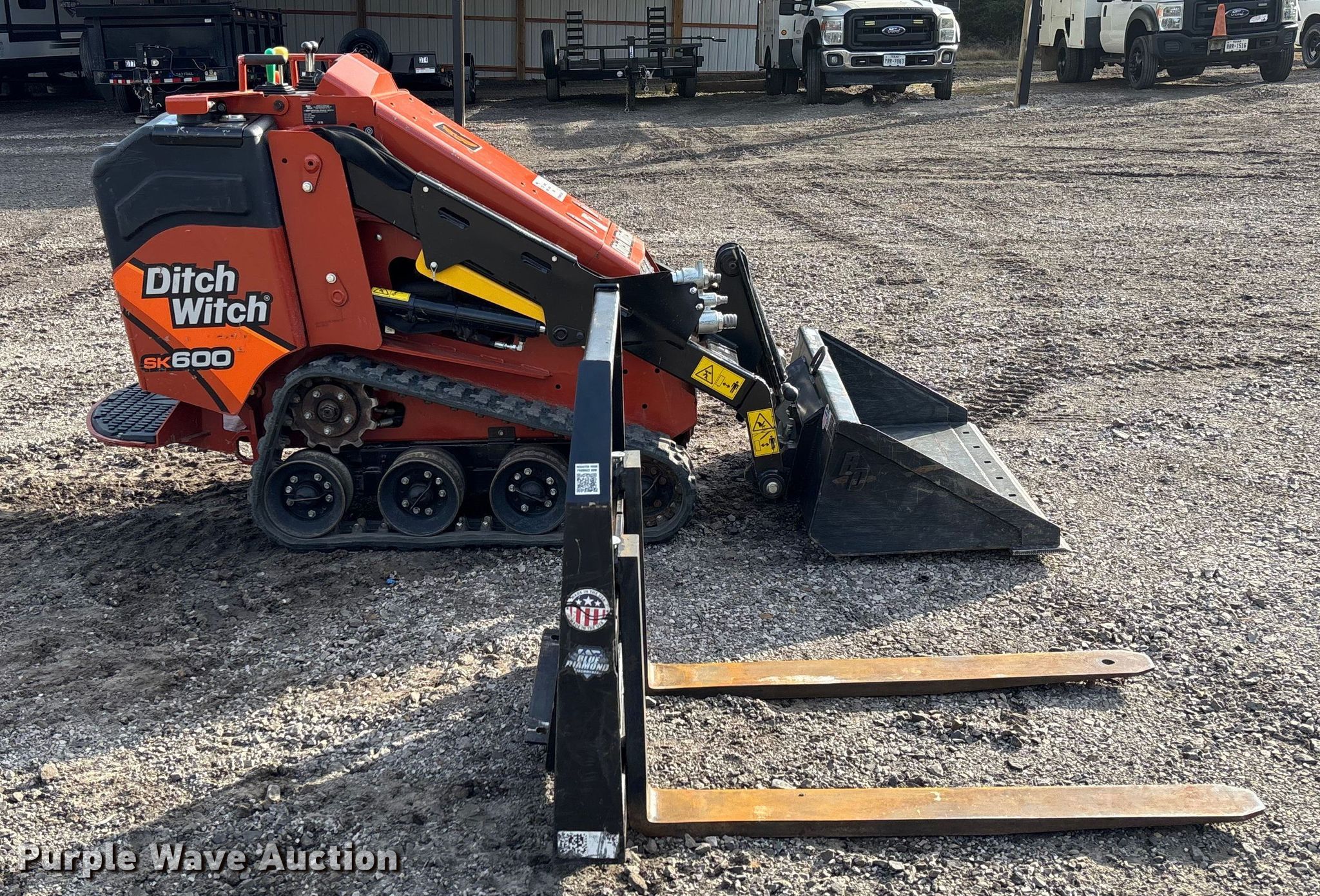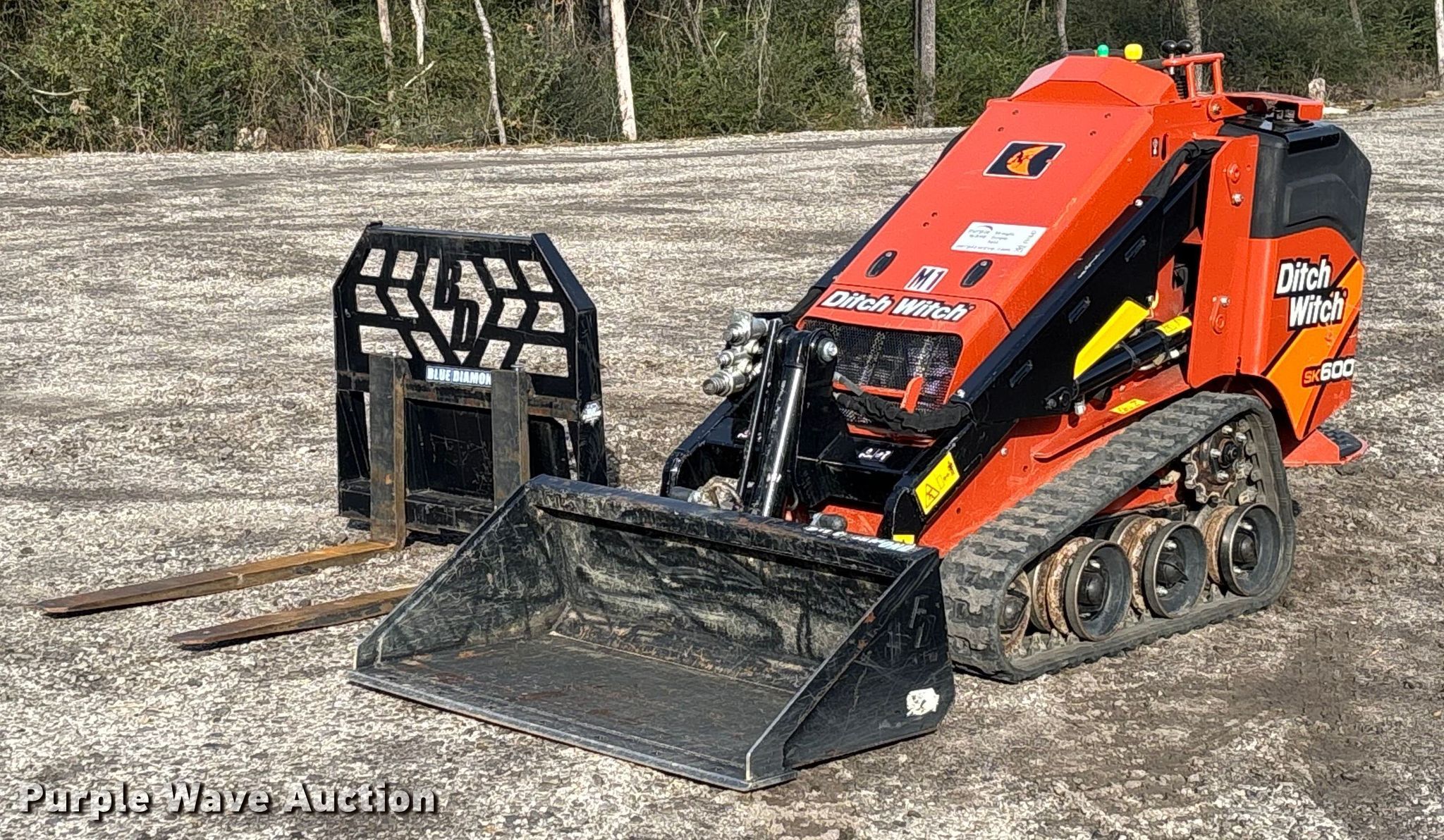 2023 Ditch Witch SK600 compact utility loader. Hours: 383 on meter, Serial: DWPSK600LP0001681. Engine Kubota D902-EF01, Serial: 4NB2682, Displacement: 0.898L, Cylinders: 3, Fuel type: Diesel, kW: 18.2. Transmission Hydrostatic. Operators station Bucket control: Hand. Features Auxiliary hydraulics, Quick coupler: Manual, Bucket Blue Diamond 108030-25, Width: 44", Cutting edge: Weld-on, Forks Blue Diamond, Length: 42". Tracks Width: 7". View repairs. Van Buren, AR 72956