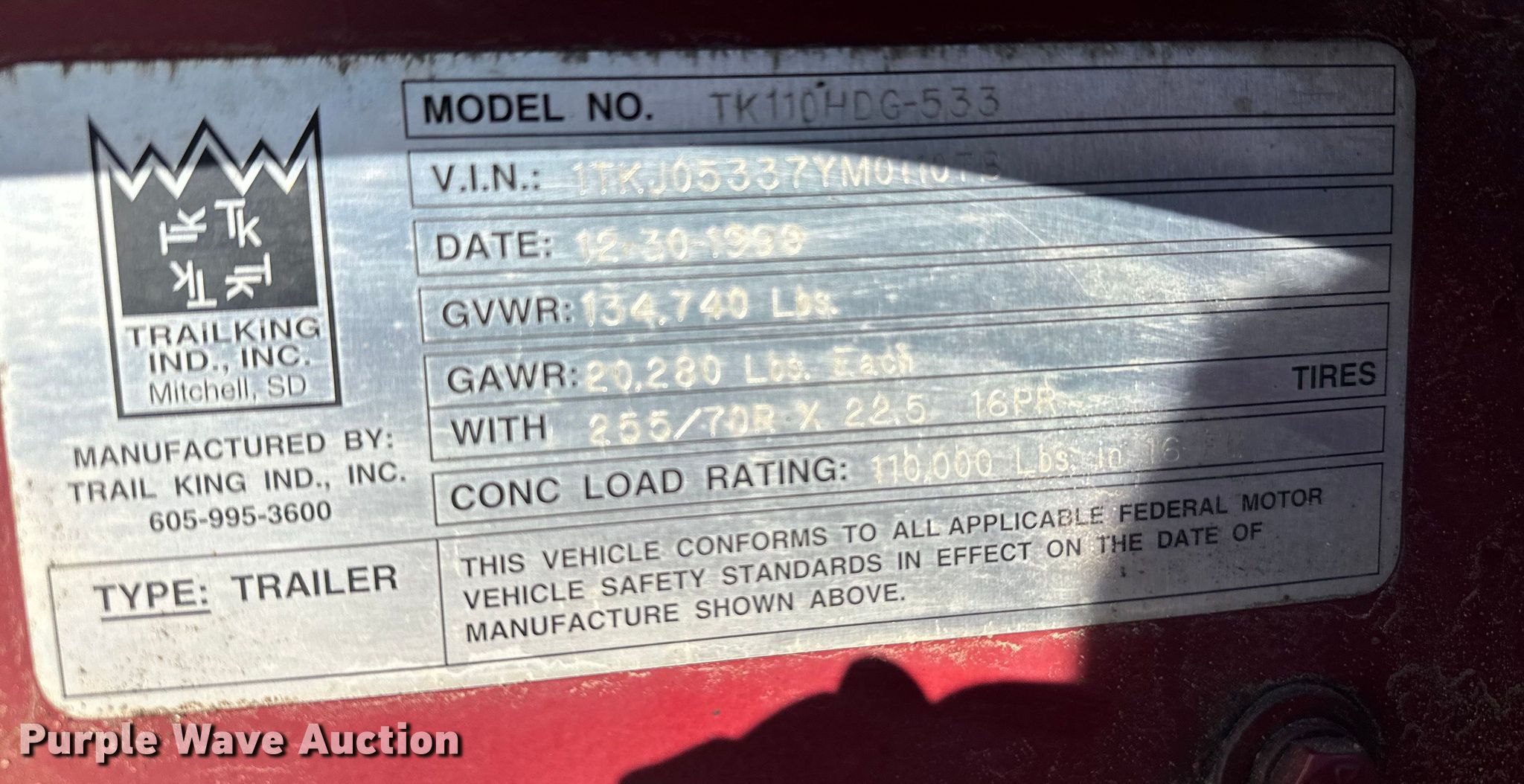 Purple Wave is selling a used Equip. Trailer in Minnesota. This item is a 2000 Trail King TK110HDG-533 lowboy equipment trailer with the following: VIN: 1TKJ05337YM011078