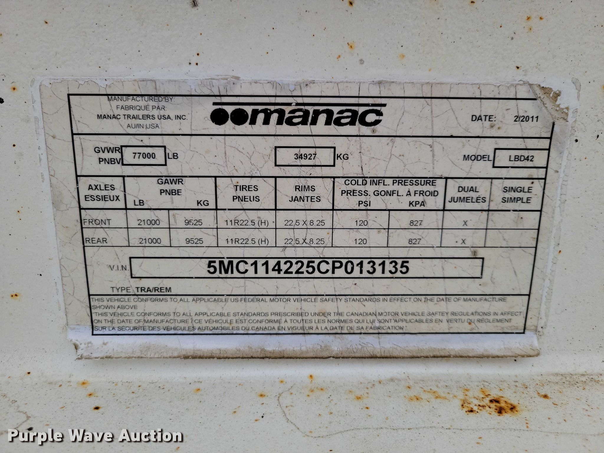 Take a look at this used 2012 Manac LBD42 bottom dump trailer being sold on April 9th, 2026 in the Thursday April 09 Construction Equipment Auction made by Manac. Take a look at all of the item information below or take a look at similar auctions for Construction Trailers.