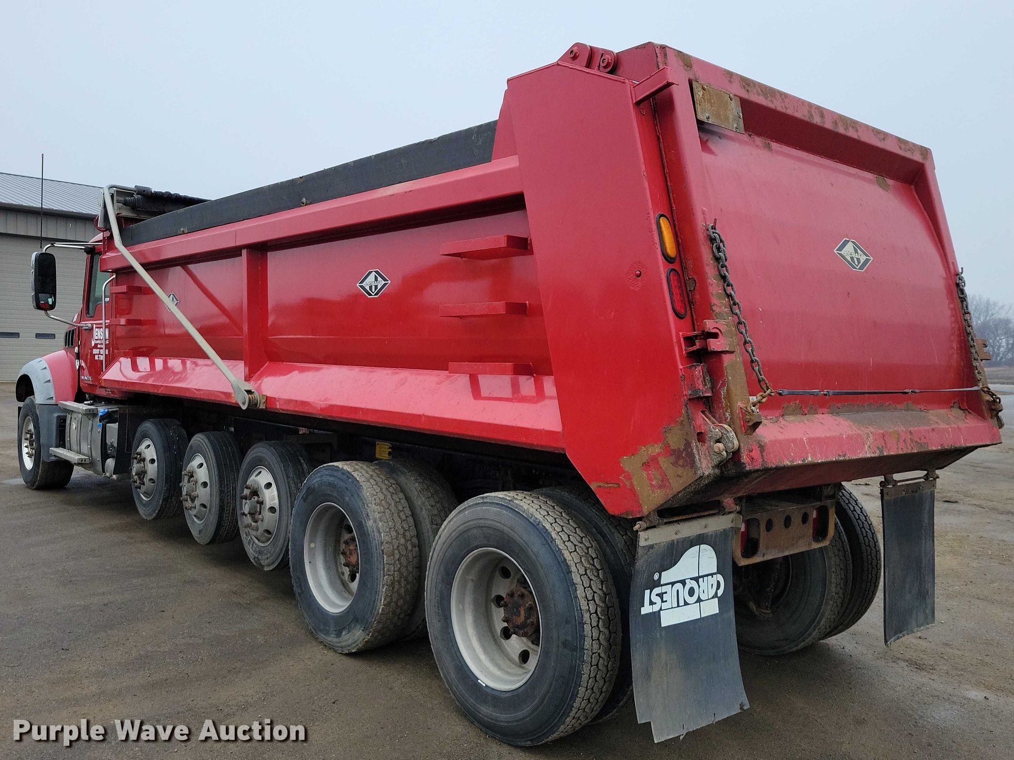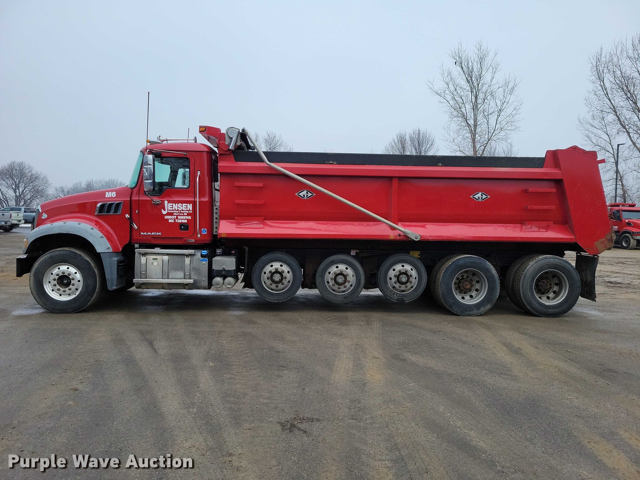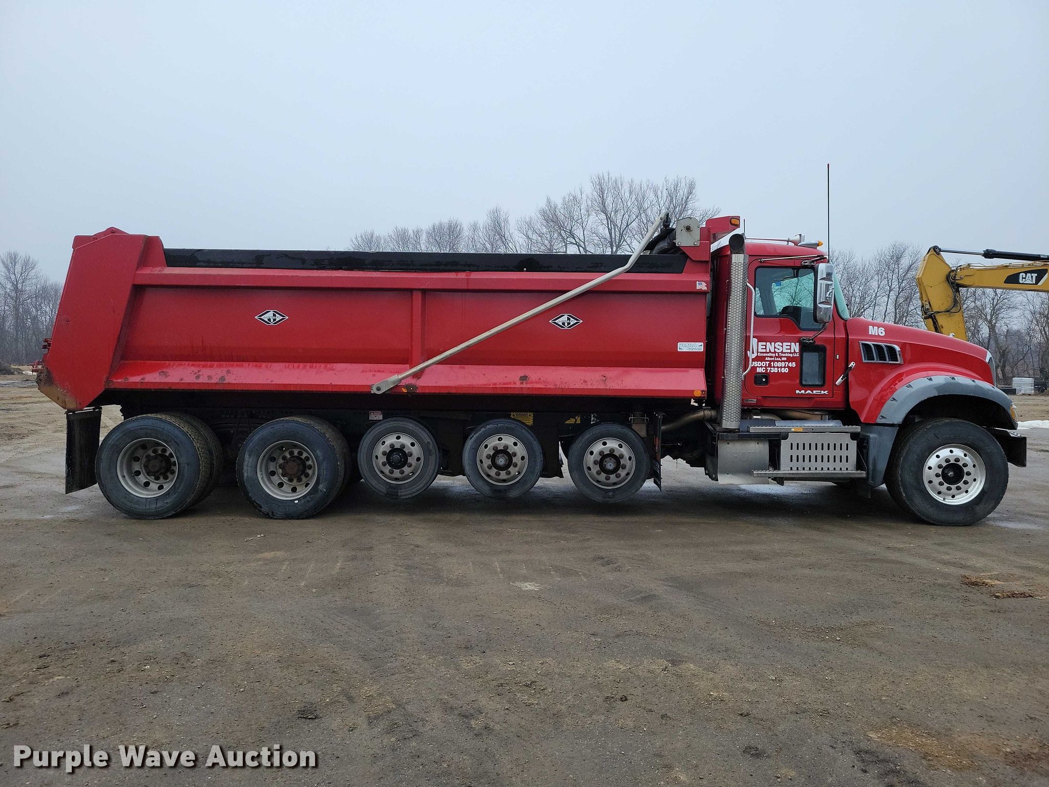 2017 Mack Granite GU713 dump truck. Miles: 354,829 on odometer, Hours: 11,300 on meter, VIN: 1M2AX07C3HM033817. Engine Mack MP8, Serial: 1149395, Displacement: 12.8L, Cylinders: 6, Fuel type: Diesel, HP: 445, Engine brake. Transmission Allison, Automatic. Chassis Axles: 5, Pusher axle Steerable, Differential lock: Inter-axle, Suspension: Spring over walking beam, Brakes: Air, PTO, GVWR: 64,000 lbs FAWR: 23,000 lbs, IAWR: 20,000 lbs, RAWR: 20,000 lbs, Lift axle GAWR: 10,000 lbs. Interior AC, Heat, Heated mirrors, Power windows, Cruise control. Features Bed Dump bed, J-Croft, Serial: JC51200610, Length: 21', Width: 96", Side height: 48", Side board height: 8", Bed type: Steel, Barrel, Bed vibrator, Roll tarp, Ram: Single, End gate: Air operated. Tires Front: 385/65R22.5, Rear: 11R22.5, Lift axle: 245/70R19.5. Notes Windshield chipped or cracked. Minnesota title. Title distribution may be delayed up to 14 days from verification of funds. Jensen Excavating & Trucking, LLC.. Albert Lea, MN 56007