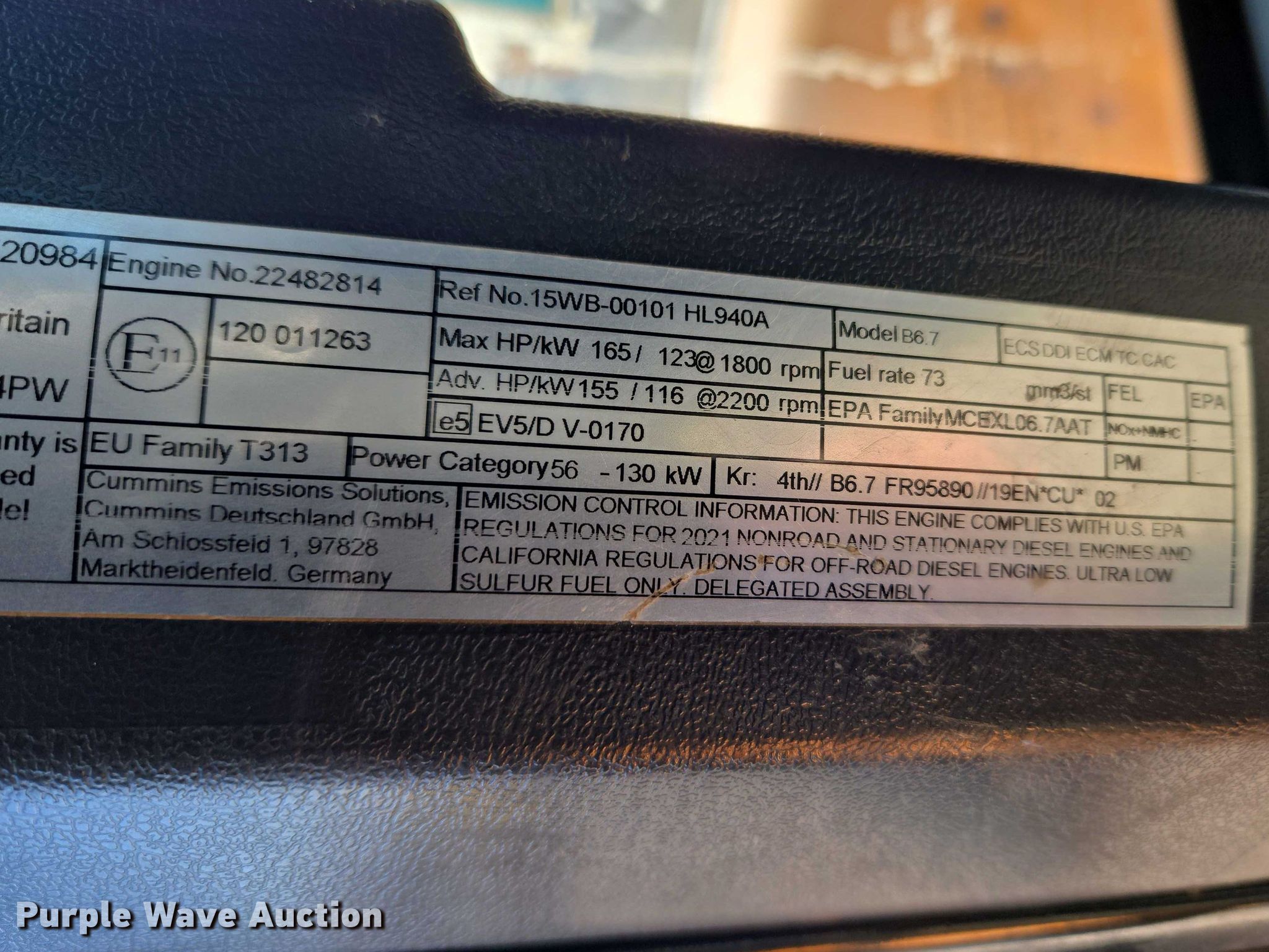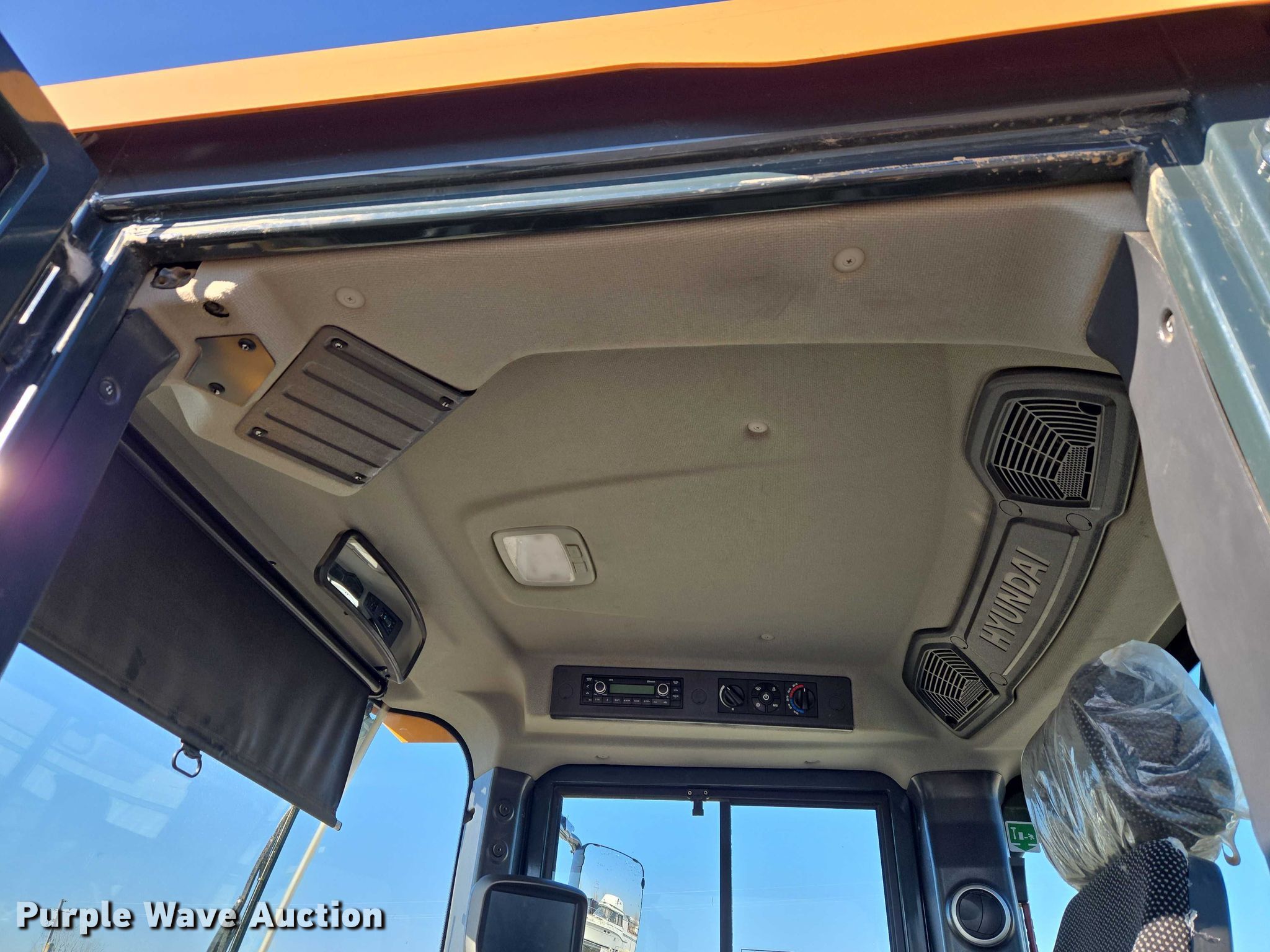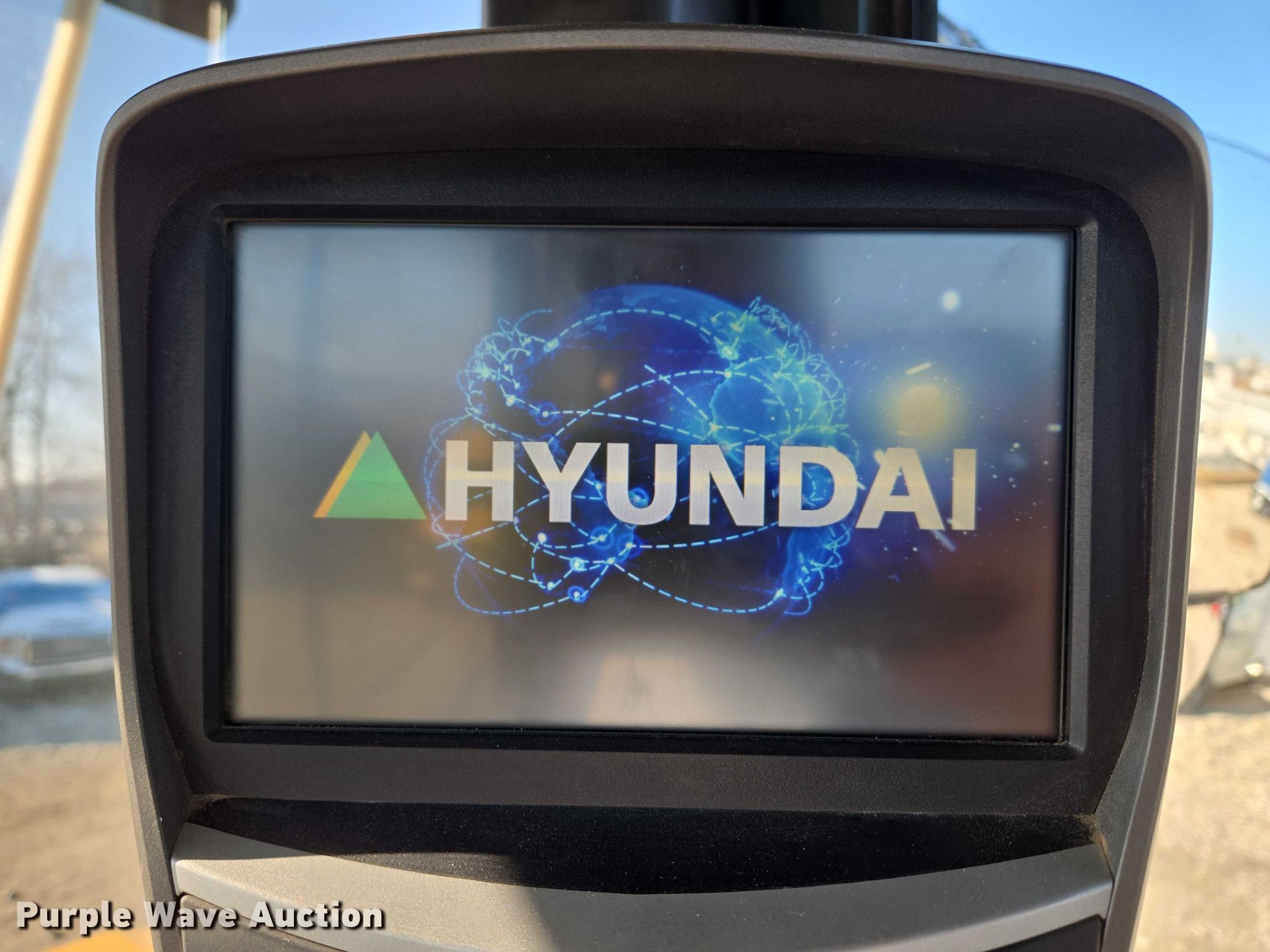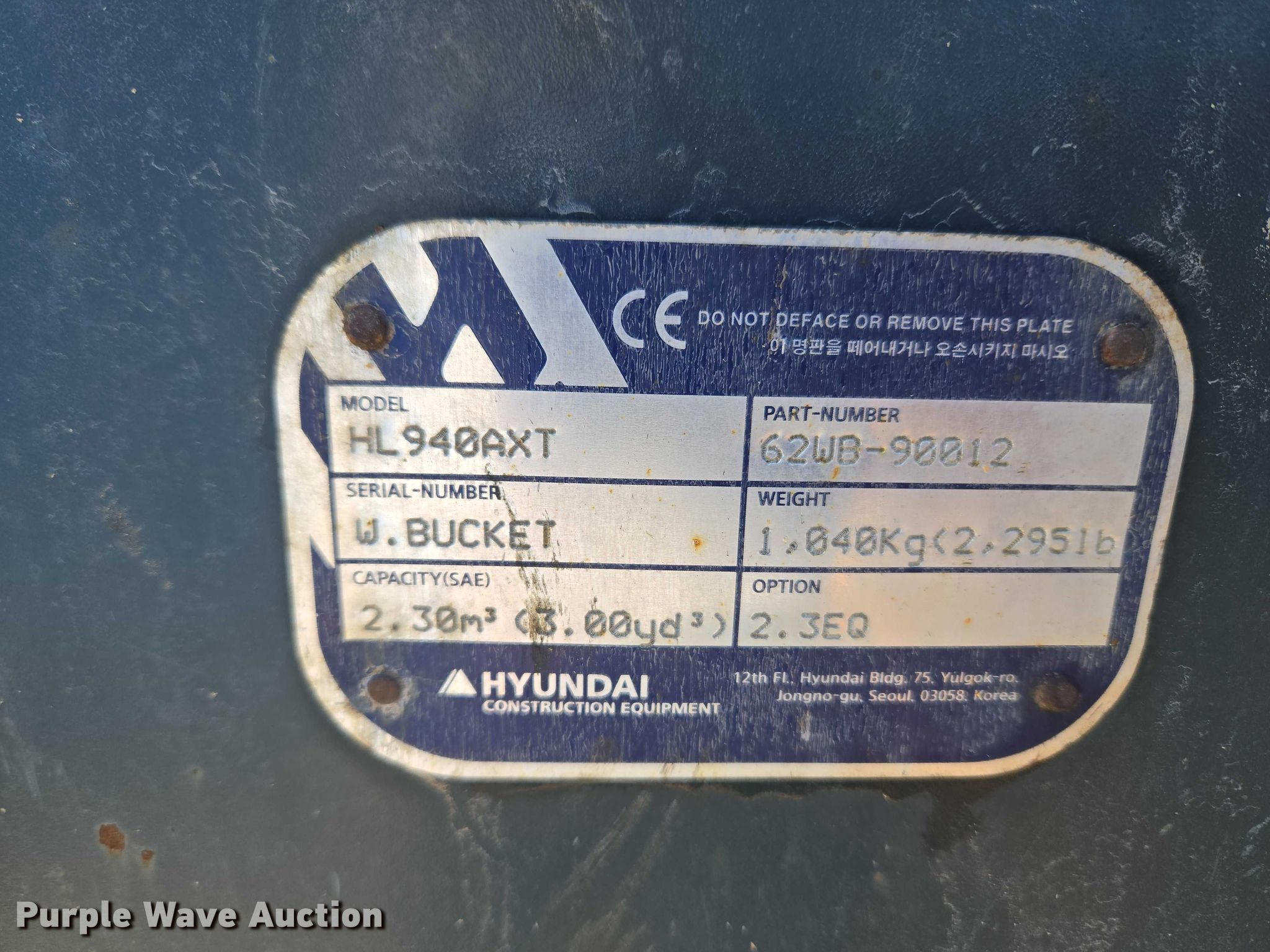 2021 Hyundai HL940A XT high lift wheel loader. Hours: 1,546 on meter, Serial: HHKHWL40HL0000294, Unit #: 78835295. Engine Cummins B6.7, Displacement: 6.7L, Cylinders: 6, Fuel type: Diesel, HP: 165. Transmission Powershift, 4F - 3R. Chassis Differential lock. Operators station Enclosed cab, AC, Heat, Backup camera, Steering: Joystick, Bucket controls: Joystick, Ride control. Features Quick coupler: Hydraulic, Counter weights, Self-leveling loader, Bucket Hyundai HL940AXT, Capacity: 3 cu.yd., Width: 102.5", Cutting edge: Bolt-on, Scale Hyundai. Tires Size: 20.5R25. Repossessed item, stored at a secured facility. Please review REQUIRED REMOVAL INSTRUCTIONS. Lender Owned. 2500 American Drive. Appleton , WI 54914