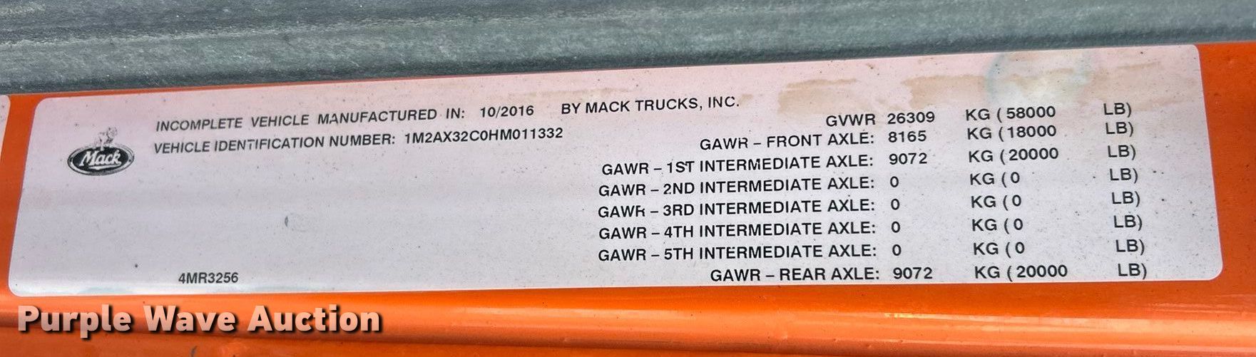 2017 Mack GU433 dump truck. Miles: 53,189 on odometer, Hours: 2,885 on meter, VIN: 1M2AX32C0HM011332, Unit #: 73073475. Engine Cummins, Displacement: 8.9L, Cylinders: 6, Fuel type: Diesel. Transmission Automatic. Chassis Axles: Tandem, Differential lock: Inter-axle, Suspension: Spring over walking beam, Brakes: Air, PTO, GVWR: 58,000 lbs FAWR: 18,000 lbs, IAWR: 20,000 lbs, RAWR: 20,000 lbs. Interior AC, Heat, Heated mirrors, Power windows, Cruise control. Features Bed Dump bed, Henderson 14x36xMKExSS, Serial: MKE-30543, Length: 14', Width: 96", Side height: 36", Side board height: 11", Bed type: Steel, Ram: Single, End gate: Air operated. Tires Front: 315/80R22.5, Rear: 11R22.5. Notes Dash warning indicator: Check engine, Stop engine, Glass missing, Roll over damage, Possible engine issues, turns over but will not start , Driveshaft disconnected, parts missing Unit must be towed or hauled. Buyer responsible for all aspects of loadout and removal. Insurance salvage, stored at a secured facility. Please review REQUIRED REMOVAL INSTRUCTIONS. Titles will be distributed after confirmation of payment and removal. Illinois salvage title. Title distribution may be delayed up to 30 days from verification of funds. Insurance Salvage. Cahokia Heights, IL 62205