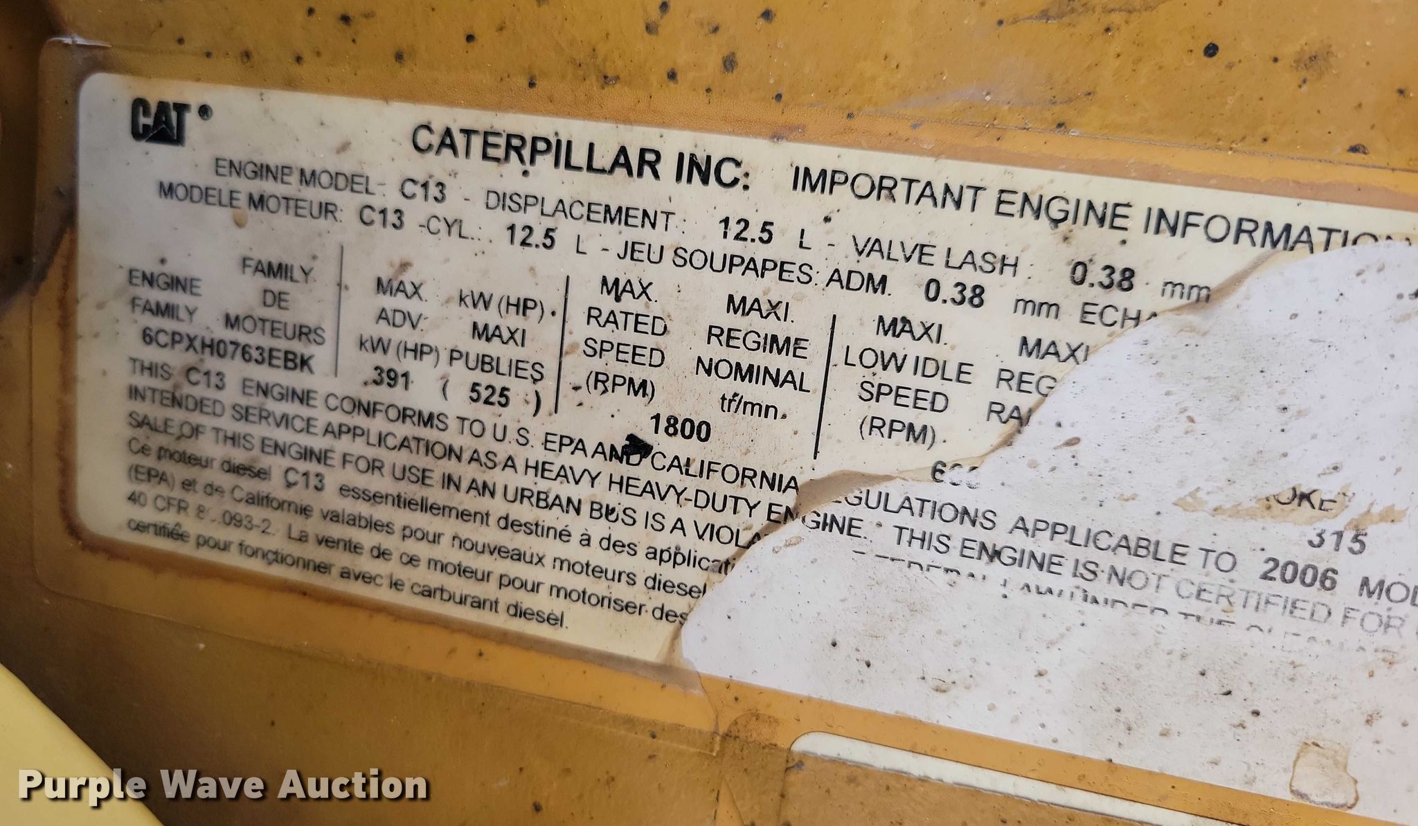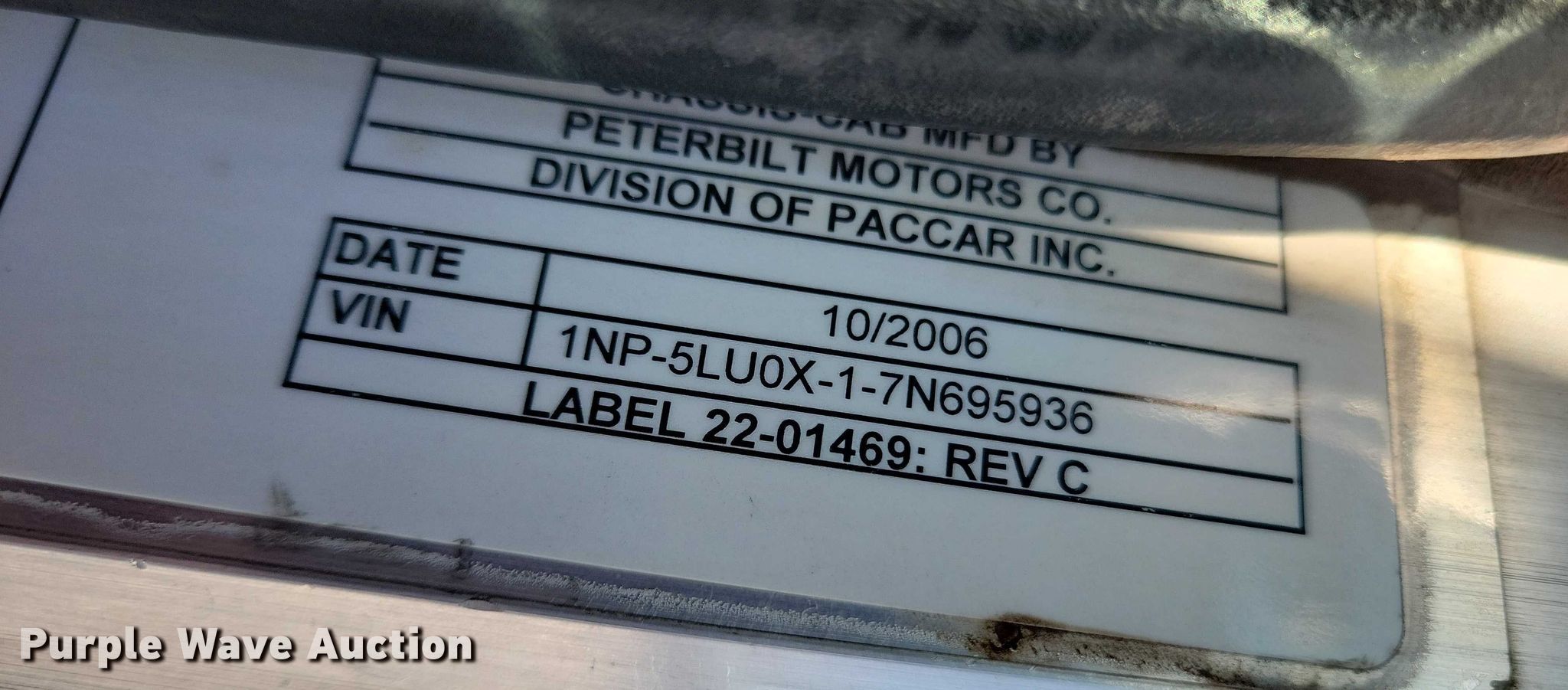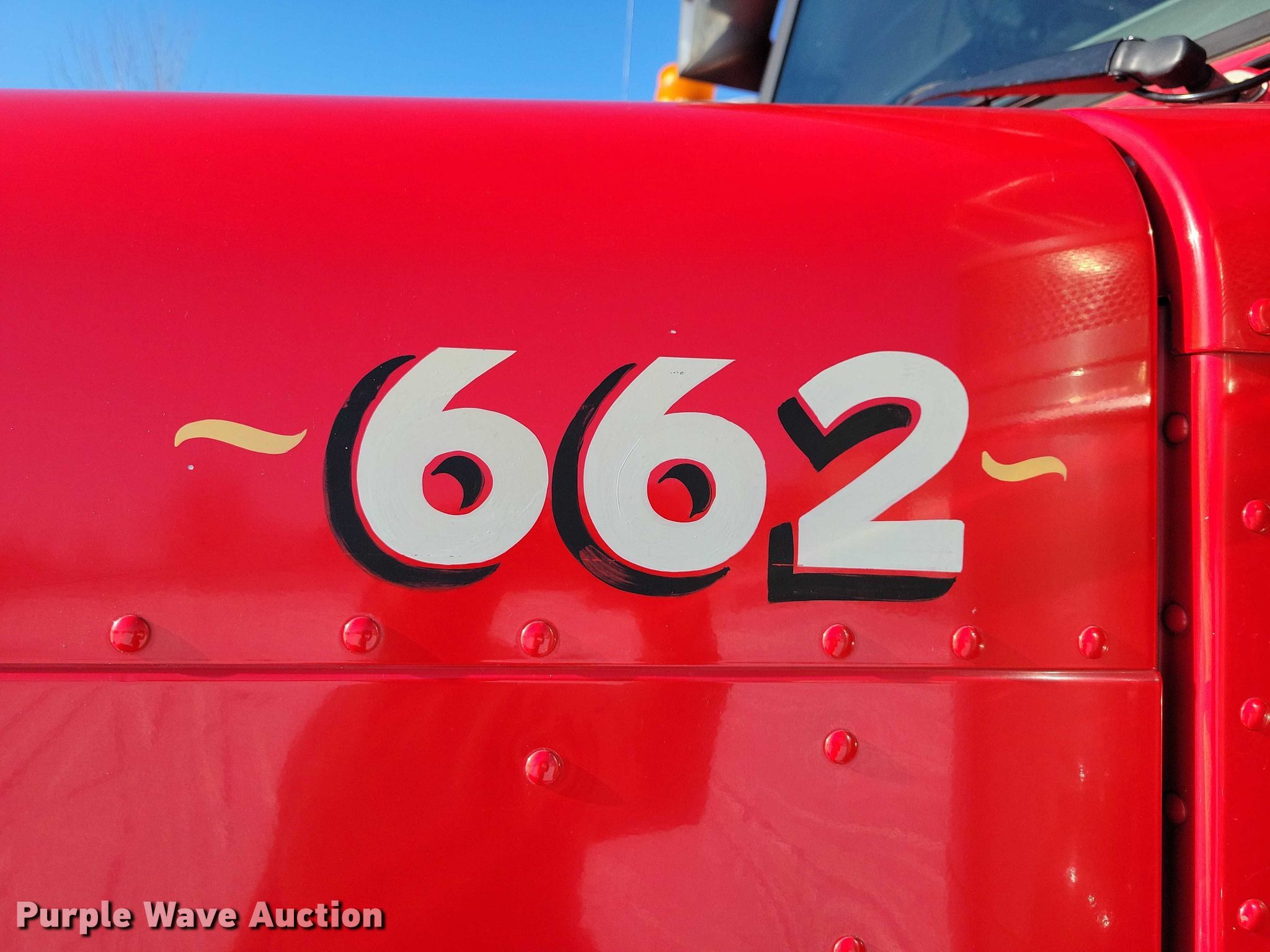 2007 Peterbilt 379 dump truck. Miles: 714,983 on odometer, Hours: 29,423 on meter, VIN: 1NP5LU0X17N695936, Unit #: 662. Engine Caterpillar C13 Acert, Displacement: 12.5L, Cylinders: 6, Fuel type: Diesel, HP: 525, kW: 391, Engine brake. Transmission Eaton Fuller, Manual, Speed: 10. Chassis Double frame, Axles: Triple, Pusher axle Steerable, Differential lock: Full, Suspension: Air Dump valves, Brakes: Air, PTO, GVWR: 69,760 lbs FAWR: 18,740 lbs, IAWR: 20,000 lbs, RAWR: 20,000 lbs, Lift axle GAWR: 11,020 lbs. Interior AC, Heat, Heated mirrors, Power windows, Cruise control. Features Bed Dump bed, Bibeau, Length: 16', Width: 97", Side height: 48", Bed type: Steel, Ram: Single, End gate: Air operated. Tires Front: 385/65R22.5, Rear: 11R22.5, Lift axle: 255/70R22.5. Notes Floor mats not included, Radio not included, Dash warning indicator: ABS, Windshield chipped or cracked. Minnesota title. Title has a lien that will be released following the close of the auction. Title distribution may be delayed up to 30 days from verification of funds. Arnt Construction Retirement - Open House: March 26th and April 7th. Hugo, MN 55038