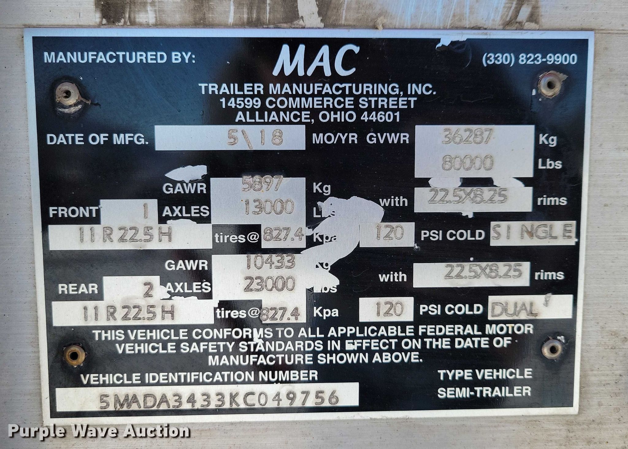 Purple Wave is selling a used End Dump Rock Trailer in Minnesota. This item is a 2019 Mac Mac Trailer Manufacturing end dump trailer with the following: VIN: 5MADA3433KC049756, Unit #: TR73