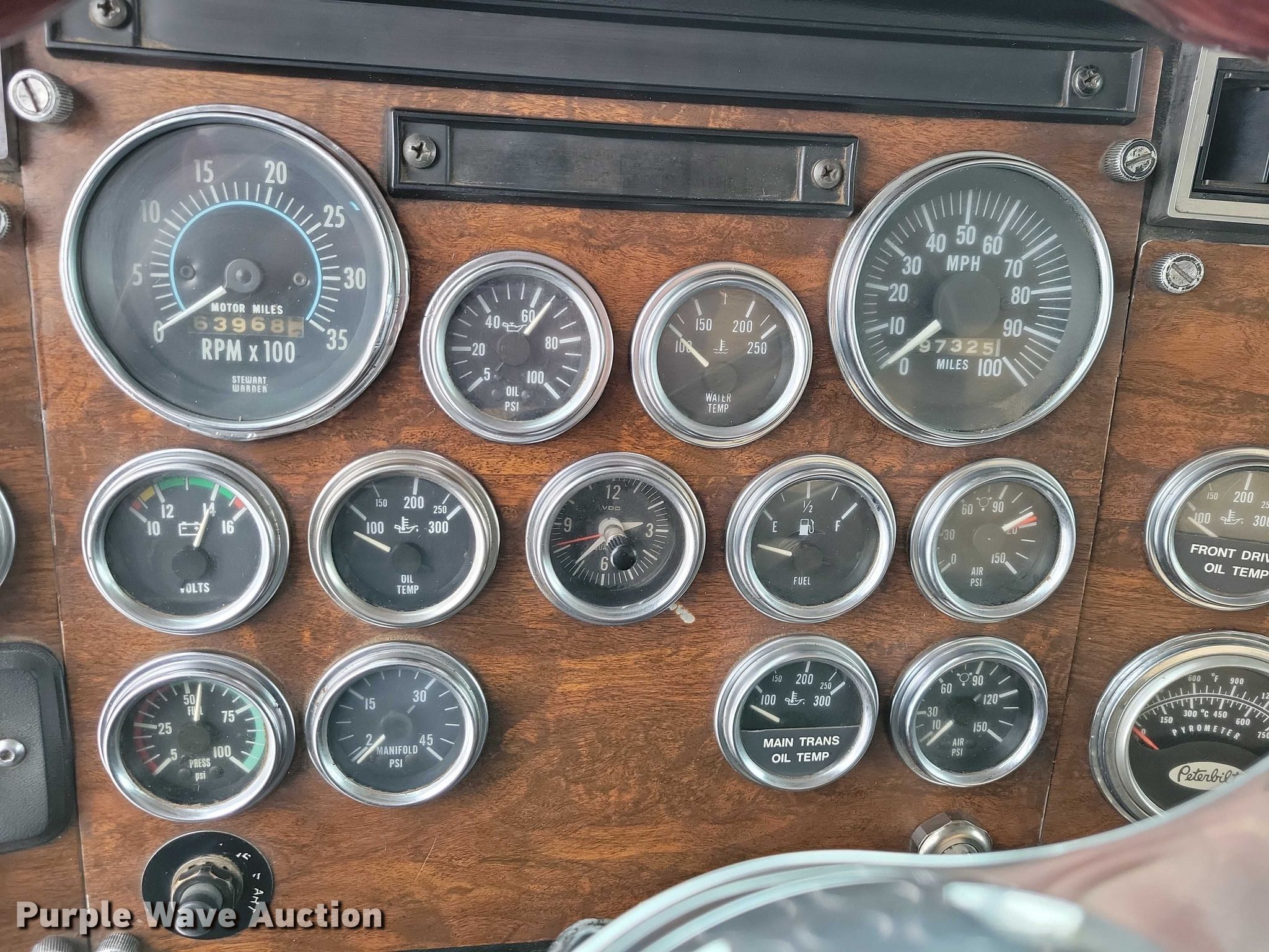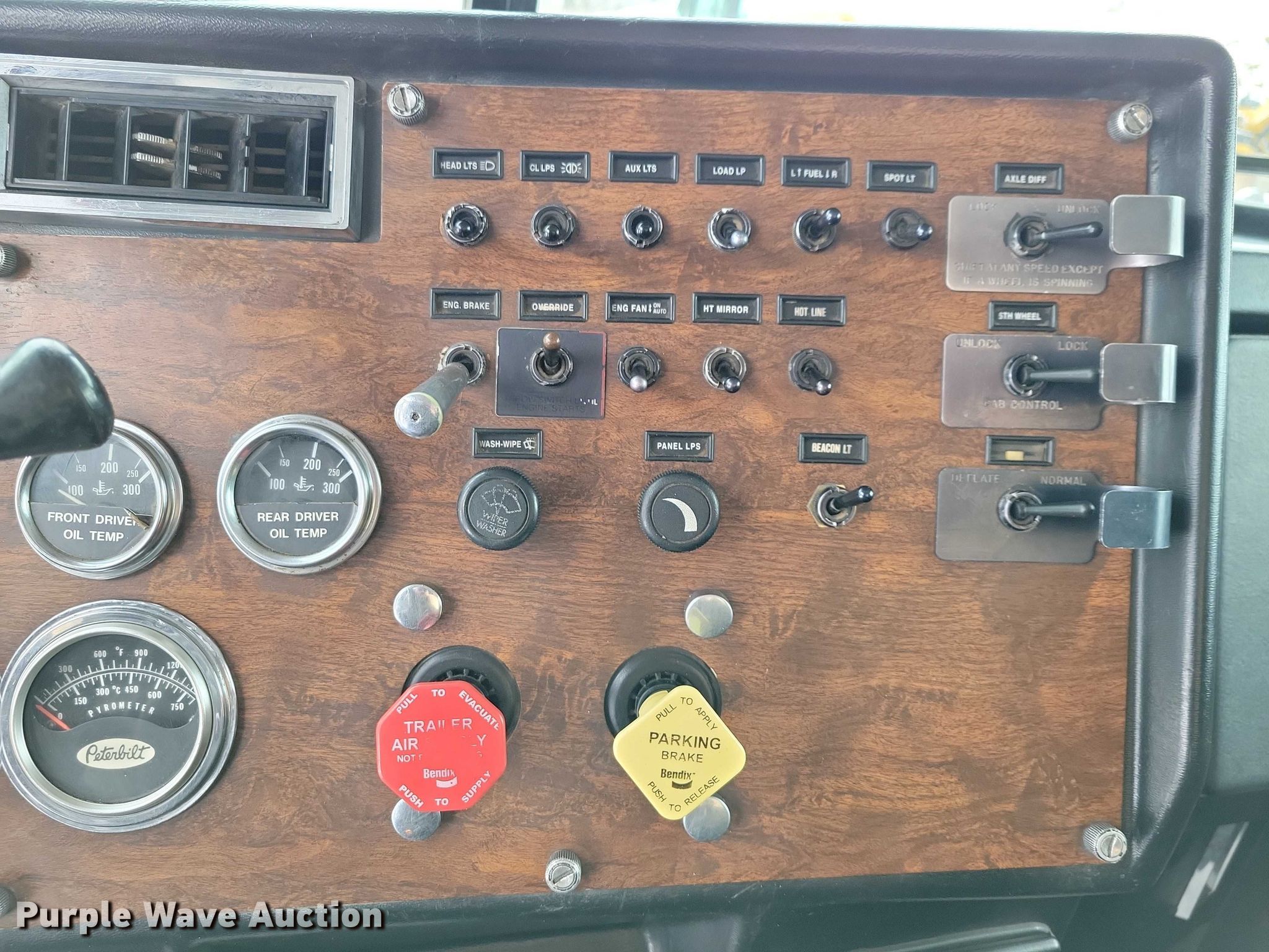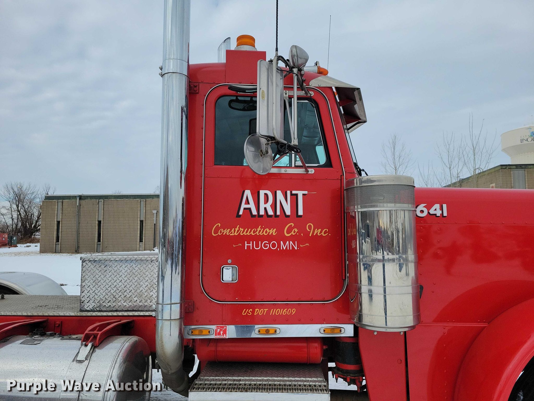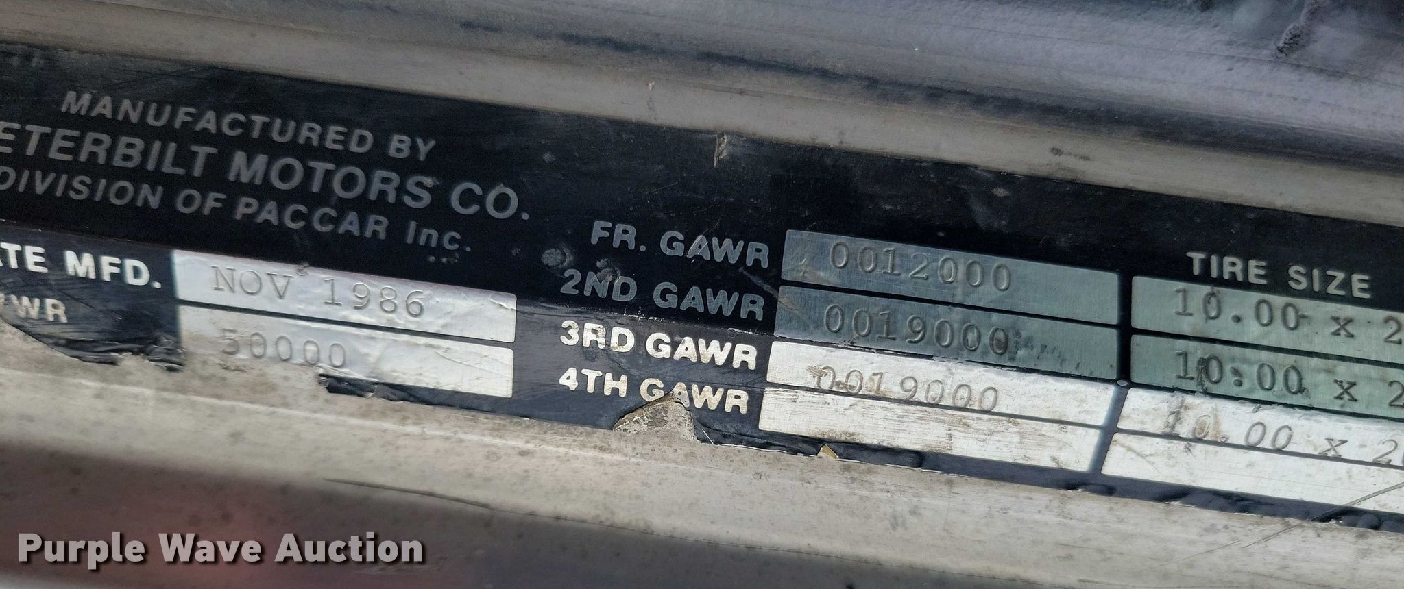 1987 Peterbilt 379 semi truck. Miles: 597,325 on odometer, Hours: 6,417 on meter, VIN: 1XP5DB9XXHN212200, Unit #: 641. Engine Caterpillar 3406B, Displacement: 14.6L, Cylinders: 6, Fuel type: Diesel. Transmission Eaton Fuller, Manual, Speed: 15. Chassis Axles: Triple, Pusher axle, Differential lock: Inter-axle, Suspension: Air Dump valves, Brakes: Air, GVWR: 50,000 lbs FAWR: 12,000 lbs, IAWR: 19,000 lbs, RAWR: 19,000 lbs. Interior AC, Heat, Heated mirrors, Air ride cab. Features Deck plate: Aluminum, Fifth wheel type: Air operated, Sliding, Fuel tank: Dual. Tires Size: 11R22.5. Notes Windshield chipped or cracked. Minnesota title. Title has a lien that will be released following the close of the auction. Title distribution may be delayed up to 30 days from verification of funds. Arnt Construction Retirement - Open House: March 26th and April 7th. Hugo, MN 55038
