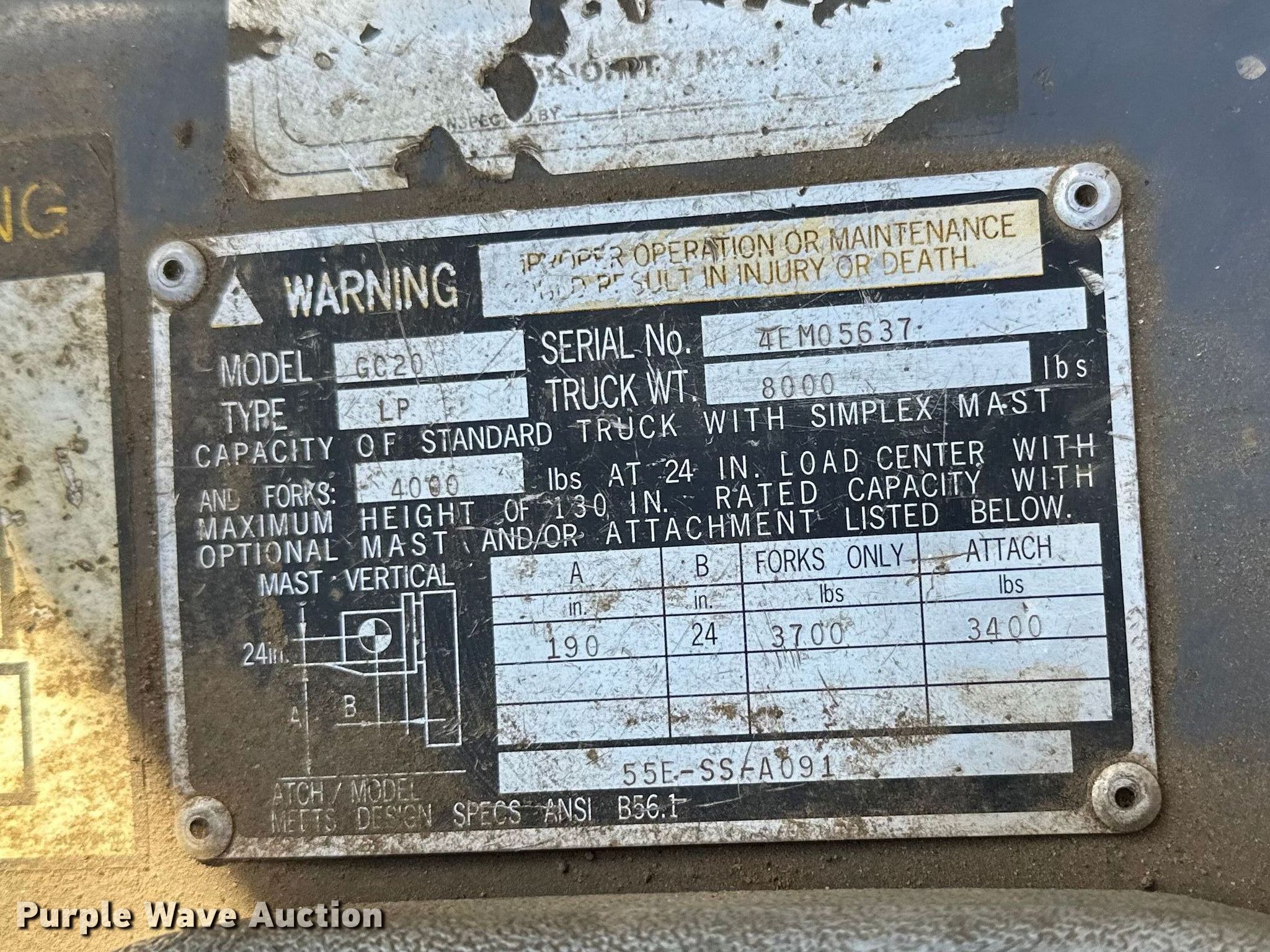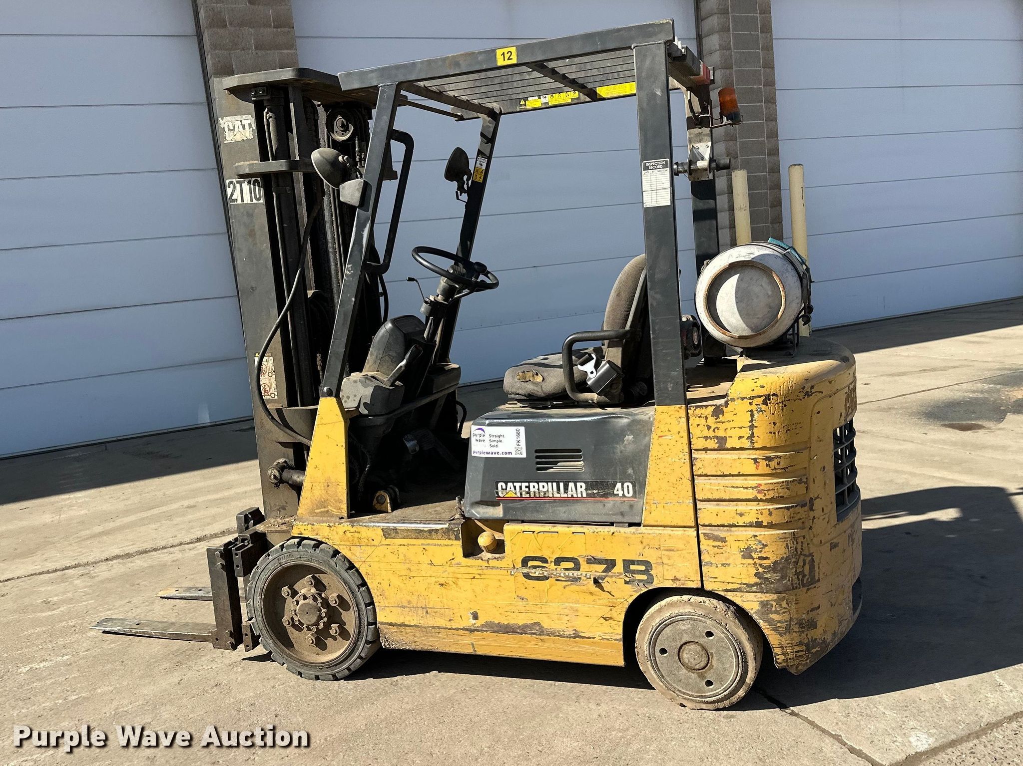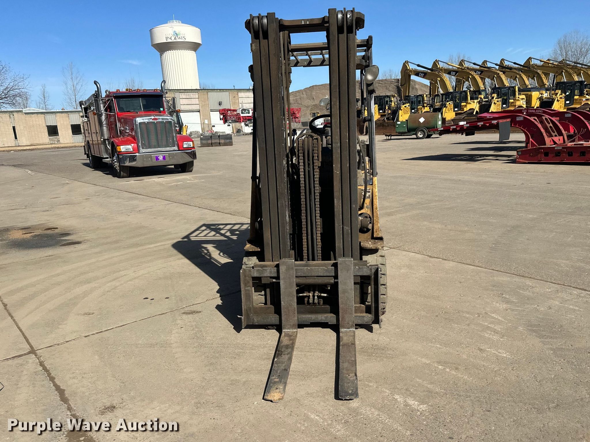 Caterpillar GC20 forklift. Hours: 4,591 on meter, Miles or hours may vary, unit still in use, Serial: 4EM05637. Engine Cylinders: 4, Fuel type: LPG LP bottle: Included. Transmission Automatic. Features Maximum lift capacity: 3,400 lbs, Maximum lift height: 190", Collapsed mast height: 84", Mast stages: 3, Side shift, Fork length: 32". Tires Front: 21x7x15, Solid. Pursuant to Minnesota law, Purple Wave will not be collecting sales taxes on any of the purchases made in this business liquidation auction. Arnt Construction Retirement - Open Inspection March 26th and April 7th. Hugo, MN 55038