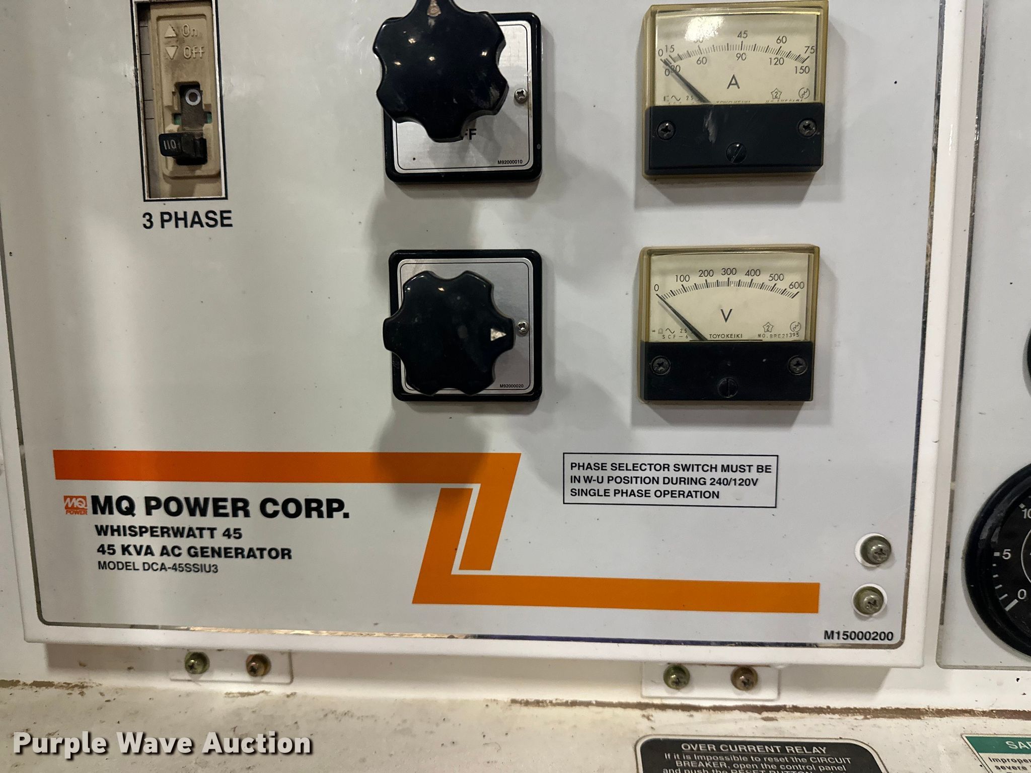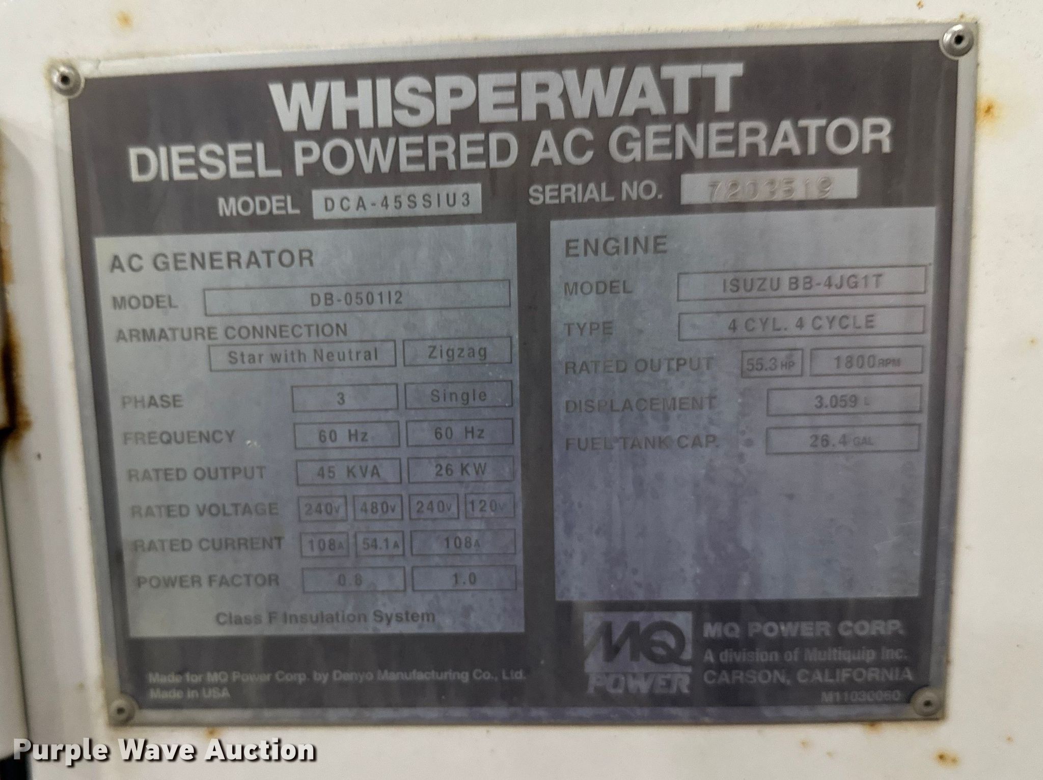 Purple Wave is selling a used Generator Set in Minnesota. This item is a Whisperwatt DCA-45SSIU3 generator with the following: Hours: 13,993 on meter, Serial: 7203519