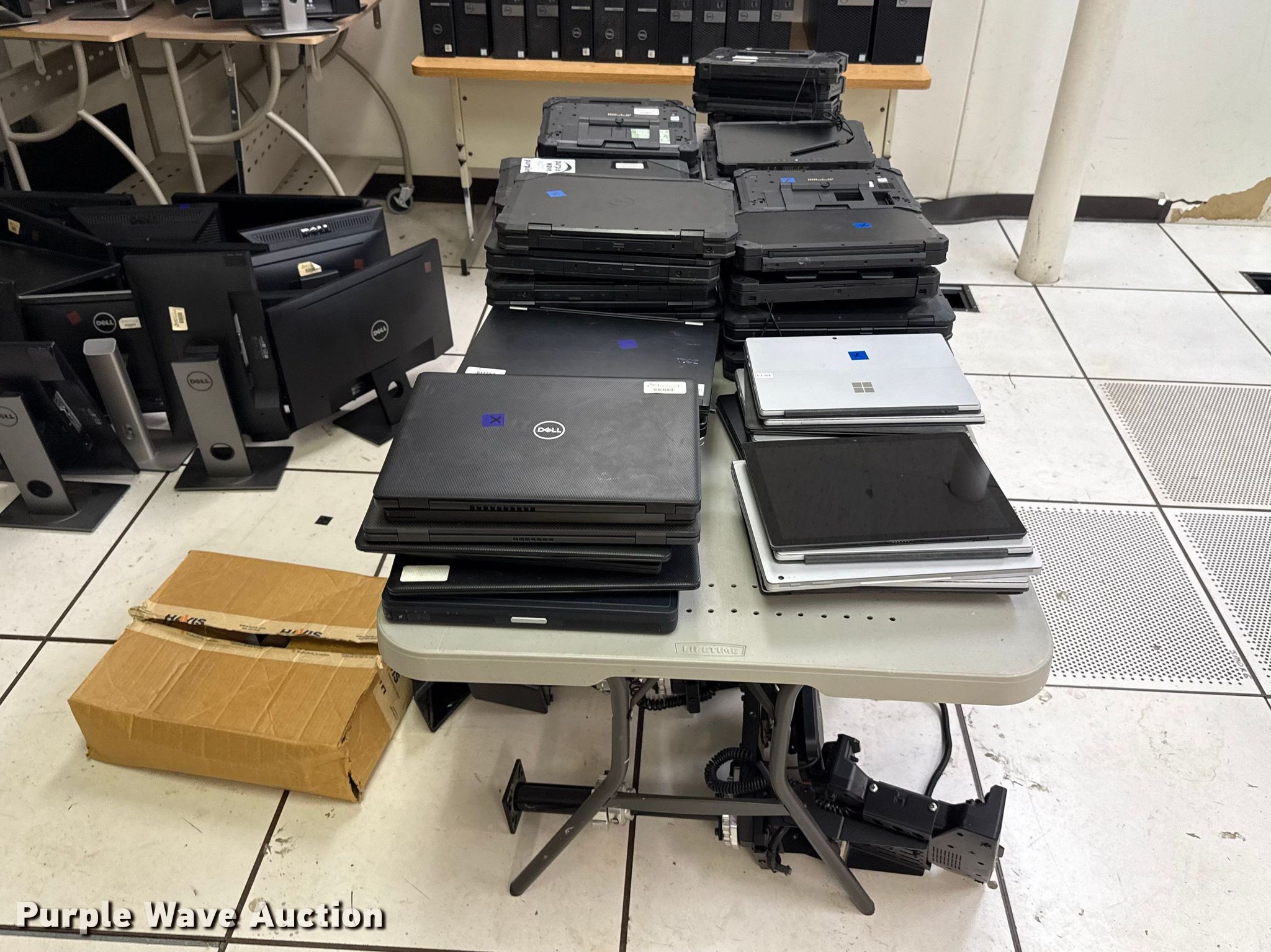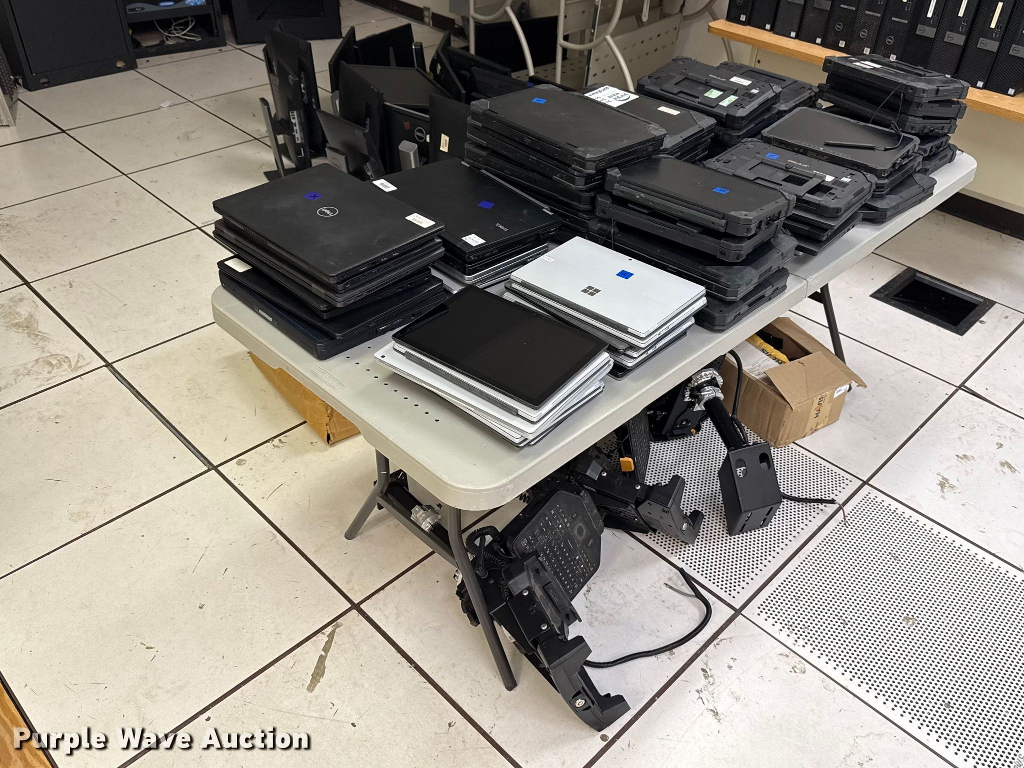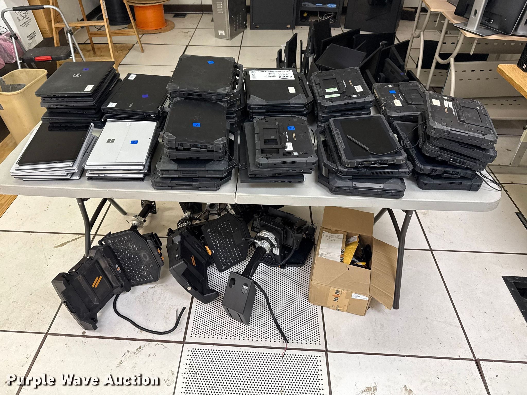 Purple Wave is selling a used Computers in Oklahoma. This item is a Computers with the following: (40) Dell laptops, (19) Microsoft Surface Pro laptops, (4) Havis vehicle computer mounts