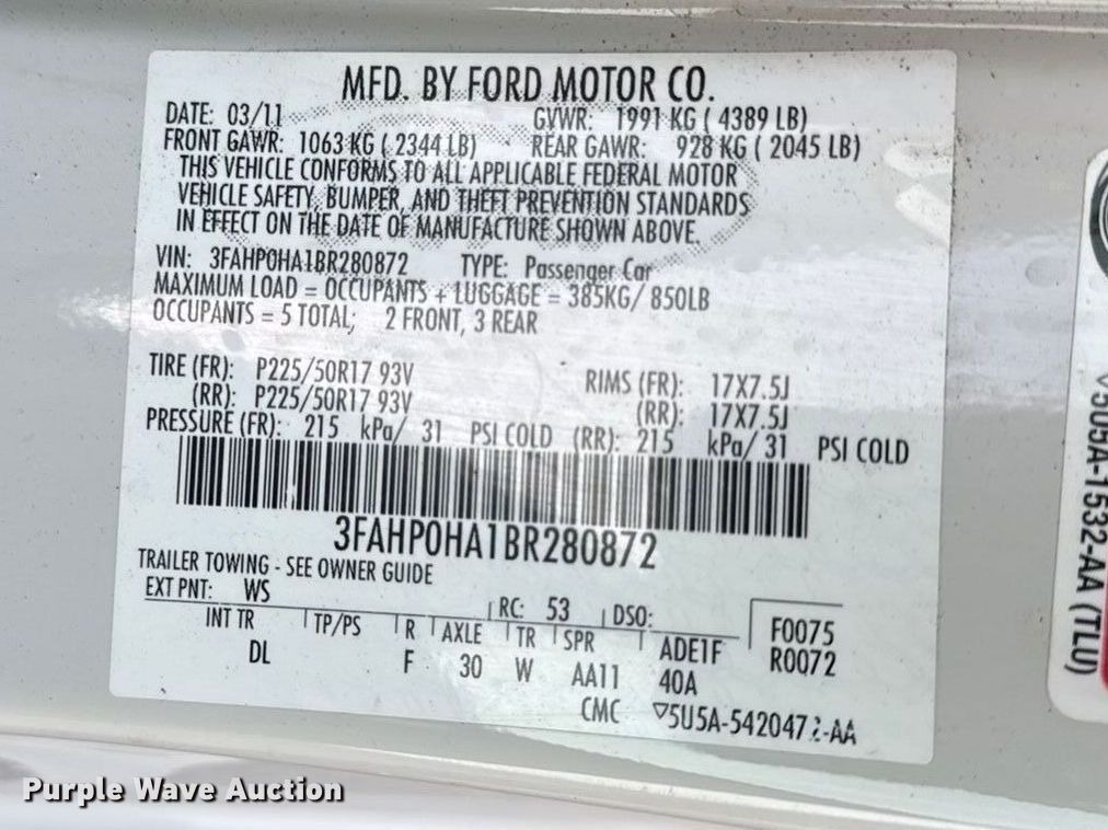 Purple Wave is selling a used Passenger Vehicle in Kansas. This item is a 2011 Ford Fusion with the following: Miles: 63,349 on odometer, VIN: 3FAHP0HA1BR280872