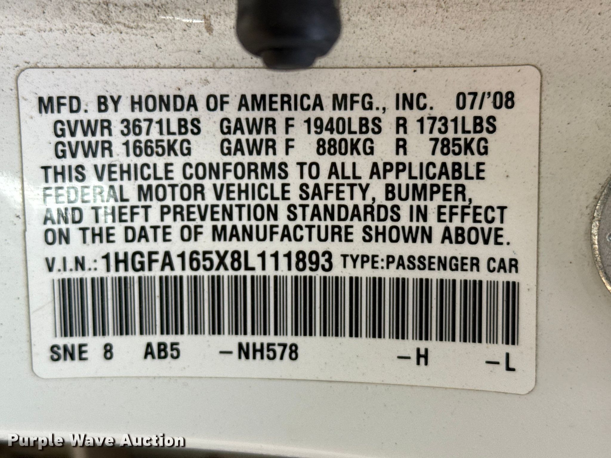 Purple Wave is selling a used Passenger Vehicle in Kansas. This item is a 2008 Honda Civic with the following: Miles: 159,975 on odometer, VIN: 1HGFA165X8L111893