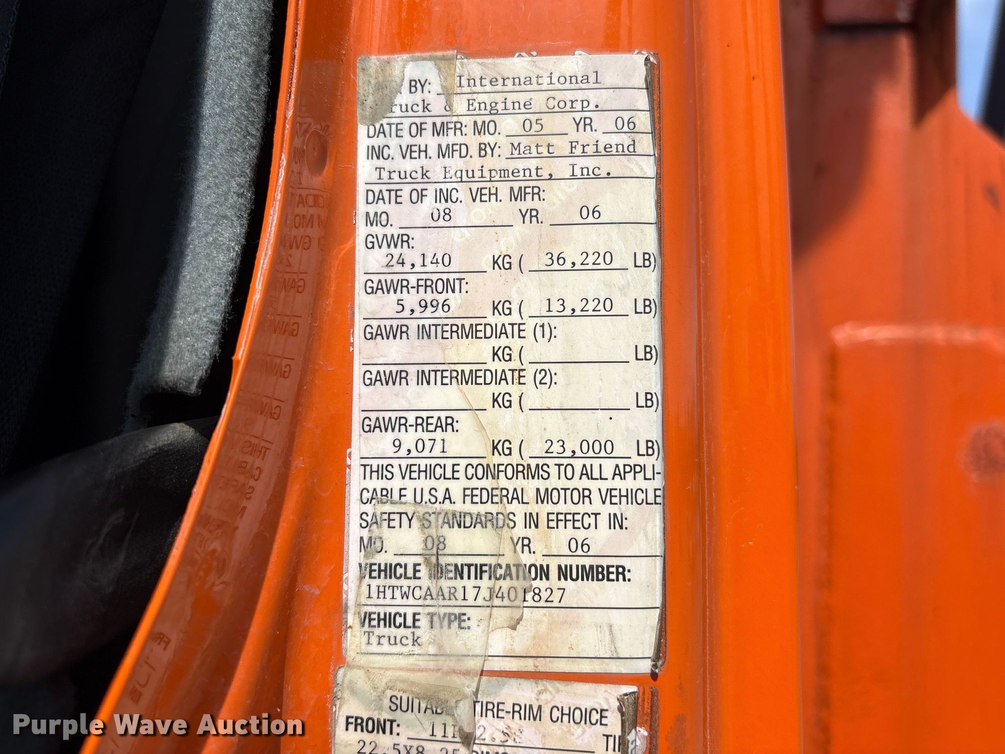 2007 International 7400 dump truck. Miles: 103,777 on odometer, Hours: 4,336 on meter, VIN: 1HTWCAAR17J401827. Engine International DT466, Displacement: 7.64L, Cylinders: 6, Fuel type: Diesel. Transmission Automatic. Chassis Axles: Single, Differential lock: Inter-axle, Suspension: Spring, Brakes: Air, PTO, GVWR: 36,220 lbs FAWR: 13,220 lbs, RAWR: 23,000 lbs, Wheelbase: 385". Interior Heat, Heated mirrors, Power windows, Cruise control, Brake controller. Features Bed Dump bed, Length: 10', Width: 96", Side height: 32", Bed type: Steel, Roll tarp, Ram: Single, End gate: Air operated, Plow Henke 13887, Width: 120". Tires Size: 11R22.5. Notes Starter issues, Non-operational unit. Nebraska title. Title distribution may be delayed up to 14 days from verification of funds. City of Lincoln - Fleet Services. Lincoln, NE 68504