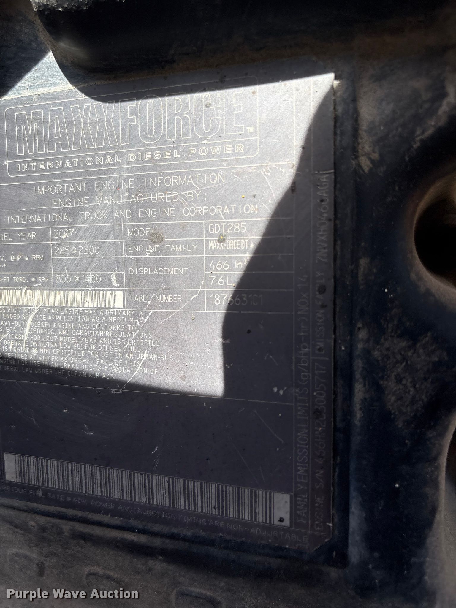 2008 International Workstar 7400 dump truck. Miles: 137,779 on odometer, Hours: 10,892 on meter, VIN: 1HTWGAAR48J637944. Engine Maxxforce GDT285, Serial: 466HM203005717, Displacement: 7.64L, Cylinders: 6, Fuel type: Diesel. Transmission Allison, Automatic. Chassis Axles: Tandem, Differential lock: Inter-axle, Suspension: Spring over walking beam, Brakes: Air, PTO, GVWR: 53,220 lbs FAWR: 13,220 lbs, IAWR: 20,000 lbs, RAWR: 20,000 lbs. Interior Heat, Heated mirrors, Power windows. Features Bed Dump bed, Length: 13', Width: 96", Side height: 32", Side board height: 12", Bed type: Steel, Roll tarp, Ram: Dual, End gate: Air operated, Spreader Durst 040806, Plow Henke 10883, Width: 120". Tires Size: 11R22.5. Notes Non-operational roll tarp. Nebraska title. Title distribution may be delayed up to 14 days from verification of funds. City of Lincoln - Fleet Services. Lincoln, NE 68504
