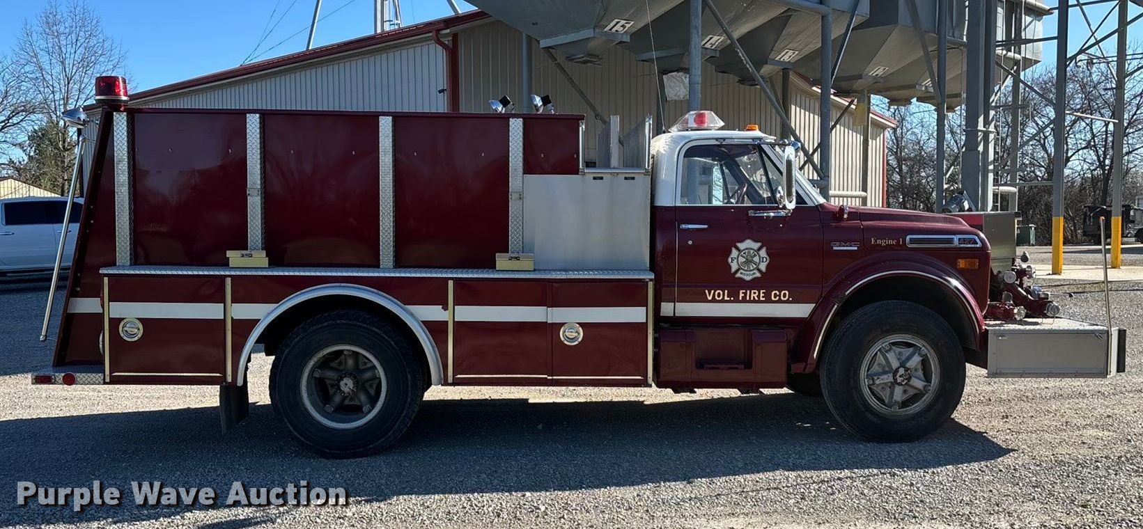 Purple Wave is selling a used Fire Truck or Emergency Vehicle in Missouri. This item is a 1969 GMC 6500 V-Eight pumper fire truck with the following: Miles: 10,822 on odometer, Hours: 1,325 on meter, VIN: CE60V-A093402, Unit #: Engine 1