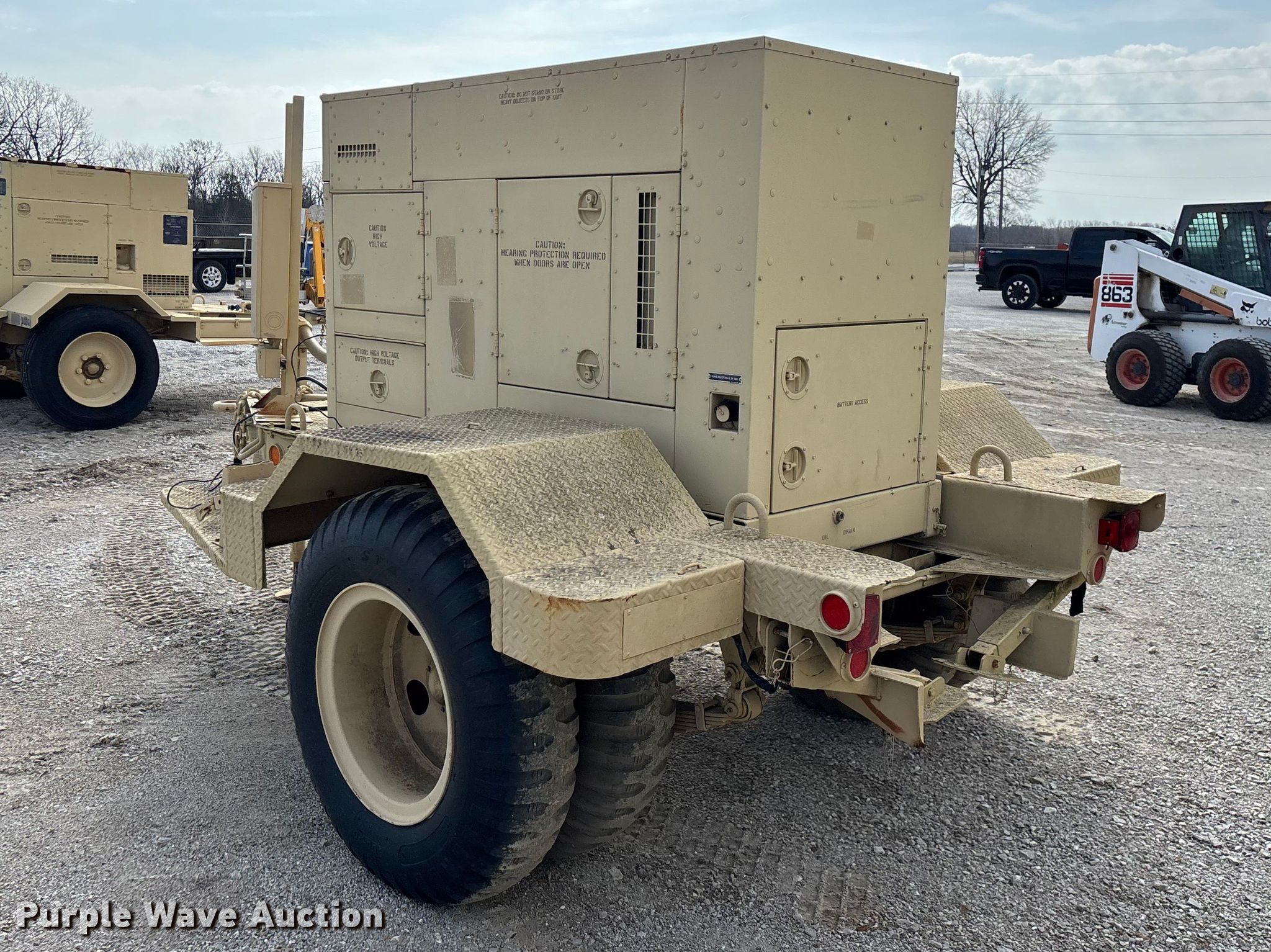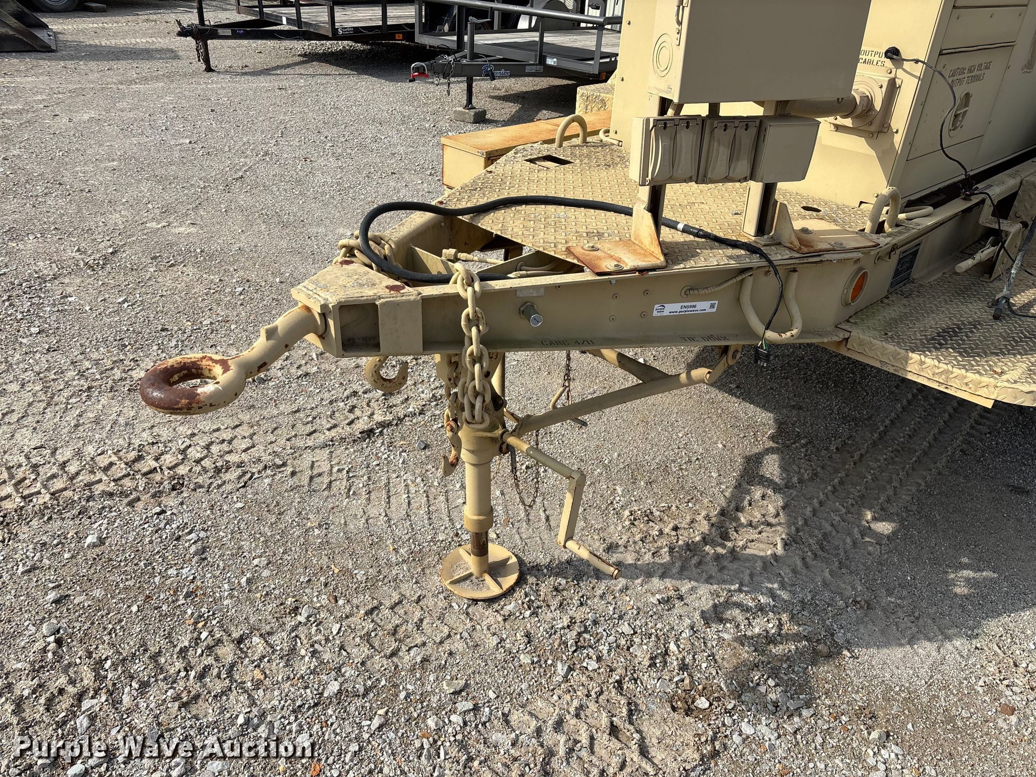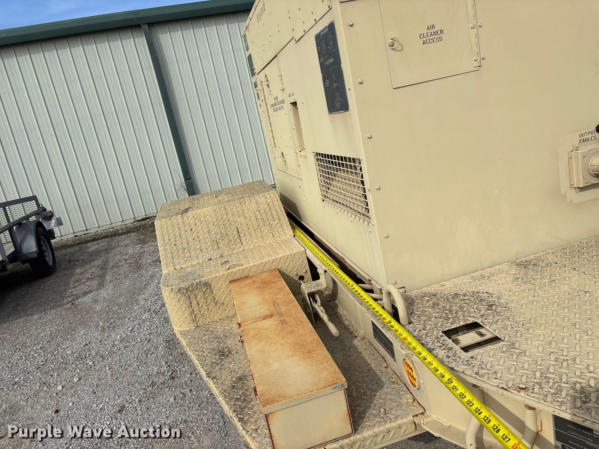 U.S. Department of Defense MEP-805A generator. Hours: 180 on meter, VIN: DS85-11638, Serial: T95086112. Engine John Deere, Serial: T04039T444300, Cylinders: 4, Fuel type: Diesel. Features Generator Military Design 88-21007, Serial: RZH00132, kVA: 31.2/38, kW: 25/30, Phase: Three, Electric start, Fuel tank. Trailer Libby Corp, 13' 10" L x 96" W, Hitch: Pintle, Suspension: Spring, Brakes: Air over hydraulic, Axles: Single, Tire size: 9.00-20. Notes Dead battery, Unknown operating condition. This is worksite support equipment and will not come with a title. Transfer of ownership documentation will be a bill of sale. Modoc Nation. Miami, OK 74354