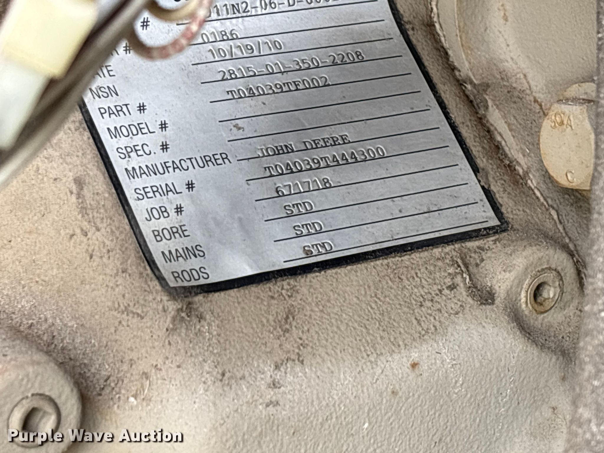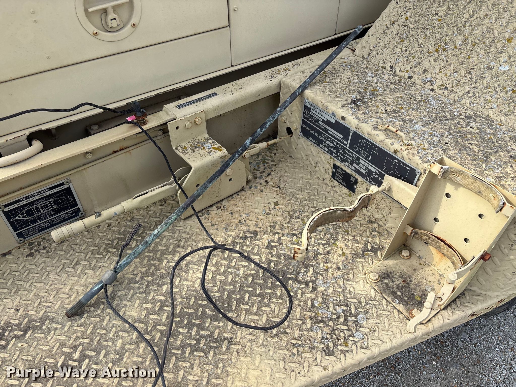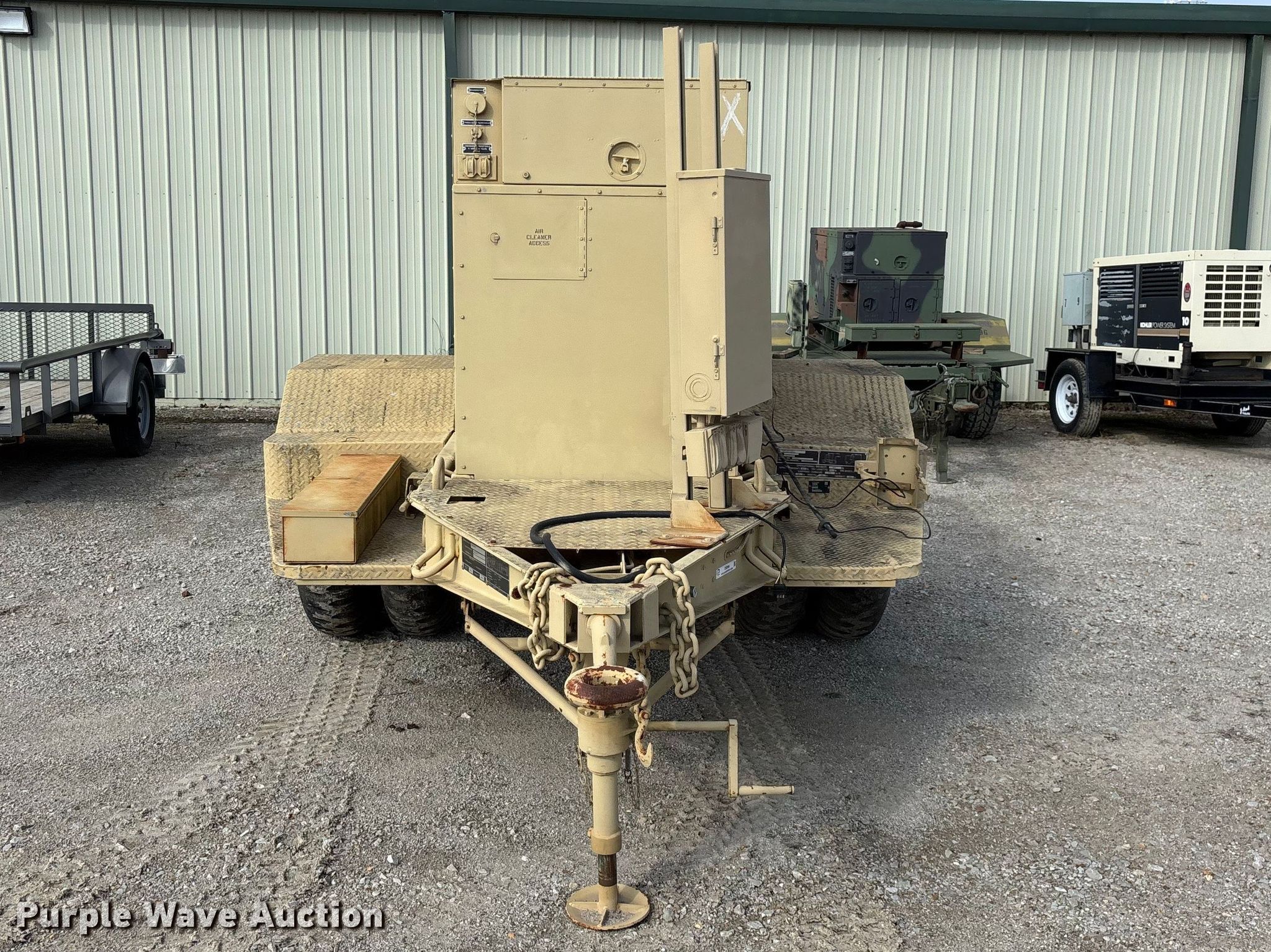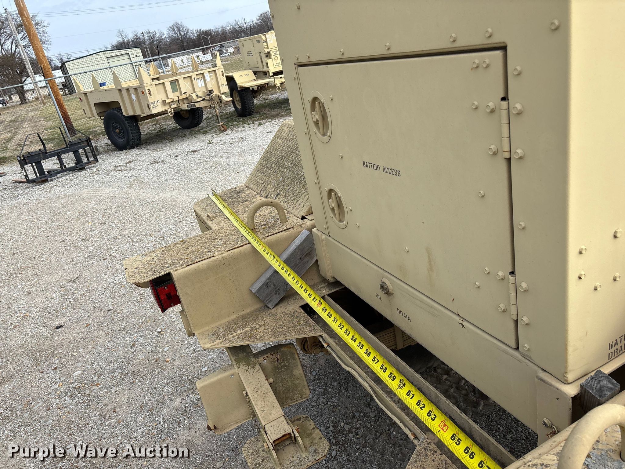 U.S. Department of Defense MEP-805A generator. Hours: 180 on meter, VIN: DS85-11638, Serial: T95086112. Engine John Deere, Serial: T04039T444300, Cylinders: 4, Fuel type: Diesel. Features Generator Military Design 88-21007, Serial: RZH00132, kVA: 31.2/38, kW: 25/30, Phase: Three, Electric start, Fuel tank. Trailer Libby Corp, 13' 10" L x 96" W, Hitch: Pintle, Suspension: Spring, Brakes: Air over hydraulic, Axles: Single, Tire size: 9.00-20. Notes Dead battery, Unknown operating condition. This is worksite support equipment and will not come with a title. Transfer of ownership documentation will be a bill of sale. Modoc Nation. Miami, OK 74354