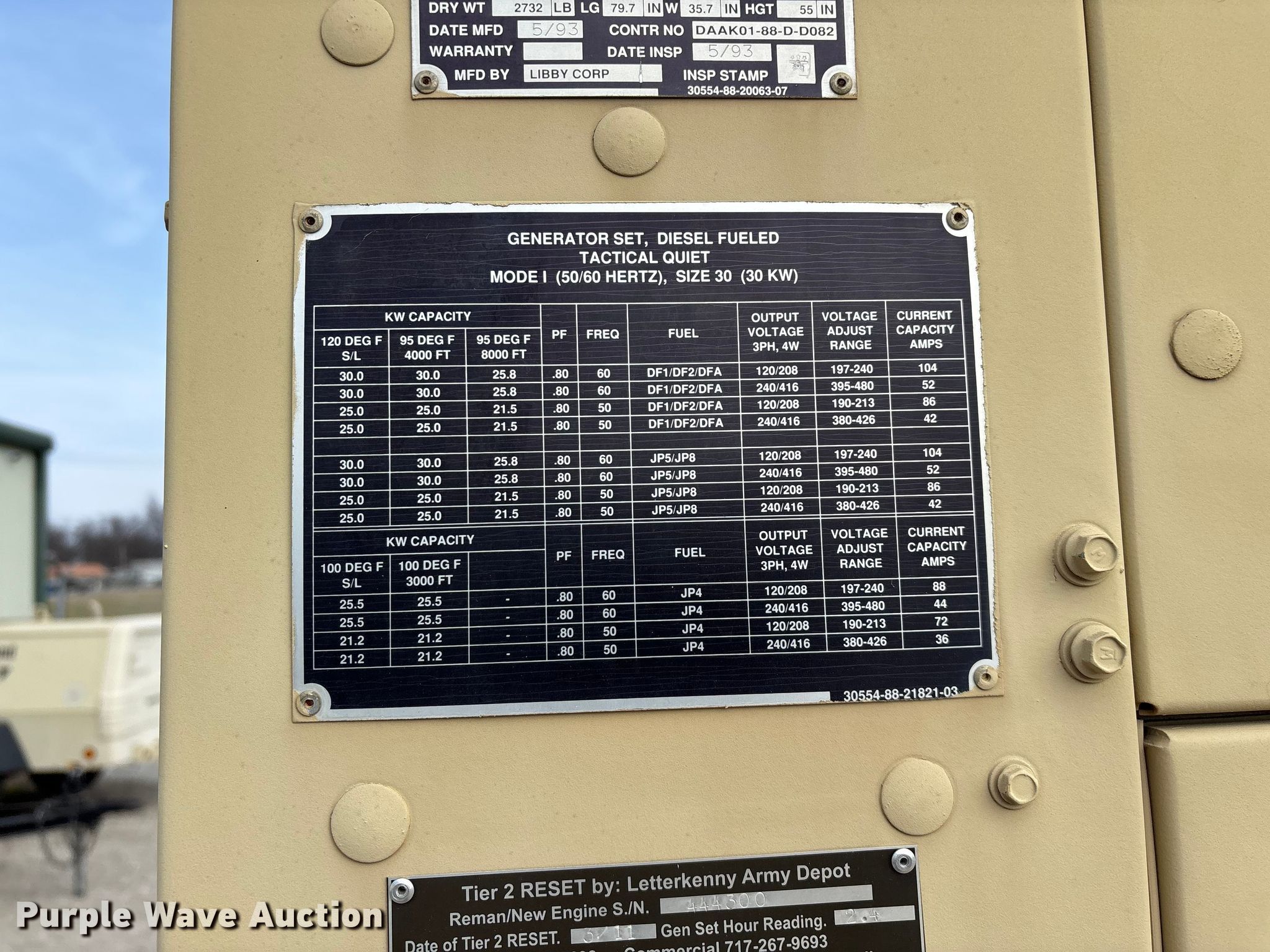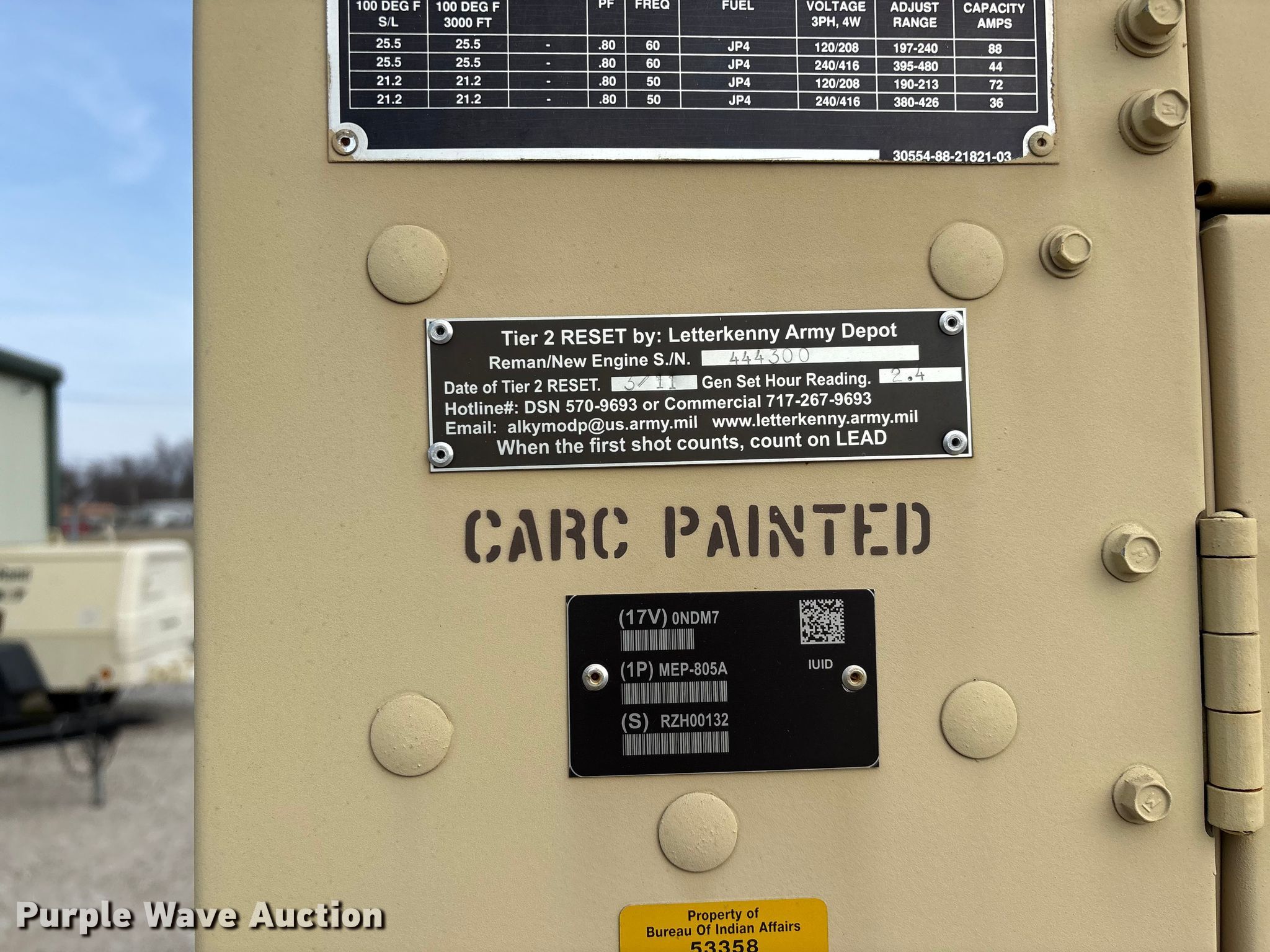 U.S. Department of Defense MEP-805A generator for sale in Miami, Oklahoma. Item EN5996 will sell on April 14th, 2026.