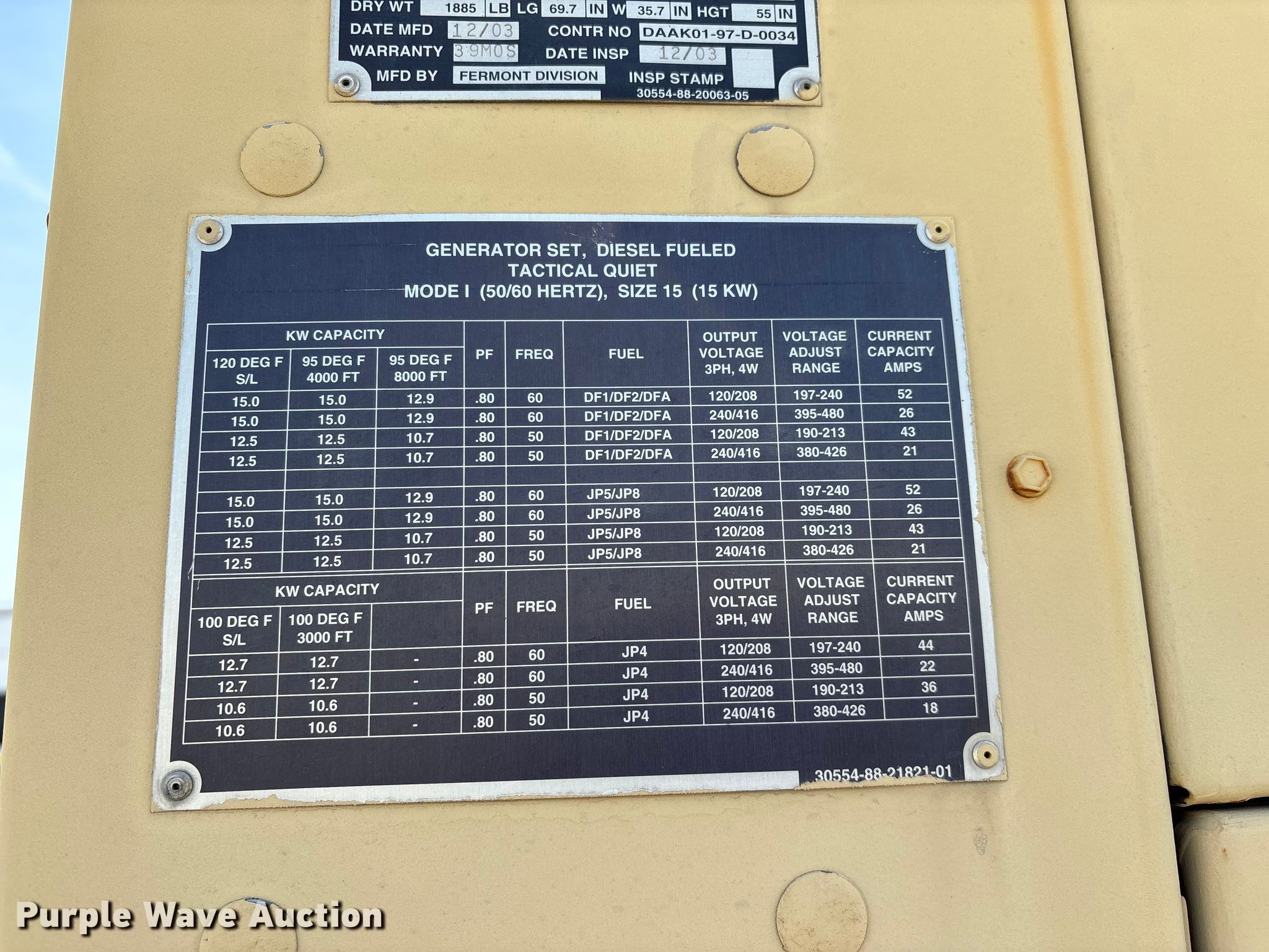 US Department of Defense MEP-804A generator for sale in Miami, Oklahoma. Item EN5997 will sell on April 14th, 2026.