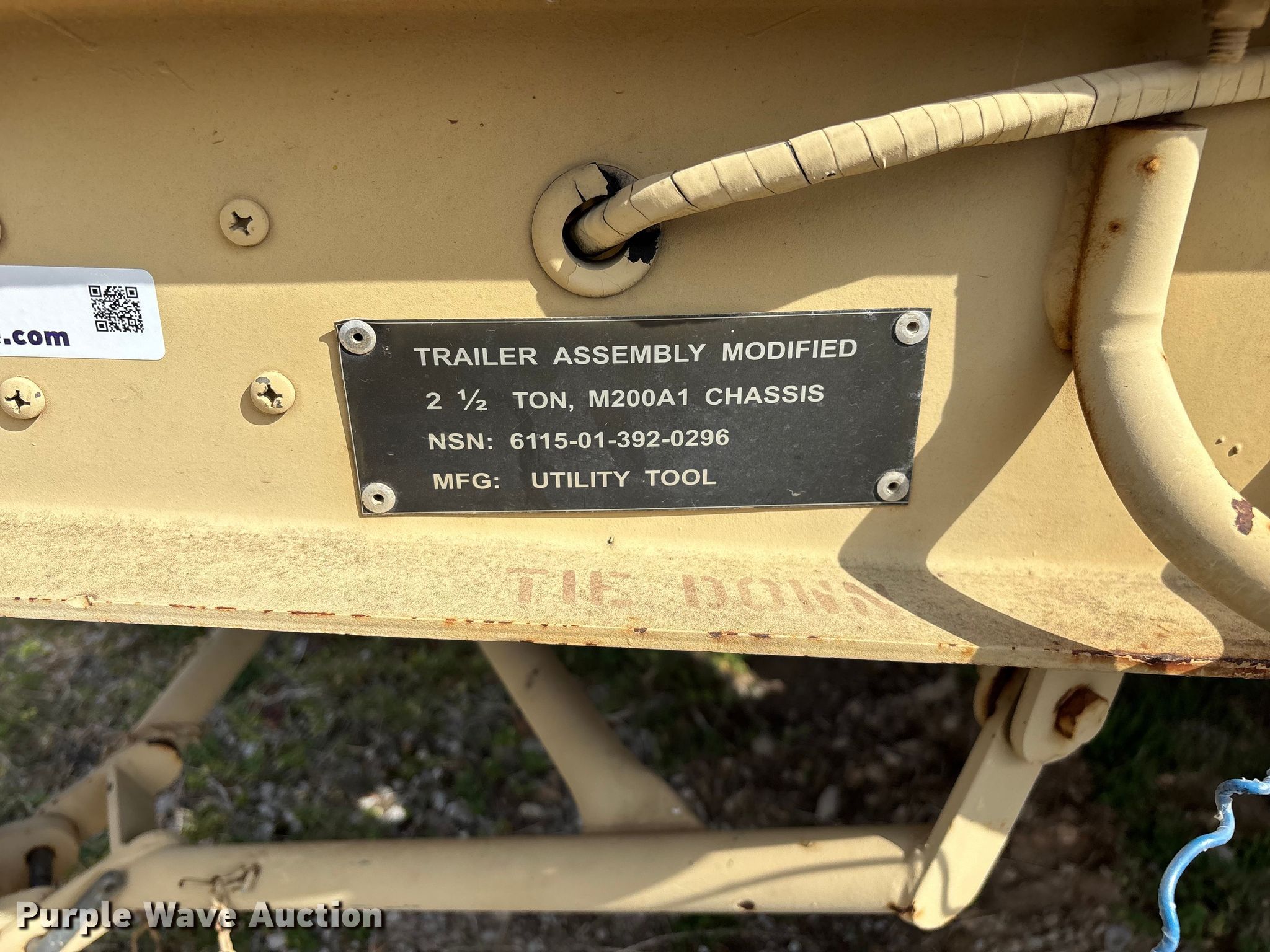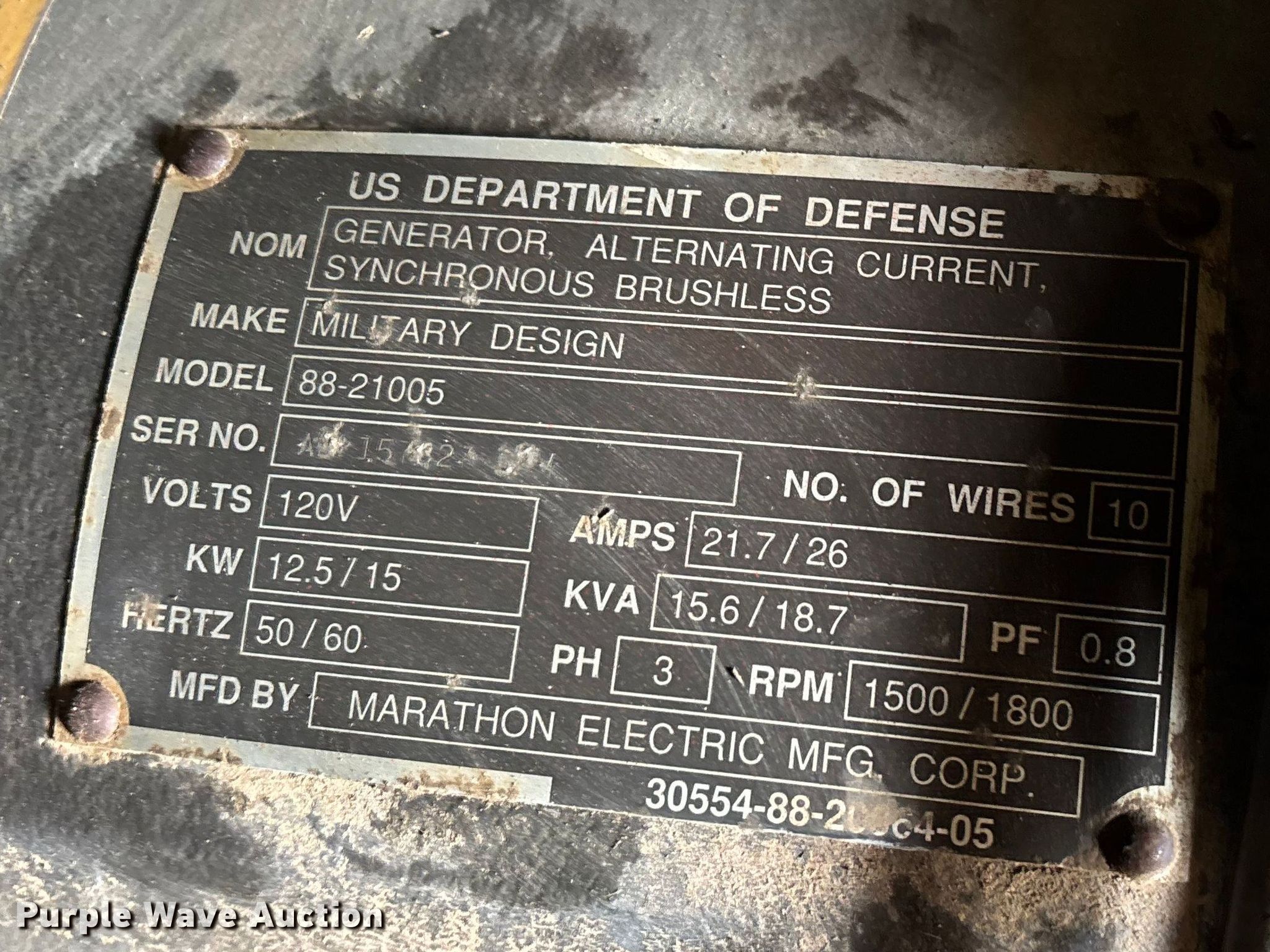 U.S Department of Defense MEP-804A generator. Hours: 2,238 on meter, VIN: 1291, Serial: T01194043. Engine Isuzu, Cylinders: 4, Fuel type: Diesel. Features Generator Military Design 88-21005, Serial: FZ58395, Phase: Three, kW: 12.5/15, kVA: 15.6/18.7, Electric start, Fuel tank. Trailer Utility Tool & Body Co. Inc., 13' 10" L x 96" W, Hitch: Pintle, Suspension: Spring, Brakes: Air over hydraulic, Axles: Single, Tire size: 10R22.5. Notes No batteries, Oil filter missing, No oil, Tire damaged, dry rot, Unknown operating condition. This is worksite support equipment and will not come with a title. Transfer of ownership documentation will be a bill of sale. Modoc Nation. Miami, OK 74354