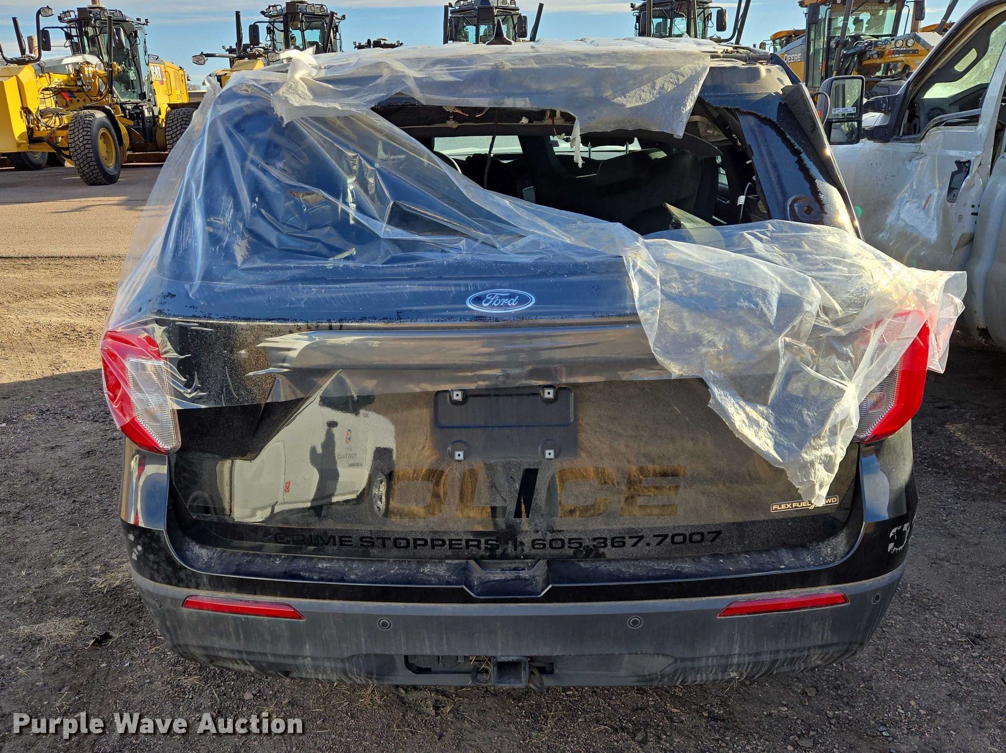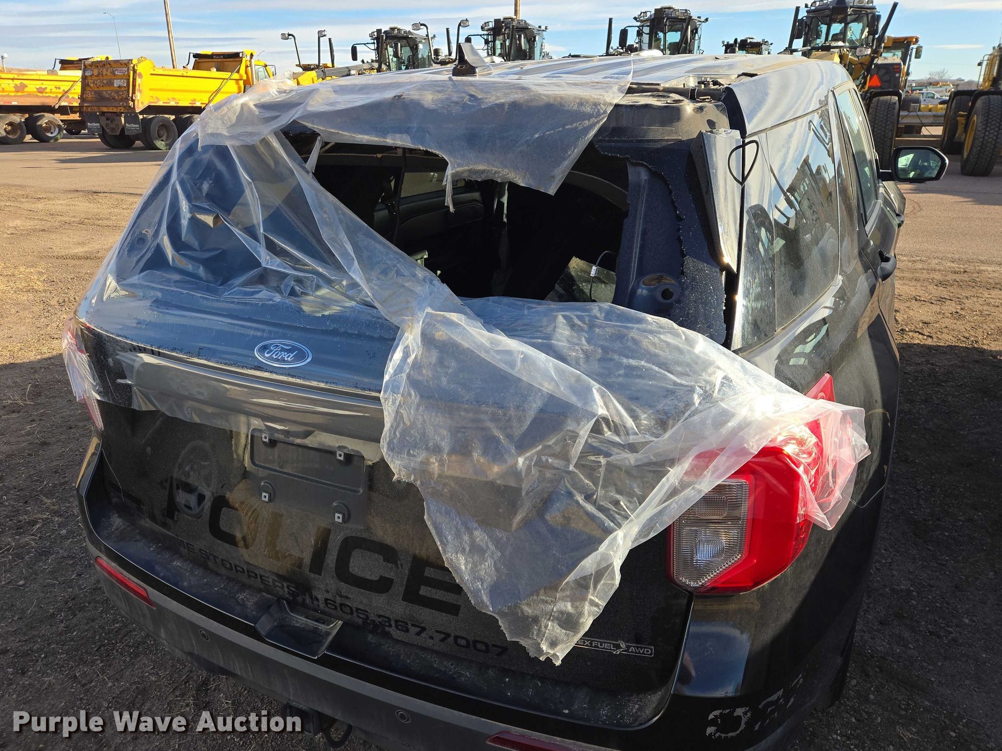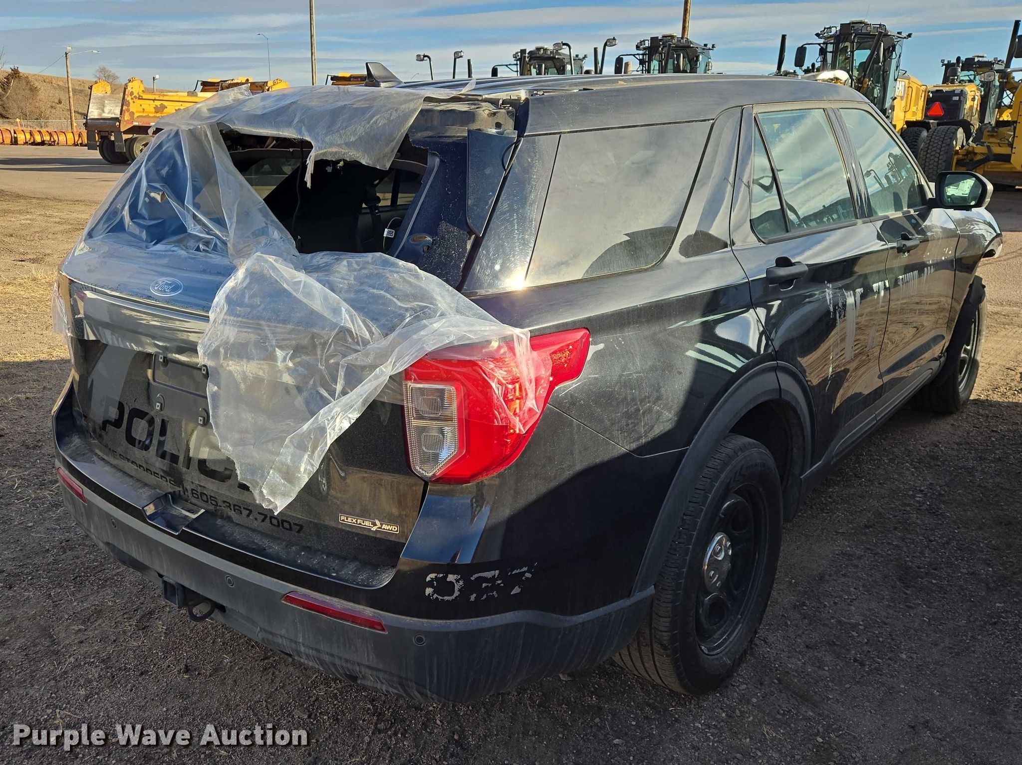 2020 Ford Explorer Police Interceptor SUV. Miles: 62,296 on odometer, Hours: 9,018 on meter, VIN: 1FM5K8AB7LGB22814, Unit #: 51-5. Engine Displacement: 3.3L, Cylinders: 6, Fuel type: Gas. Transmission Automatic, All wheel drive. Interior AC, Heat, Seat: Power driver, Power windows, Power locks, Cruise control, Backup camera. Tires Size: 255/60R18. Notes Dash warning indicator: Check engine, Airbag, Windshield chipped or cracked, Jump start required during on-site data collection, Center console missing, Collision damage , Unit must be towed or hauled , Non-operational unit. South Dakota title. Title distribution may be delayed up to 14 days from verification of funds. City of Sioux Falls-Fleet. Sioux Falls, SD 57104