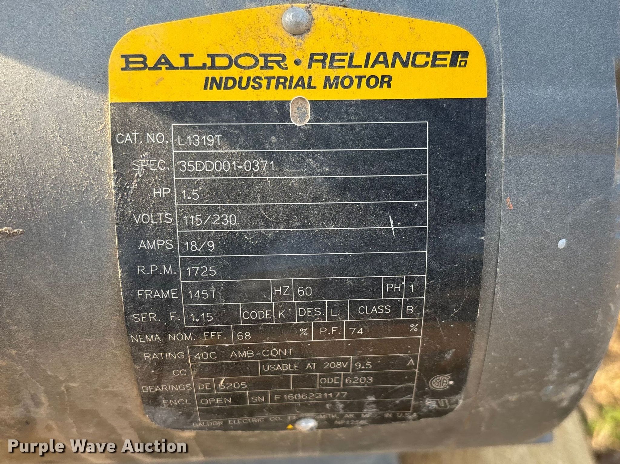Purple Wave is selling a used Electric Motor in Kansas. This item is a (2) Baldor electric motors with the following: Phase: Single, HP: 1.5, Volts: 115/230, RPM: 1,725