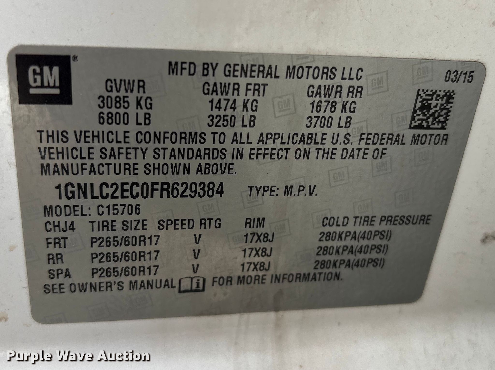 Purple Wave is selling a used Passenger Vehicle in Oklahoma. This item is a 2015 Chevrolet Tahoe SUV with the following: Miles: 122,574 on odometer, Hours: 14,129 on meter, VIN: 1GNLC2EC0FR629384
