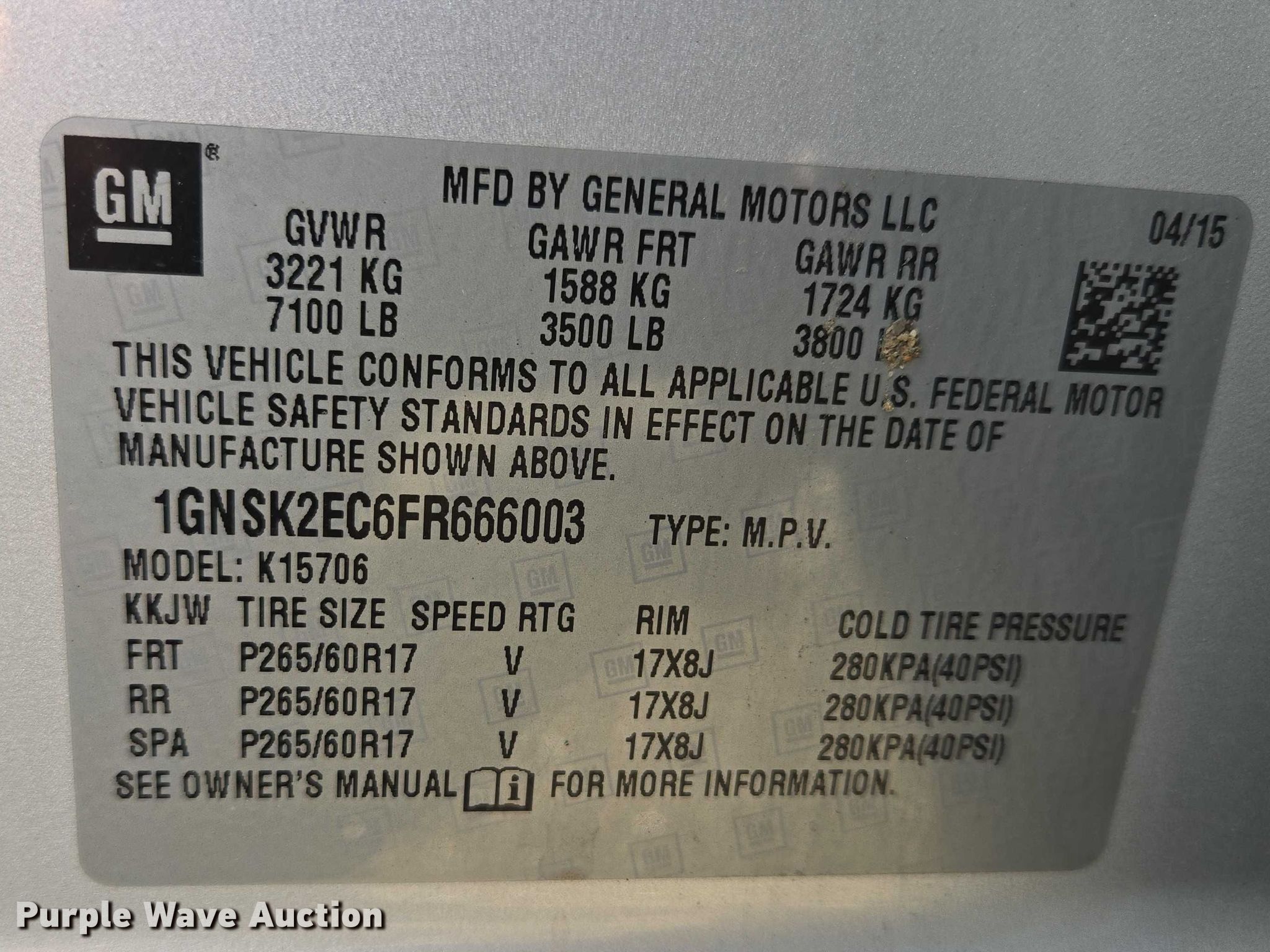 - VIN: 1GNSK2EC6FR666003