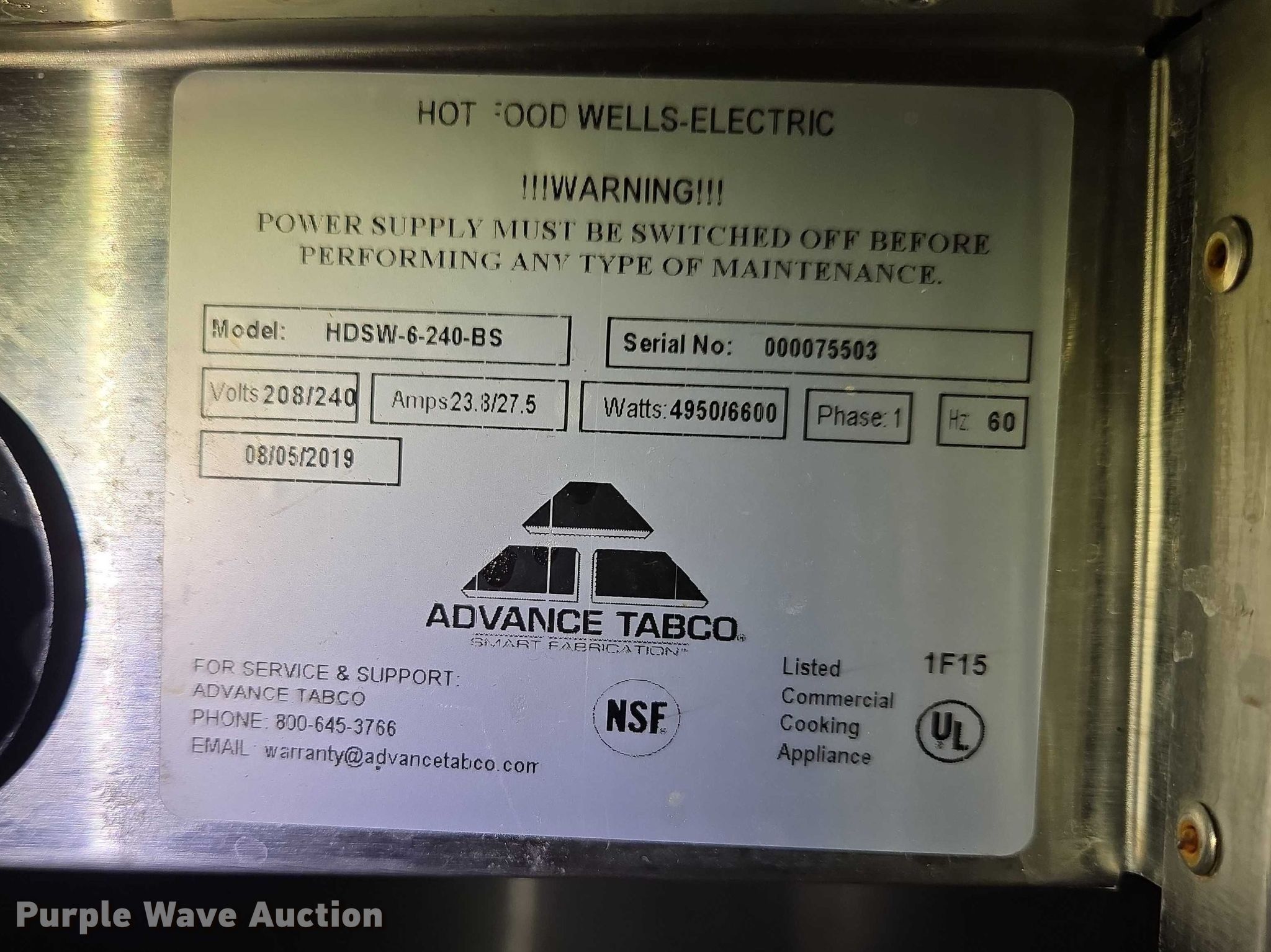 Purple Wave is selling a used Restaurant Equip. in South Dakota. This item is a Advance Tabco HDSW-6-240-BS hot food table with the following: Serial: 000075503
