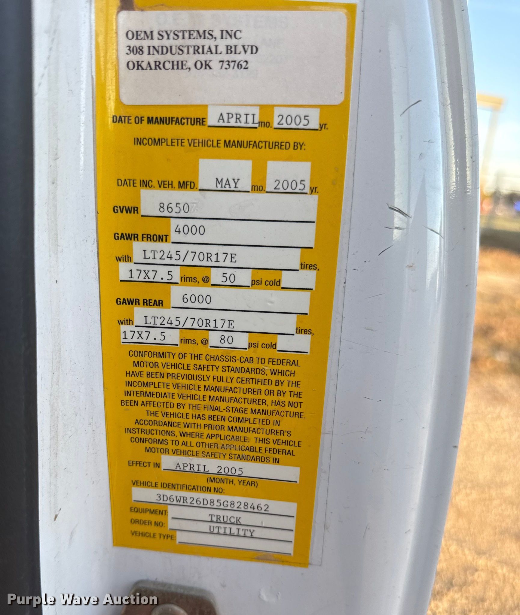 2005 Dodge Ram 2500 utility bed pickup truck. Miles: 62,770 on odometer, VIN: 3D6WR26D85G828462. Engine Displacement: 5.7L, Cylinders: 8, Fuel type: Gas. Transmission Automatic. Interior AC, Heat. Features Bed Utility bed, Stahl, Length: 8', Width: 78". Tires Size: 245/70R17. Kansas title. Title distribution may be delayed up to 14 days from verification of funds. City of Burlington. Burlington, KS 66839