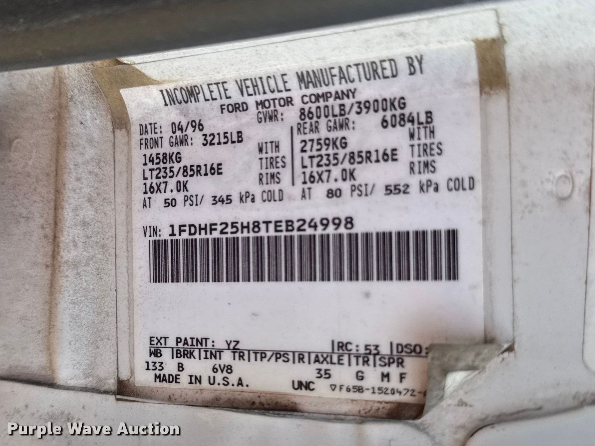 1996 Ford F250 utility bed pickup truck. Miles: 97,513 on odometer, VIN: 1FDHF25H8TEB24998. Engine Displacement: 5.8L, Cylinders: 8, Fuel type: Gas. Transmission Automatic. Interior AC, Heat. Features Bed Utility bed, Knapheide, Length: 8', Width: 78". Tires Size: 235/80R16. Notes Jump start required during on-site data collection. Kansas title. Title distribution may be delayed up to 14 days from verification of funds. City of Burlington. Burlington, KS 66839