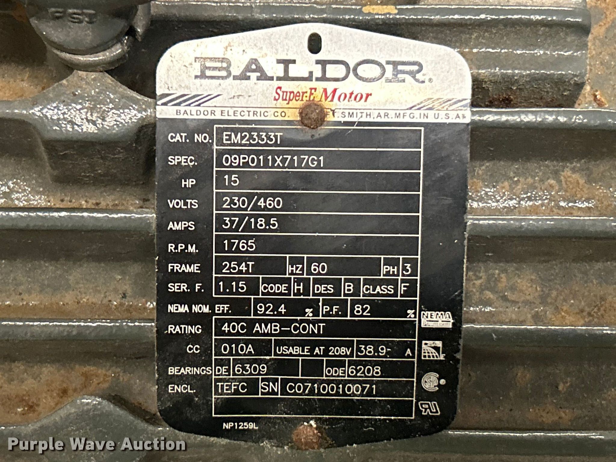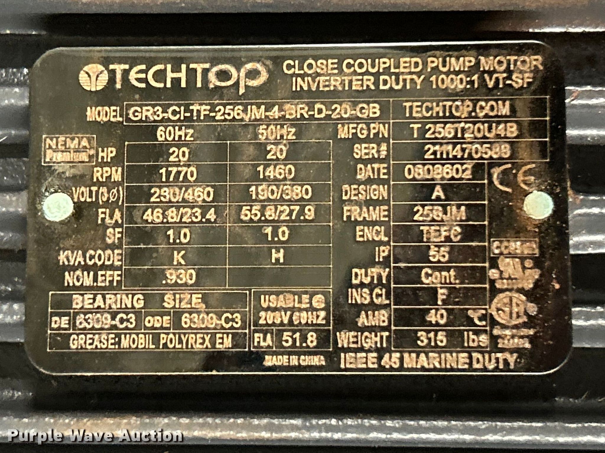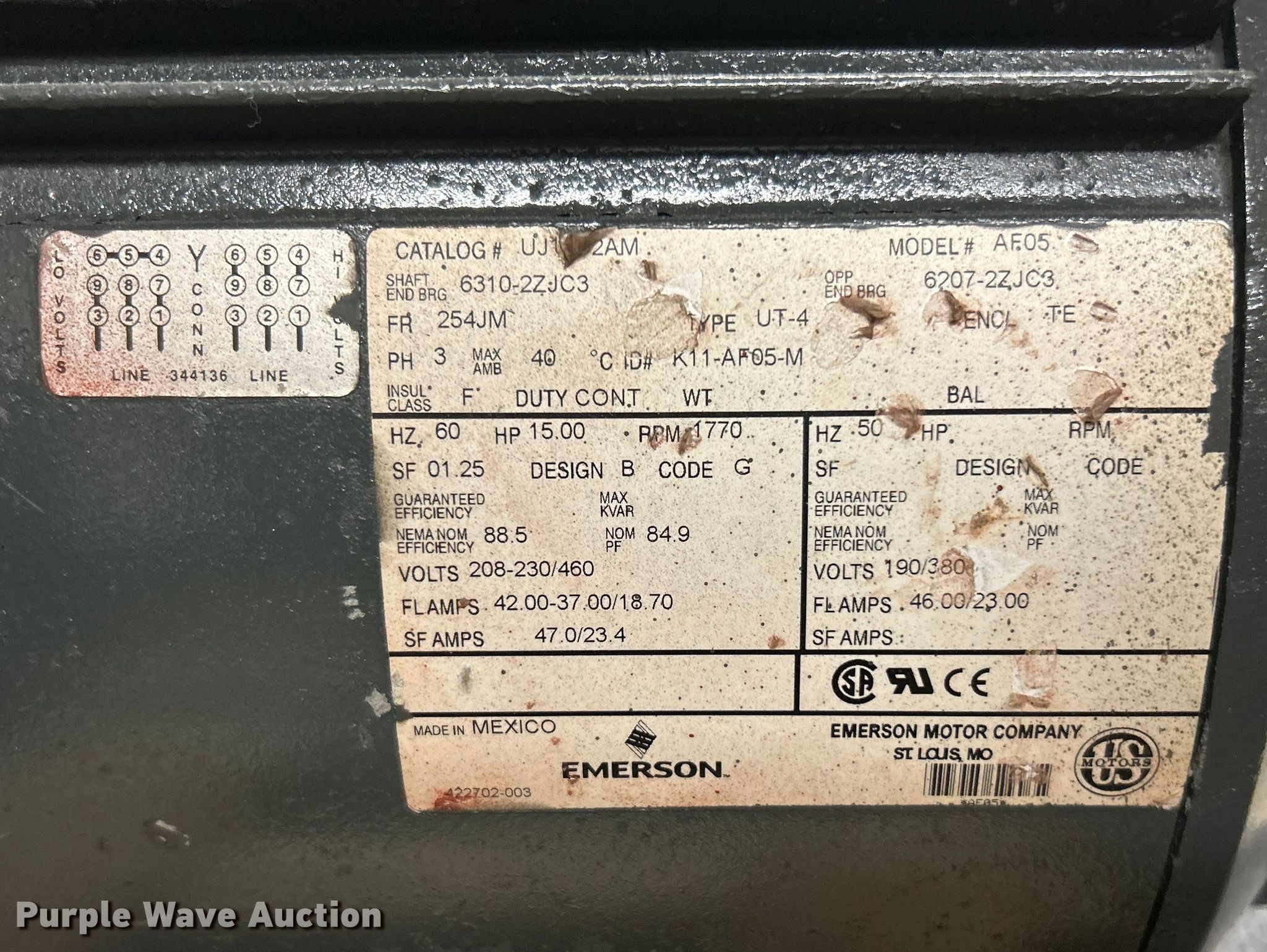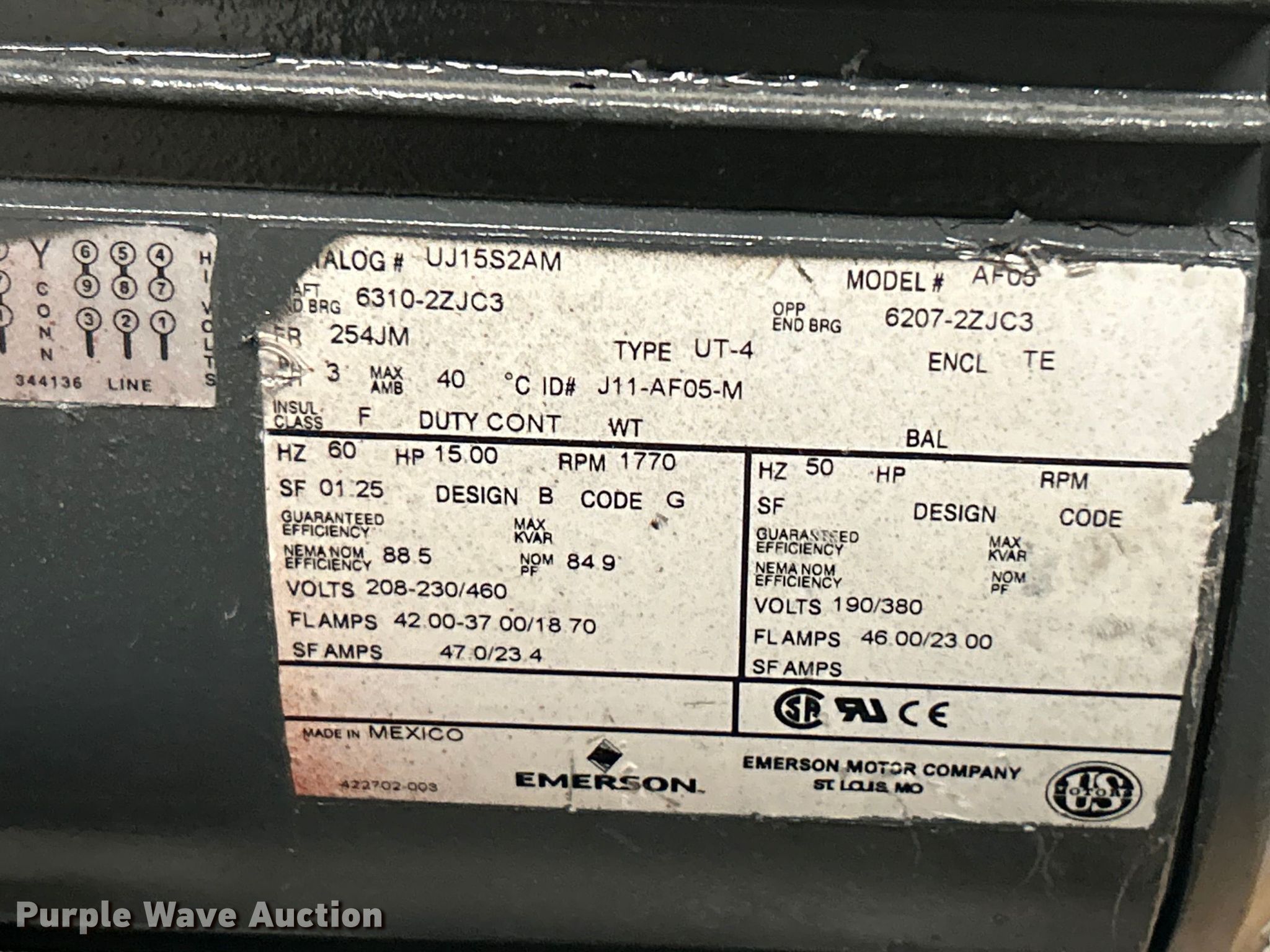 Purple Wave is selling a used Electric Motor in Missouri. This item is a (8) pool pump motors with the following: (2) Emerson AF05, Phase: Three, Hertz: 60, HP: 15, Volts: 208-230/460, Emerson B562, Phase: Three, Hertz: 60, HP: 30, Volts: 208-230/460, Emerson B558, Phase: Three, Hertz: 60, HP: 25, Volts: 208-230/460, Nidec FK55, Phase: Three, Hertz: 60, HP: 25, Volts: 208-230/460, Nidec FR59, Phase: Three, Hertz: 60, HP: 15, Volts: 208-230/460, TechTop GR3-CI-TF-256JM-4-BR-D-20-GB, Phase: Three, Hertz: 60, HP: 20, Volts: 230/460, Baldor EM2333T, Phase: Three, Hertz: 60, HP: 20, Volts: 230/460, Unknown operating conditions